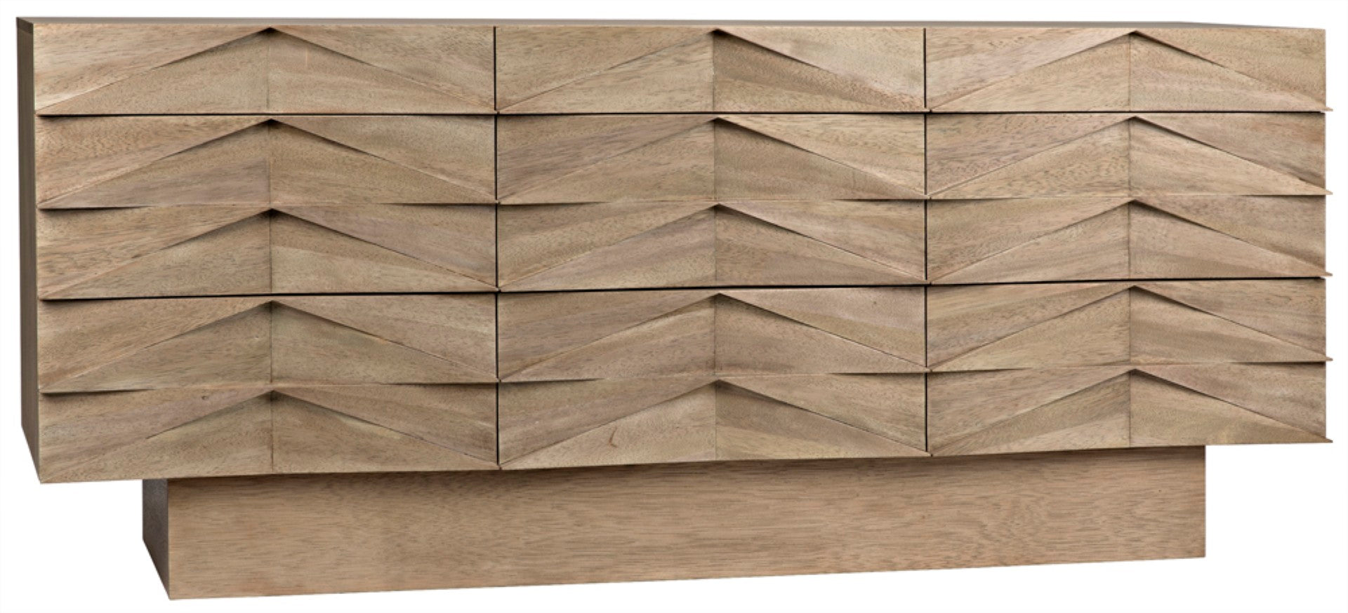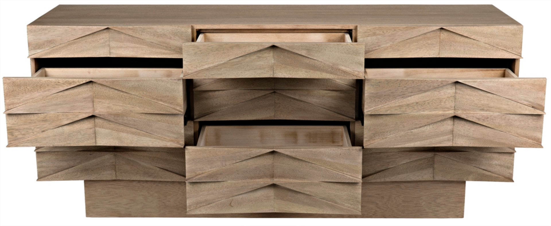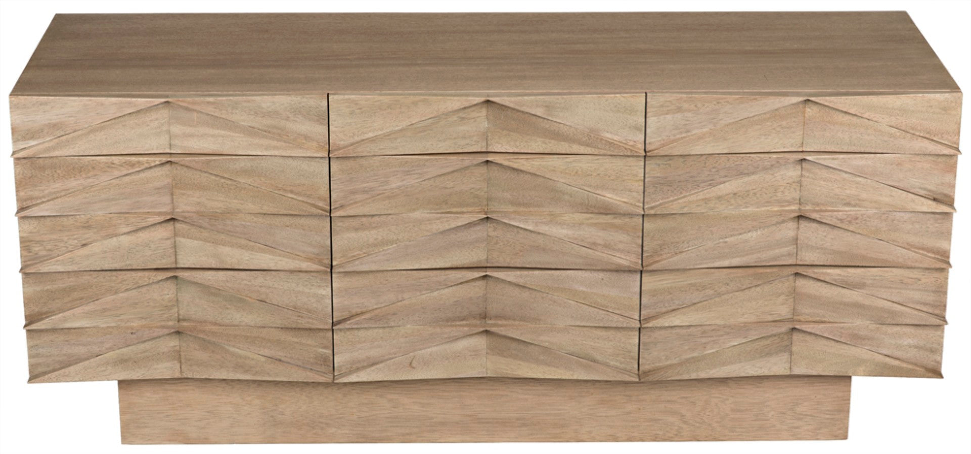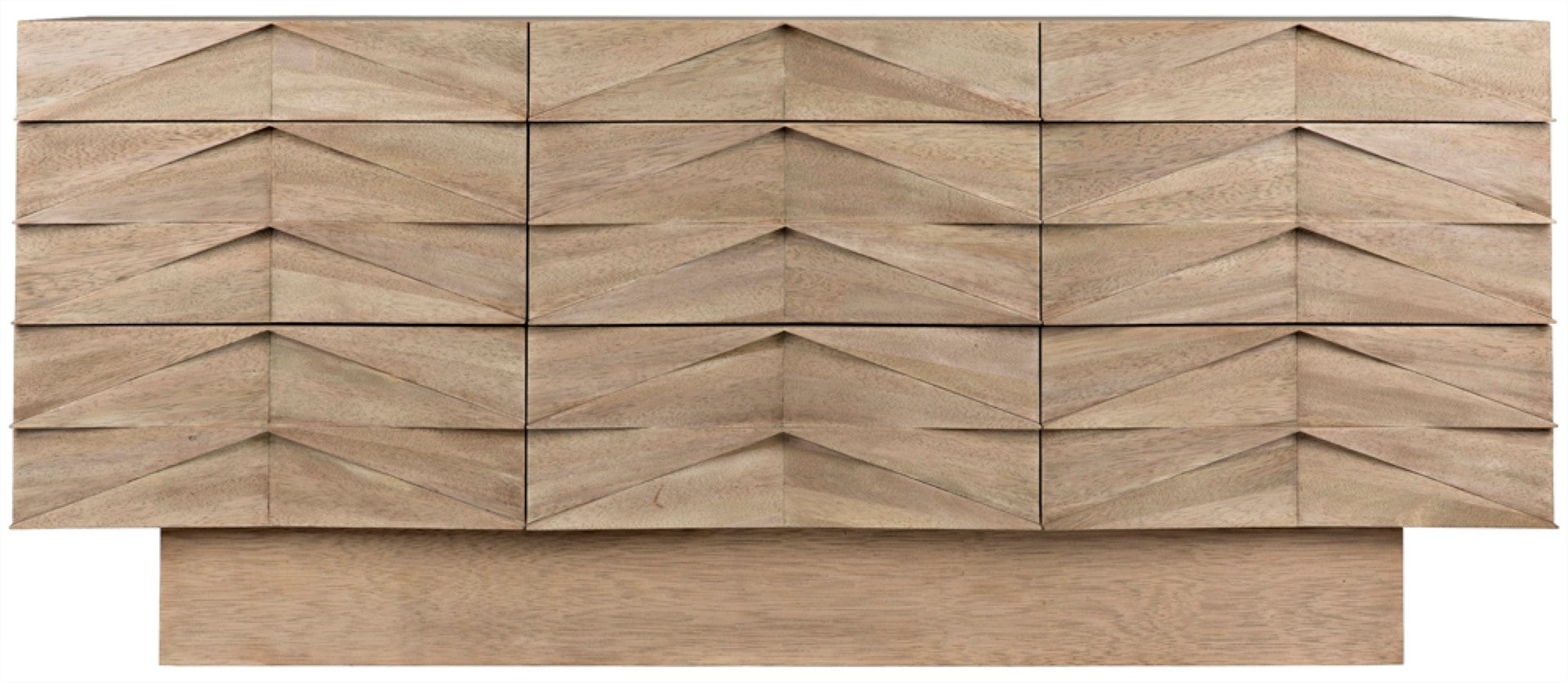 - Nine smooth-glide drawers with repeating hand-carved pattern for subtle, artisanal texture