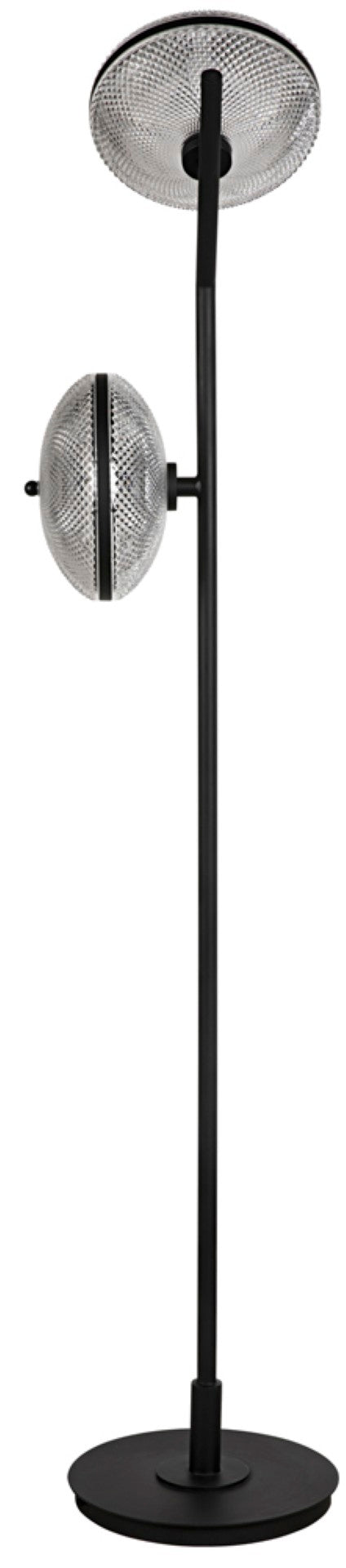 Bring modern industrial style and sculptural flair to your space with this Gibson floor lamp. Its angled matte-black iron base and two textured glass shades deliver focused, ambient light while serving as a striking décor piece—ideal for living rooms, offices, or contemporary bedrooms.