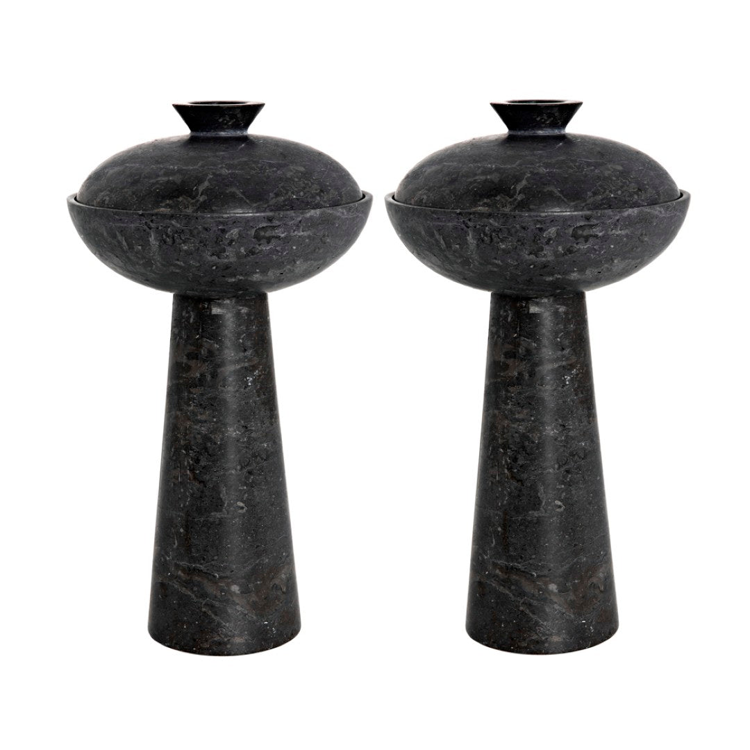 Elevate your decor with this refined set of two artisan-carved marble vessels that blend traditional Japanese lacquerware inspiration with a modern, sculptural silhouette. Each piece features a removable lid and a tall, tapered base that transforms a classic lidded bowl into a striking accent for mantels, consoles, or tabletops.