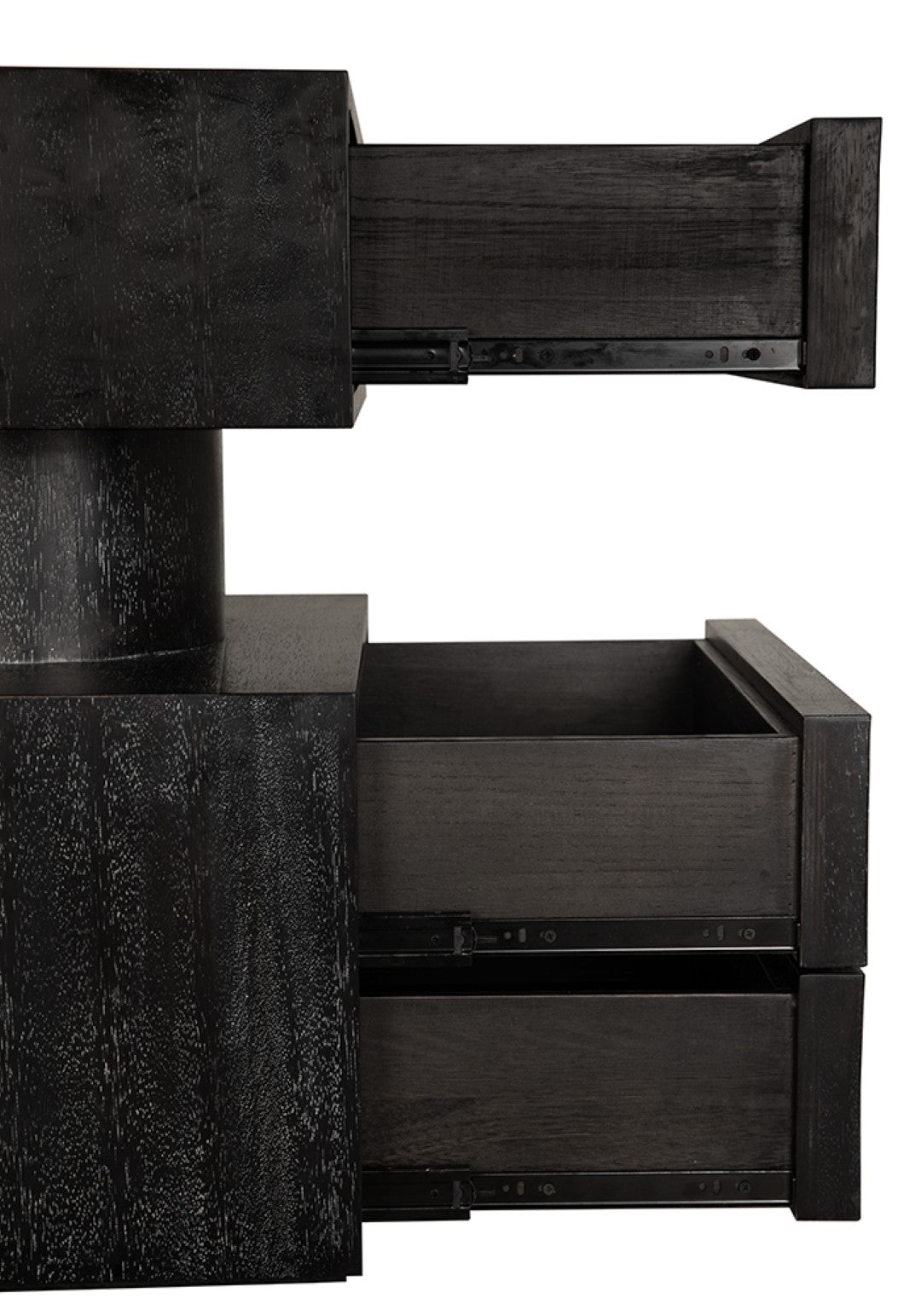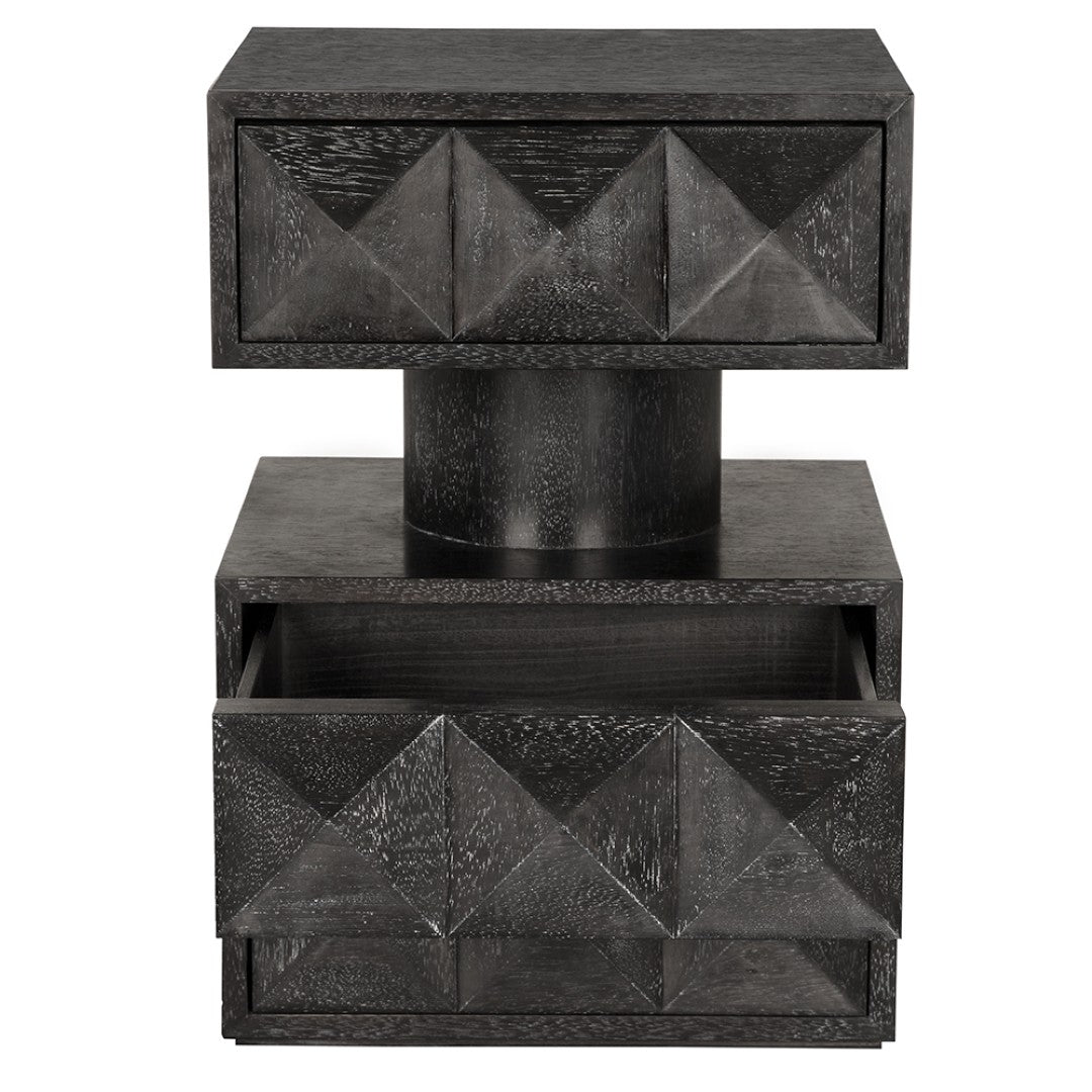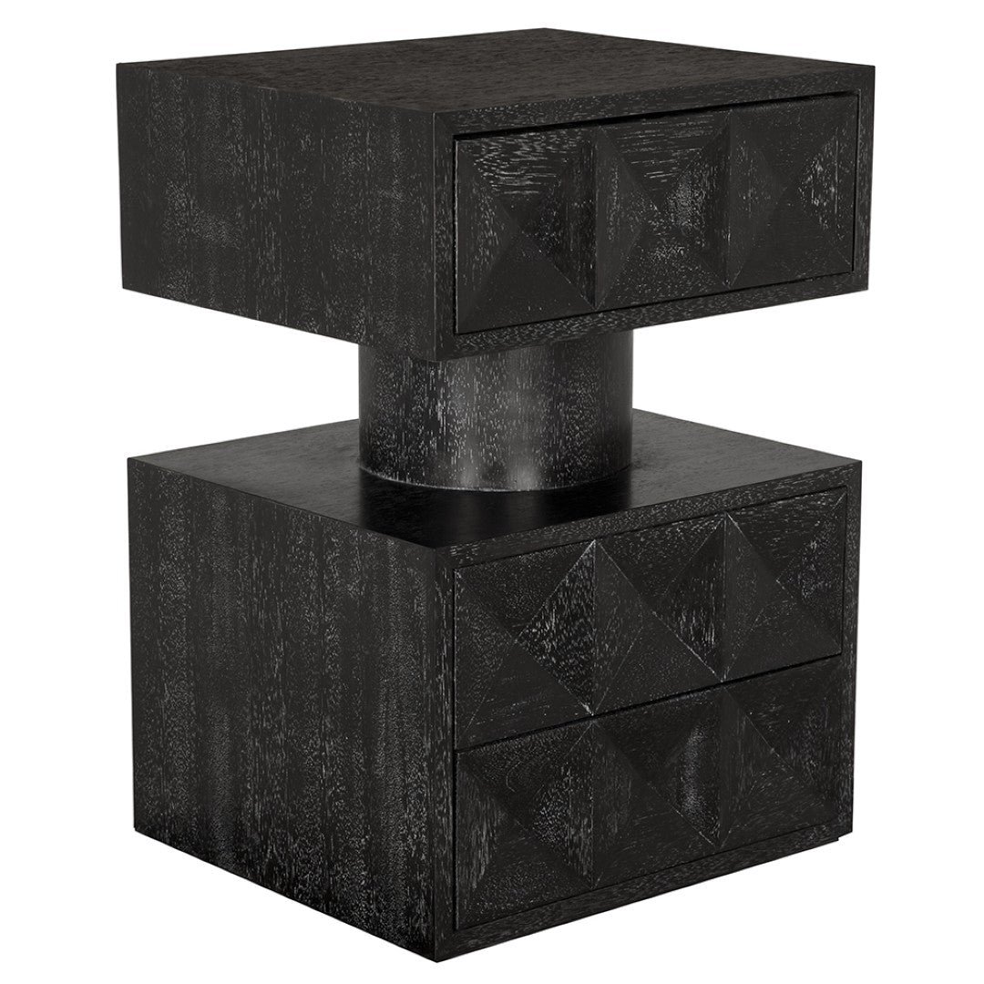 Elevate your living space with the Kingston Side Table — a modern accent piece that combines sculptural form with practical storage. Featuring geometric diamond-patterned drawer fronts and a sleek cylindrical center, this table brings tactile texture and visual depth in a rich Black Walnut finish. Ideal beside a sofa or bed, it offers curated storage without sacrificing style.