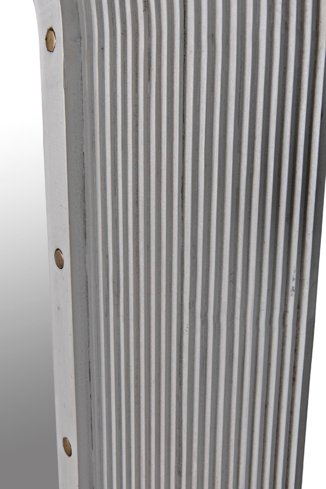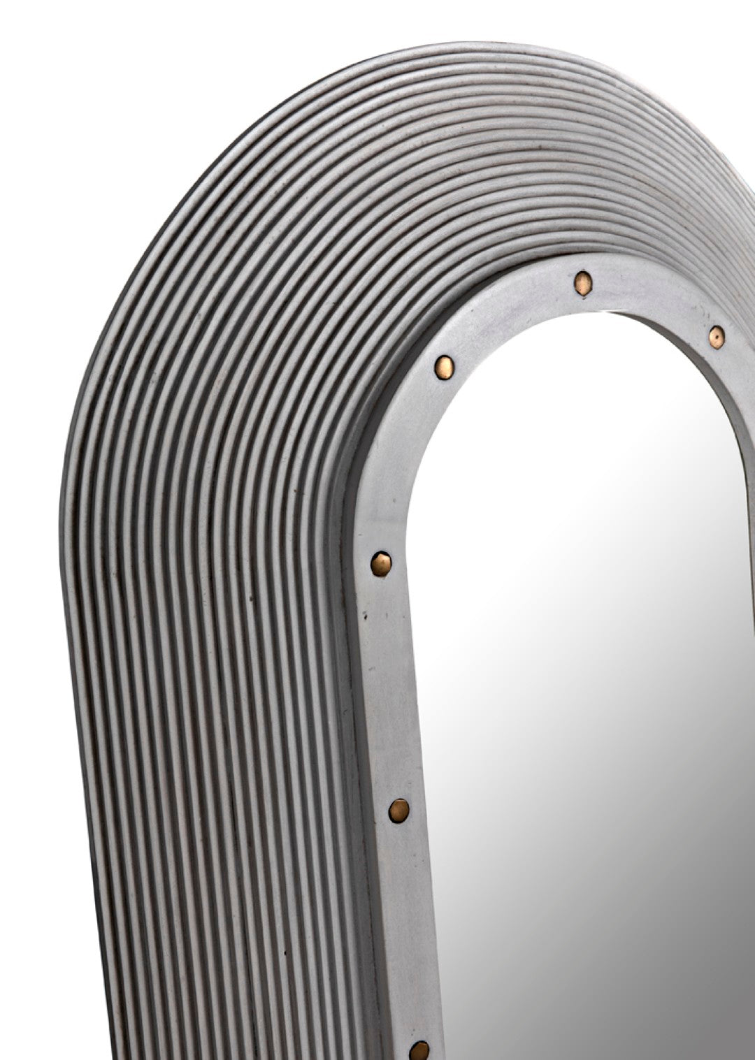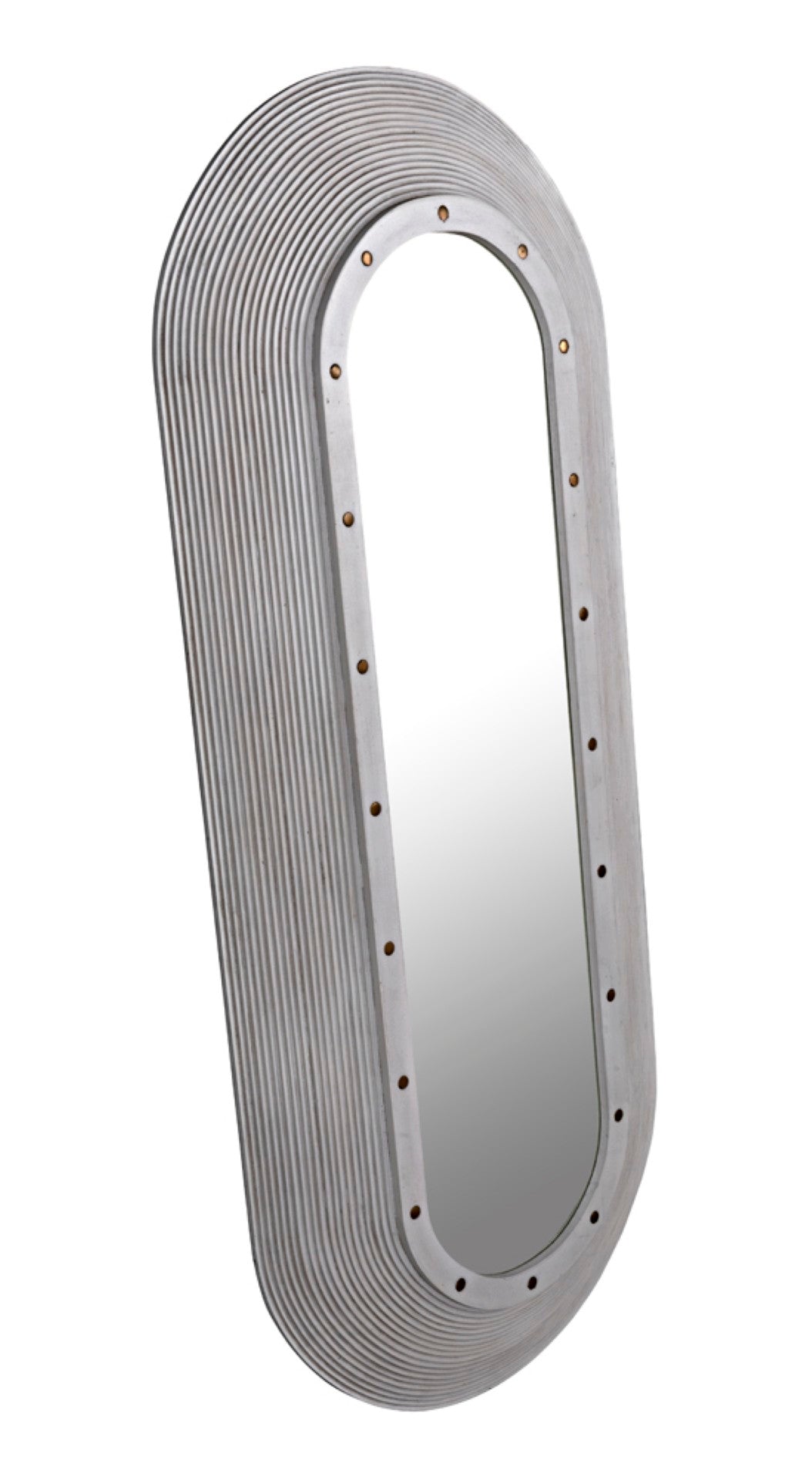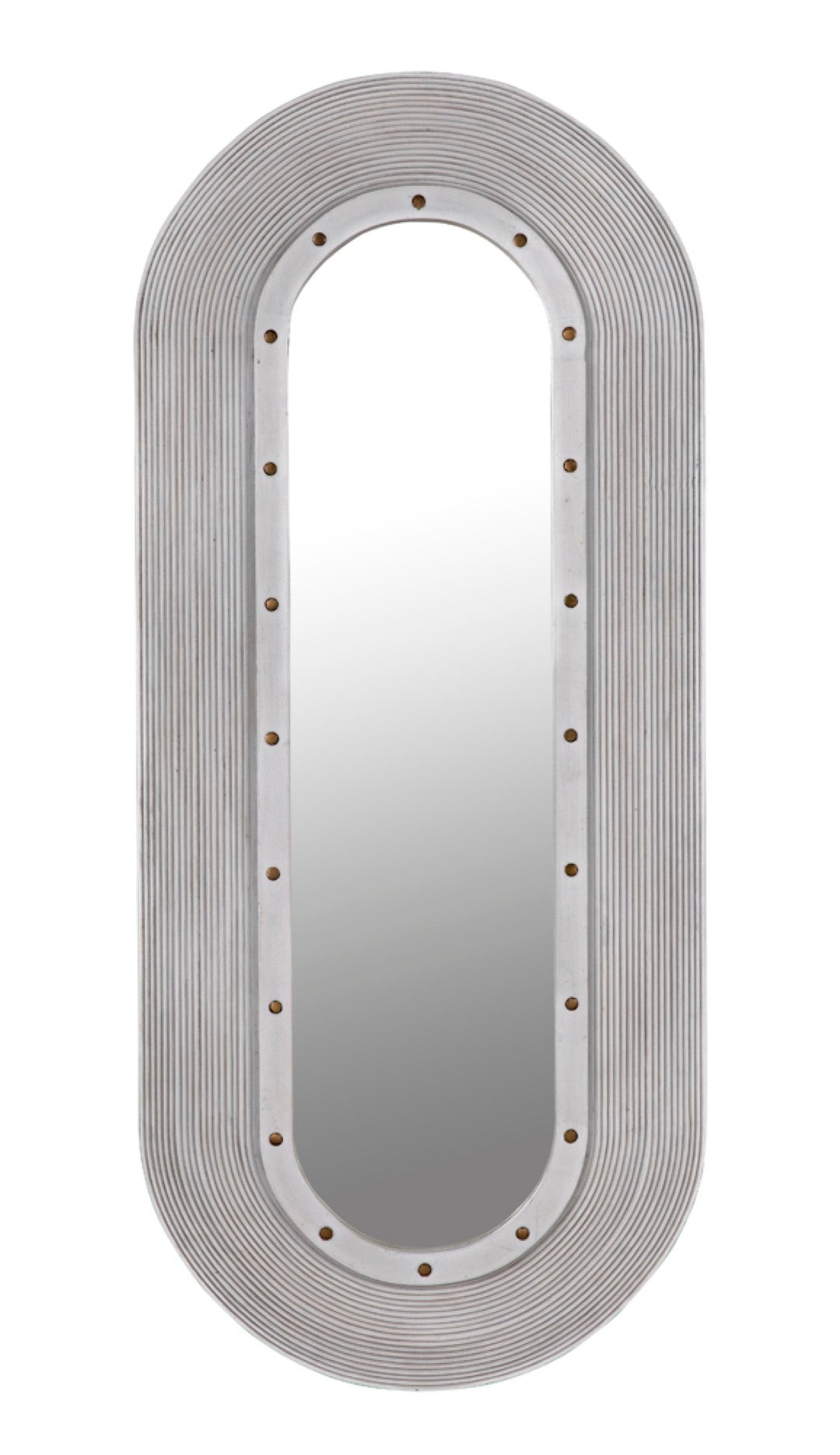 Elevate any room with the Luna Mirror — a full-length statement piece that blends coastal charm and industrial edge. Its racetrack-style mahogany frame features hand-carved groove rings and brass nailhead accents for tactile detail, while the white-wash finish softens the look to bring light and warmth into bedrooms, hallways, or entryways. Perfect for dressing, decorating, or enlarging visual space, this mirror combines craftsmanship and versatile style.