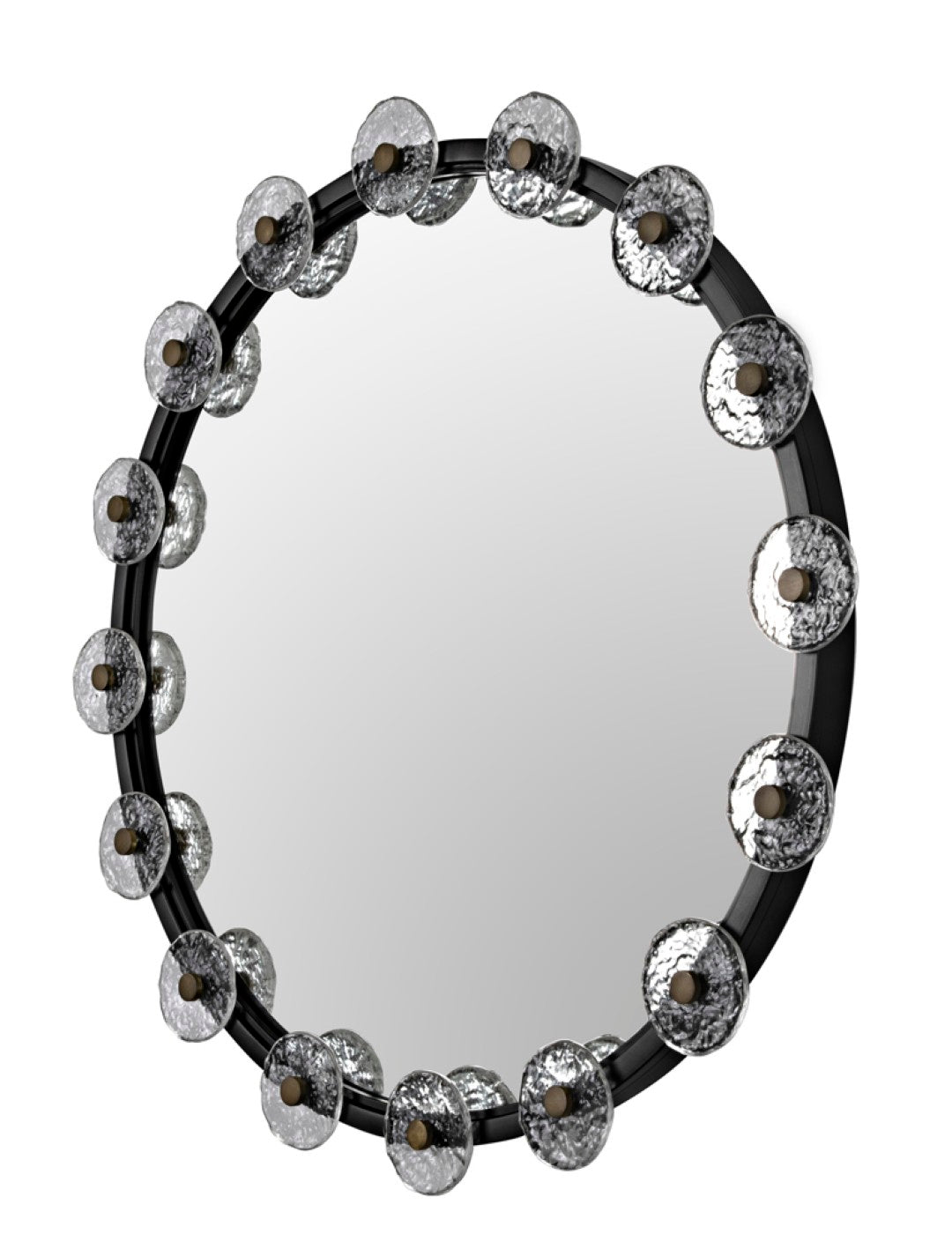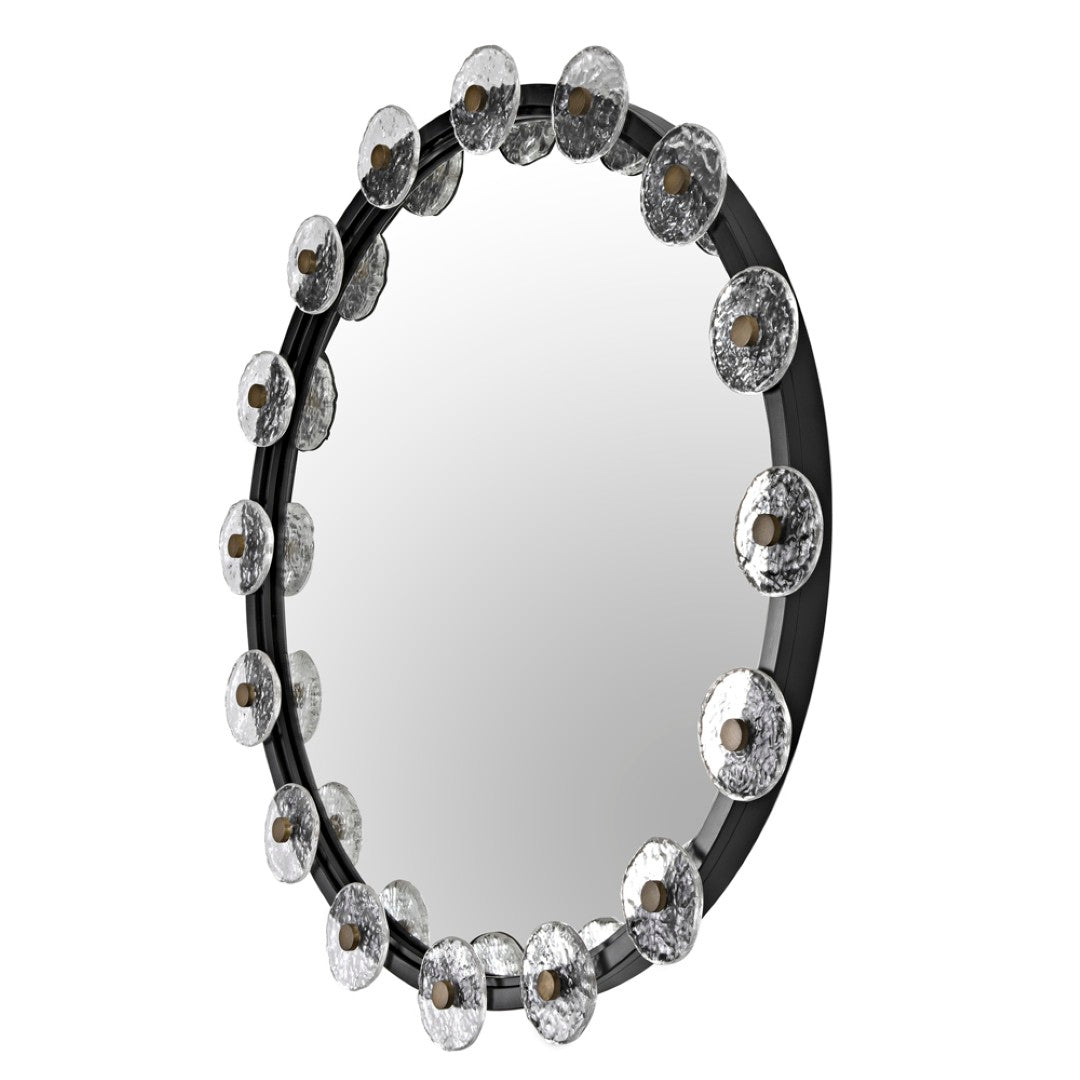 Bring bold, sculptural style to your space with this Moira mirror. Handcrafted from industrial steel with intricate dimensional carvings and a matte black finish, the circular design blends modern edge with refined craftsmanship. The reflective glass center and textured metal frame create striking contrast—perfect for entryways, living rooms, or any space needing a sophisticated focal point.