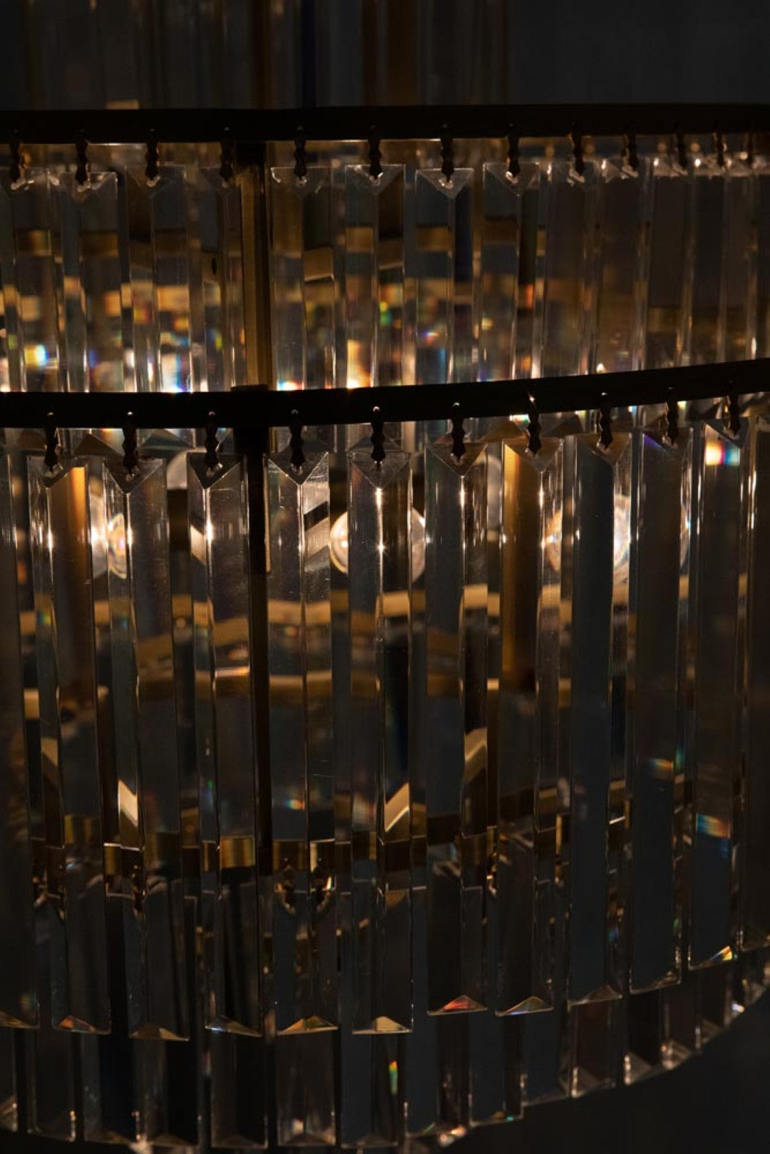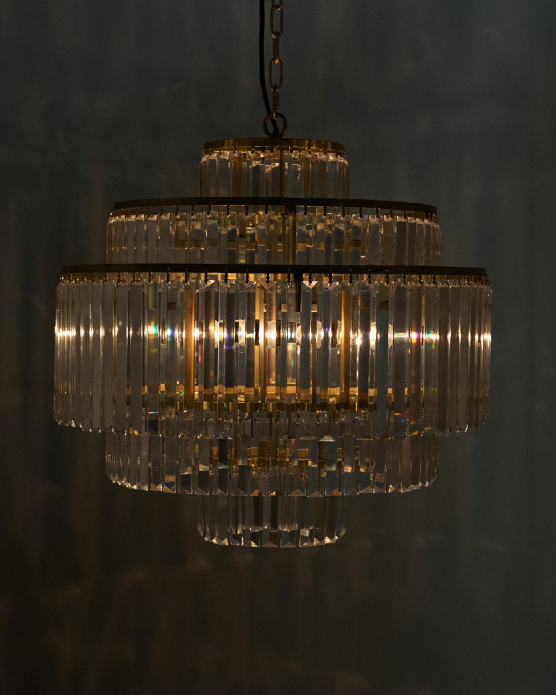 - Design: Classic chandelier silhouette updated with cascading glass drips around concentric metal bands