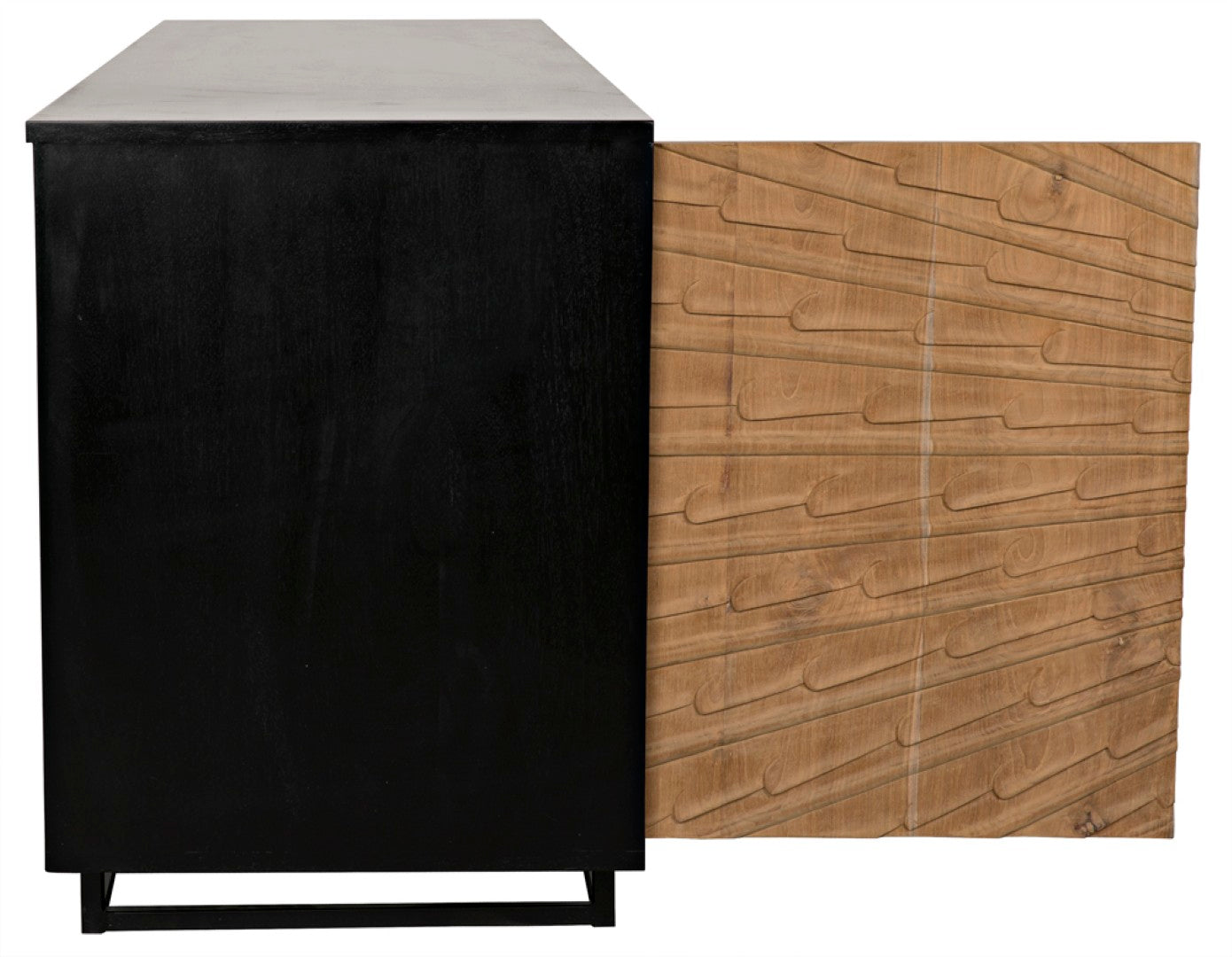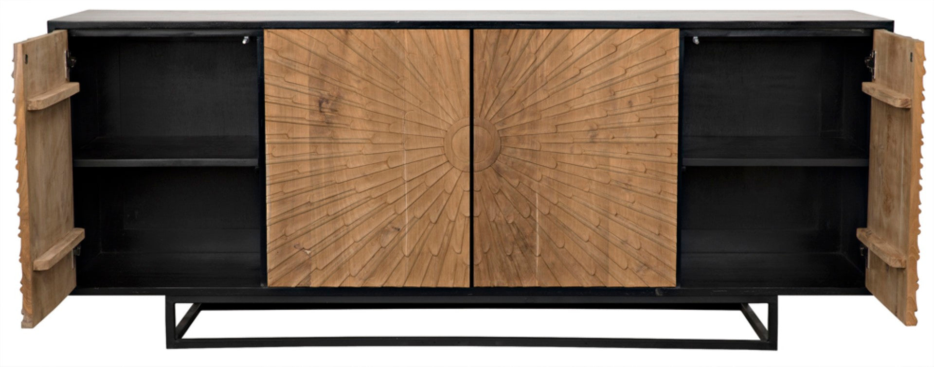Elevate your dining or living space with this hand-crafted mid-century modern sideboard, where timeless design meets functional storage. Expertly carved and finished, it showcases starburst door carvings and a refined contrast of teak and mahogany that highlights natural grain while offering generous interior organization for tableware, linens, and more.