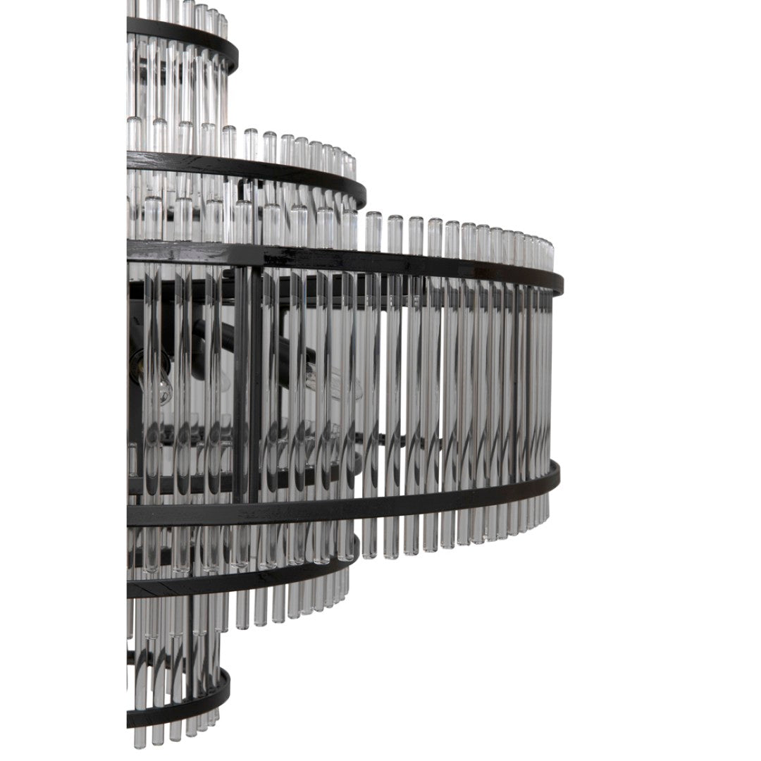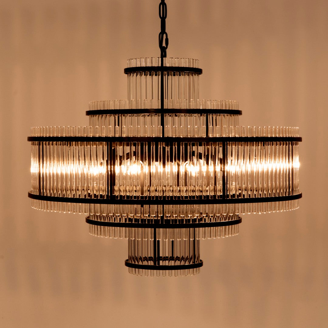 Bring industrial strength and refined elegance to your room with the Rowan Chandelier. Its matte black iron frame and sleek glass shades cast a warm, inviting glow while the clean lines and robust construction make it a lasting focal point for dining rooms, entryways, or living spaces.