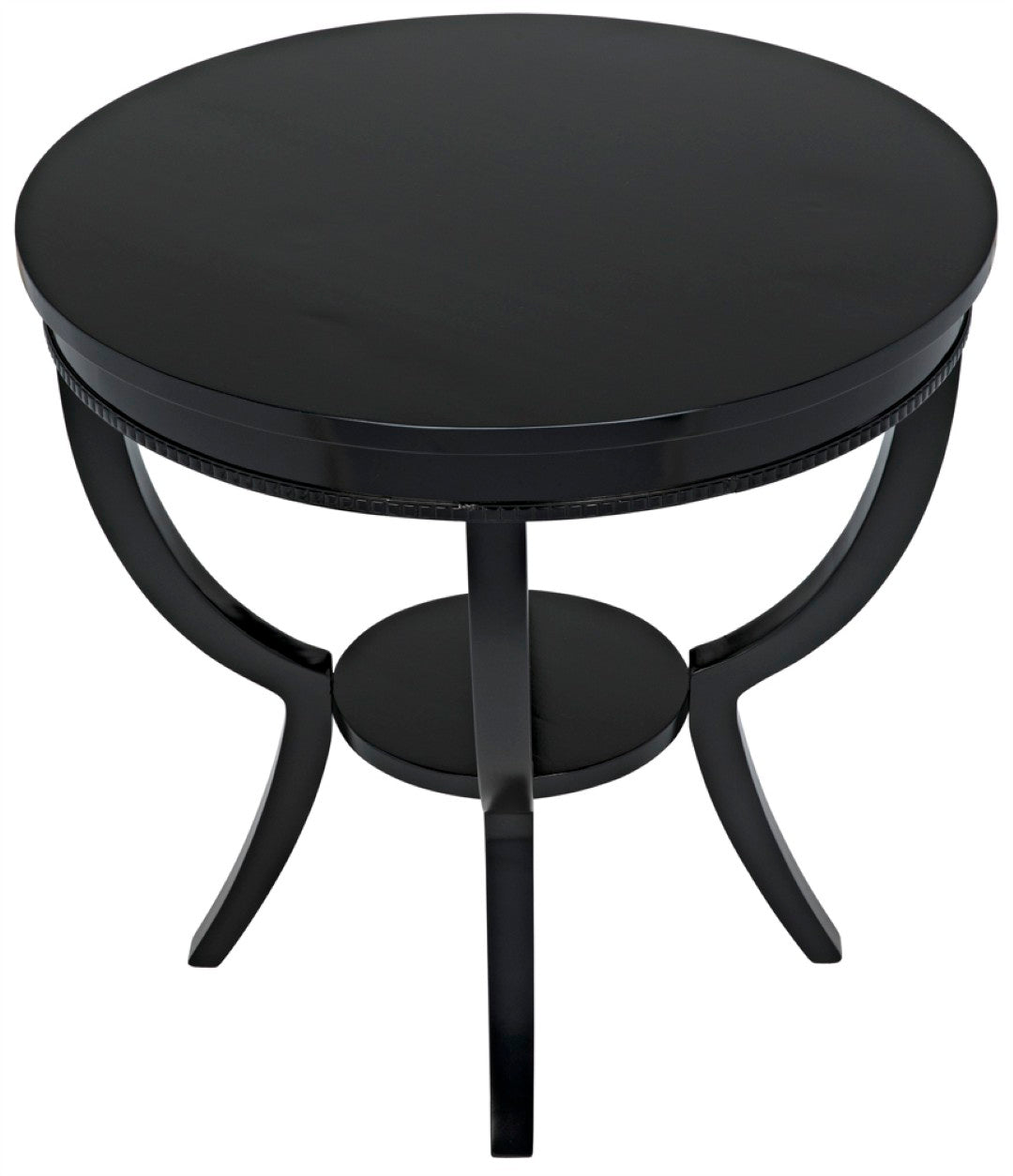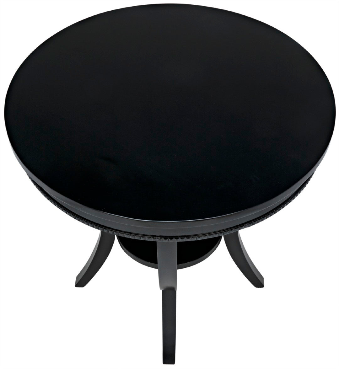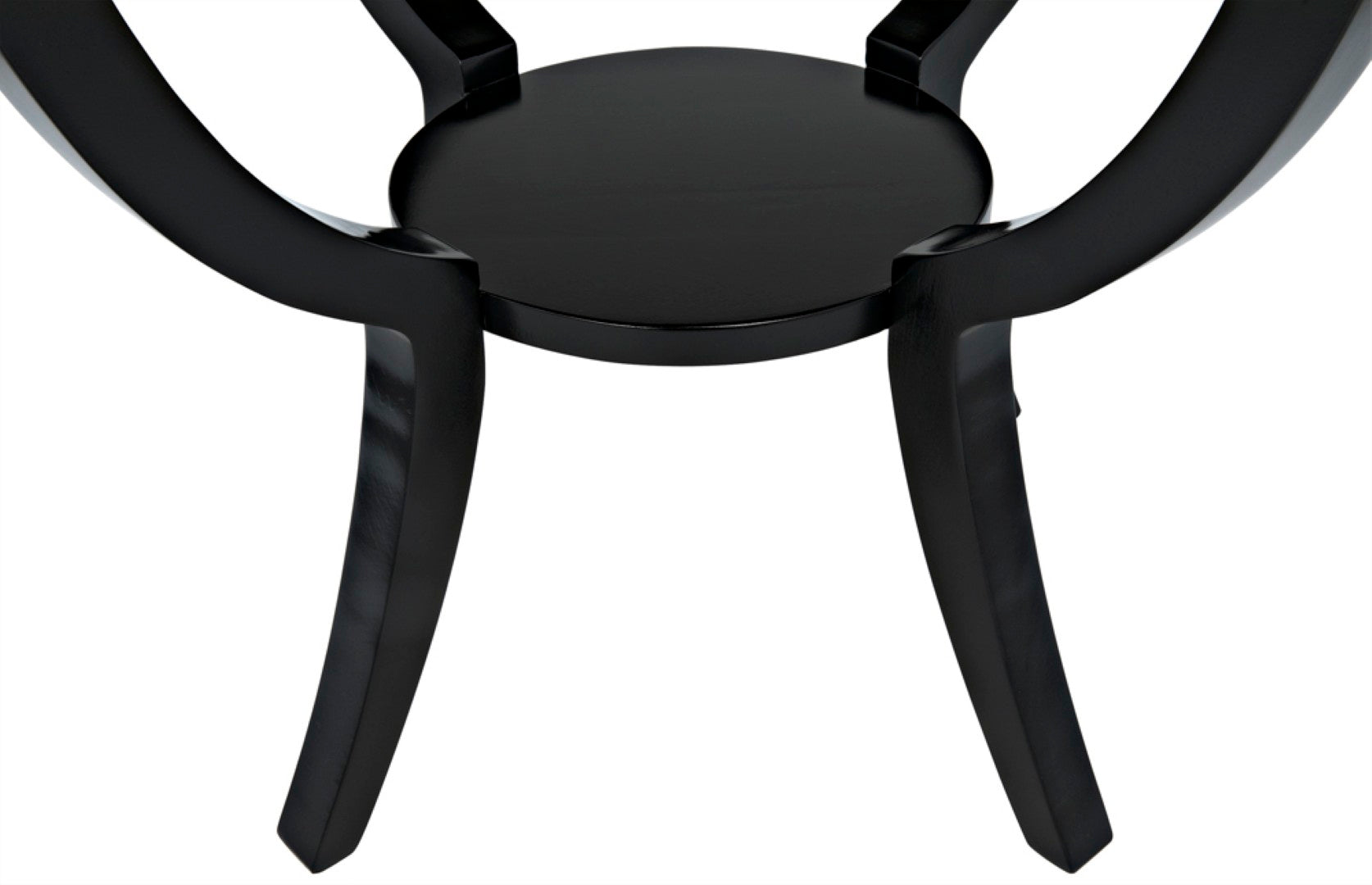 Add timeless elegance to your living space with this expertly crafted round end table. Its graceful curves, solid birch construction, and subtly hand-carved top combine traditional craftsmanship with a clean, versatile silhouette that complements both modern and classic interiors. The matte black finish is hand-applied and gently distressed for character, making this piece a refined focal point beside sofas, beds, or in entryways.