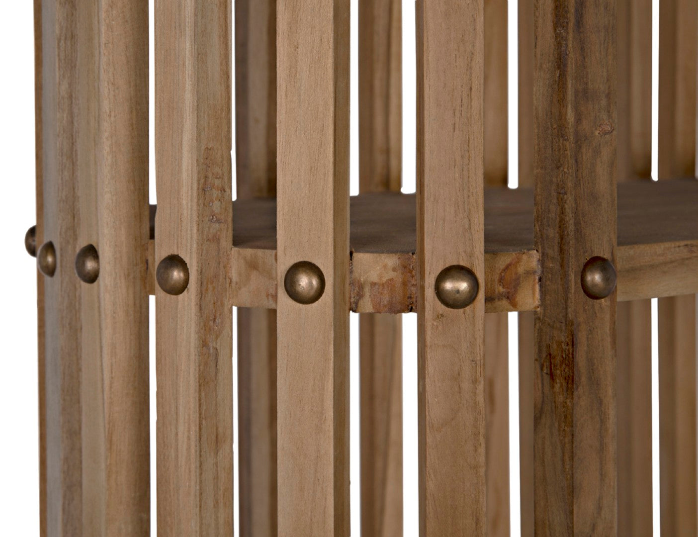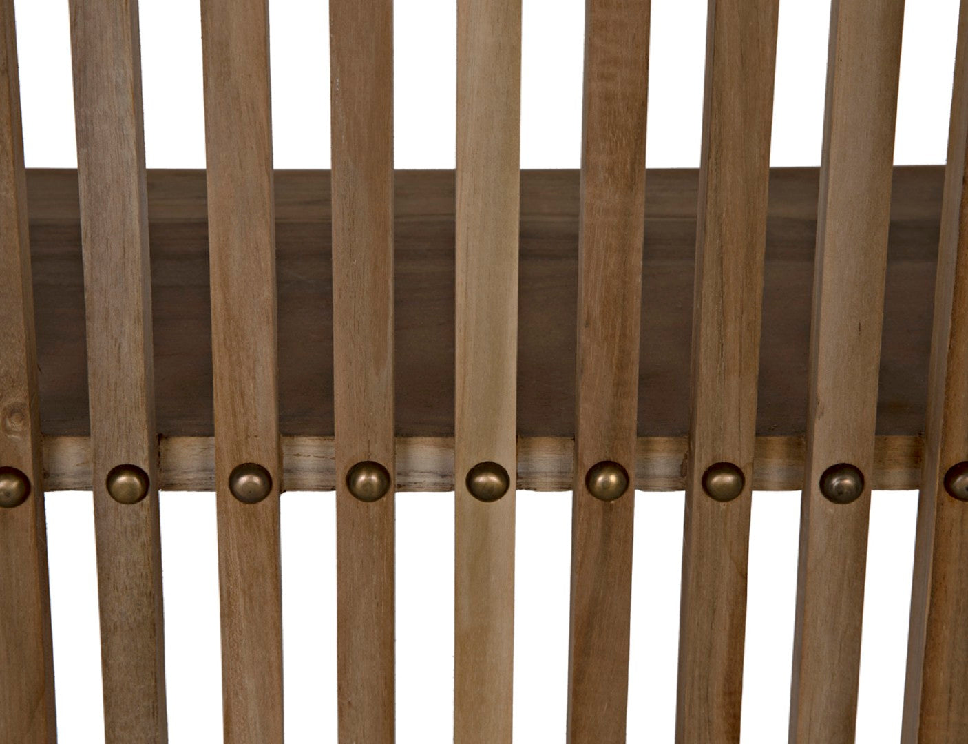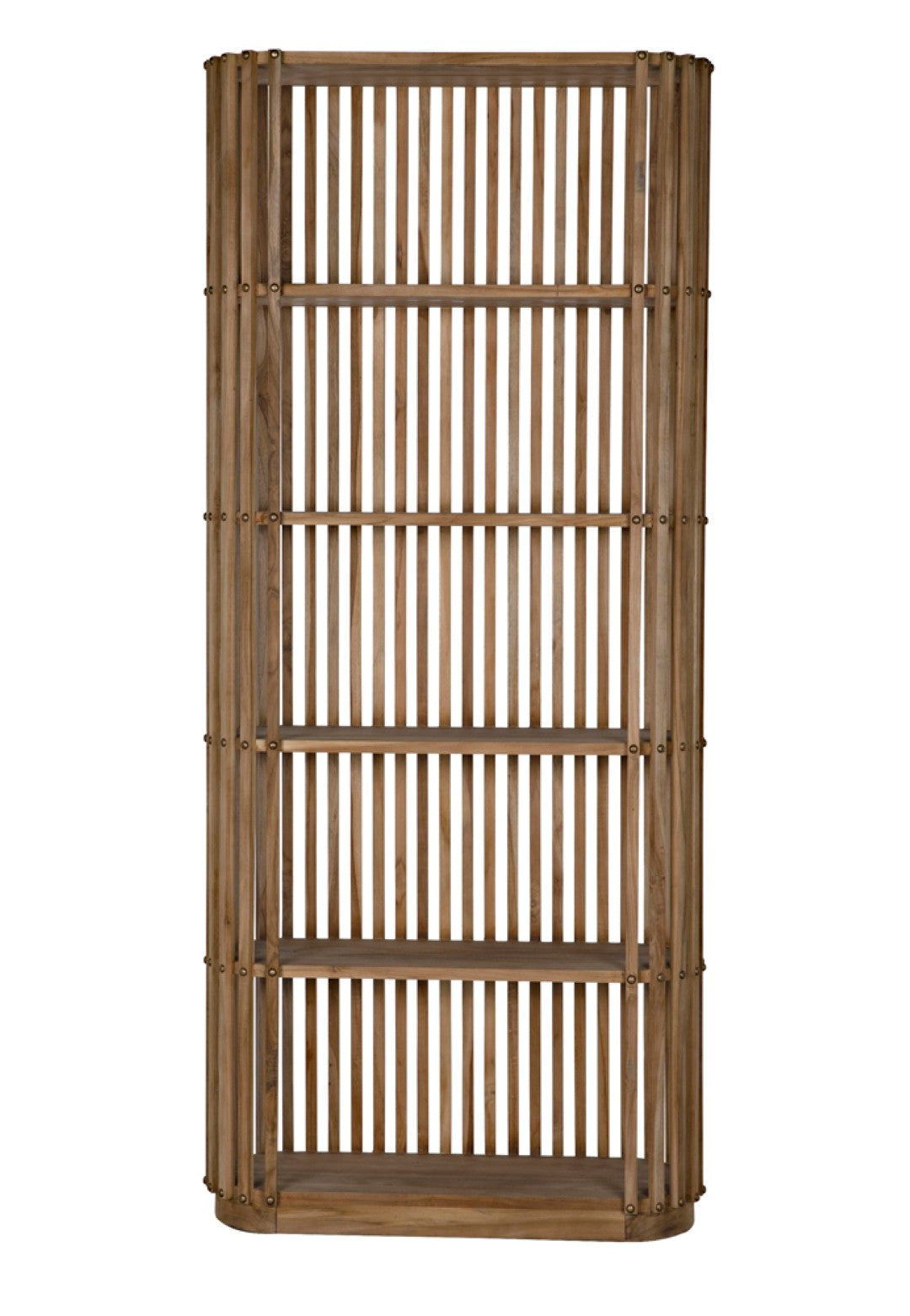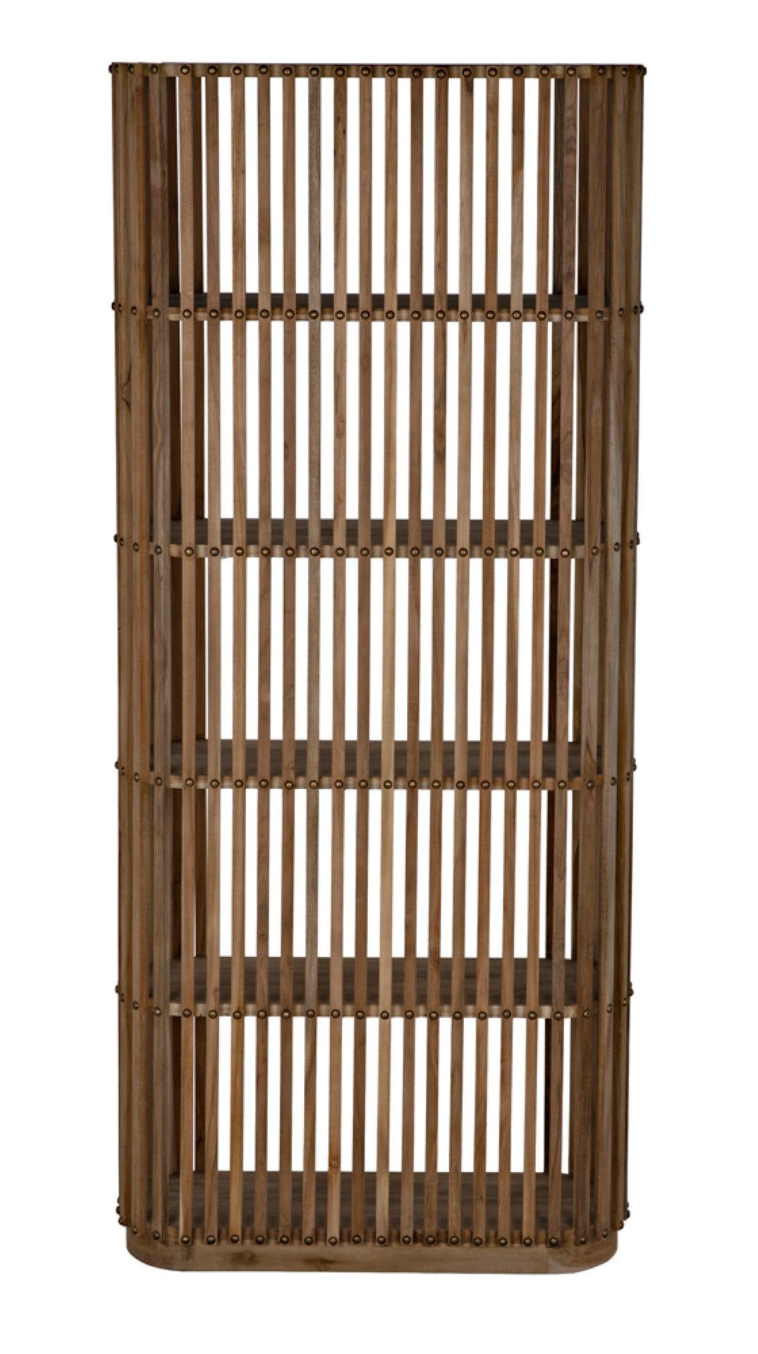 An elegant blend of artisanal craftsmanship and timeless materials, this Small Opal Bookcase brings warmth and sculptural presence to any room. Hand-finished teak and veneer showcase rich natural grain and subtle tonal variation, while brass nailhead accents add refined detail. Designed for both display and storage, its tall, narrow profile makes it ideal for entryways, living rooms, or compact spaces that need vertical organization without sacrificing style.