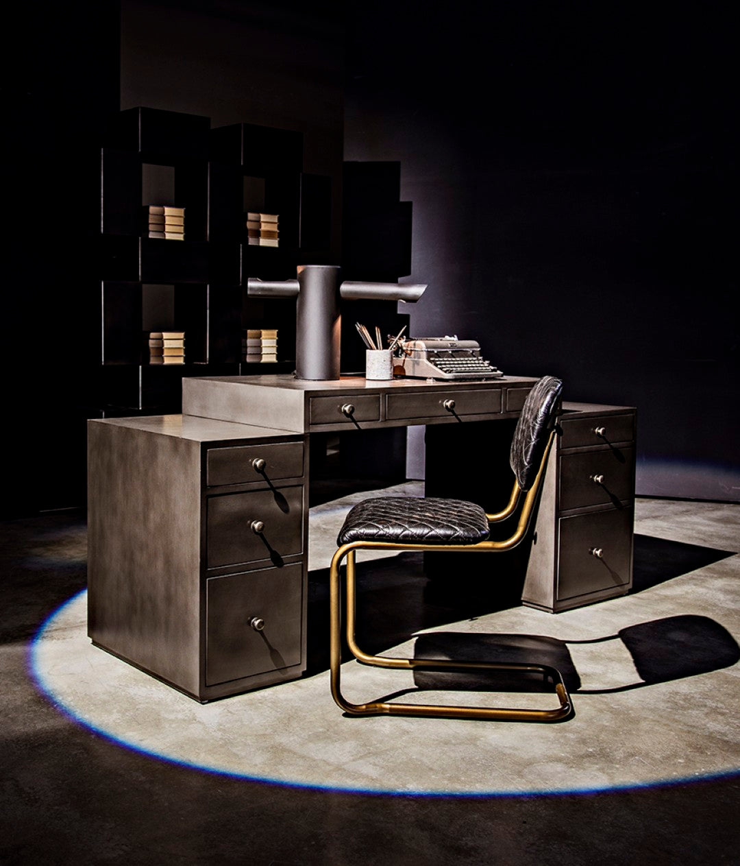 Intriguing and sculptural, this Statera table lamp brings a bold, contemporary statement to living rooms, bedrooms, or office spaces. Handcrafted from iron with a matte black finish, its streamlined silhouette and strong presence balance form and function—providing focused illumination while serving as an artful accent piece.