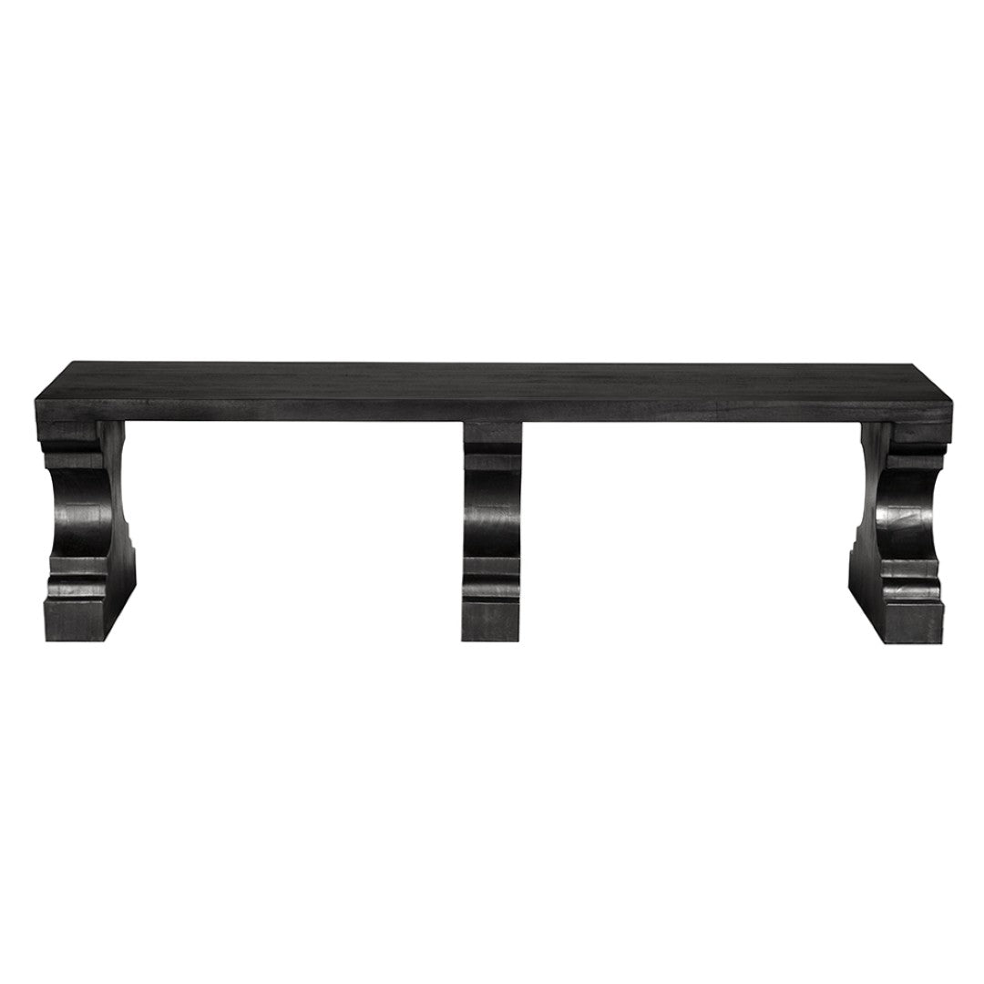 Elevate your entryway, dining area, or hallway with this striking long bench that blends classical architectural motifs and modern minimalism. Its sculptural pedestal legs and hand-rubbed Burnt Black finish create a refined focal point that complements transitional and contemporary interiors while offering sturdy, comfortable seating.