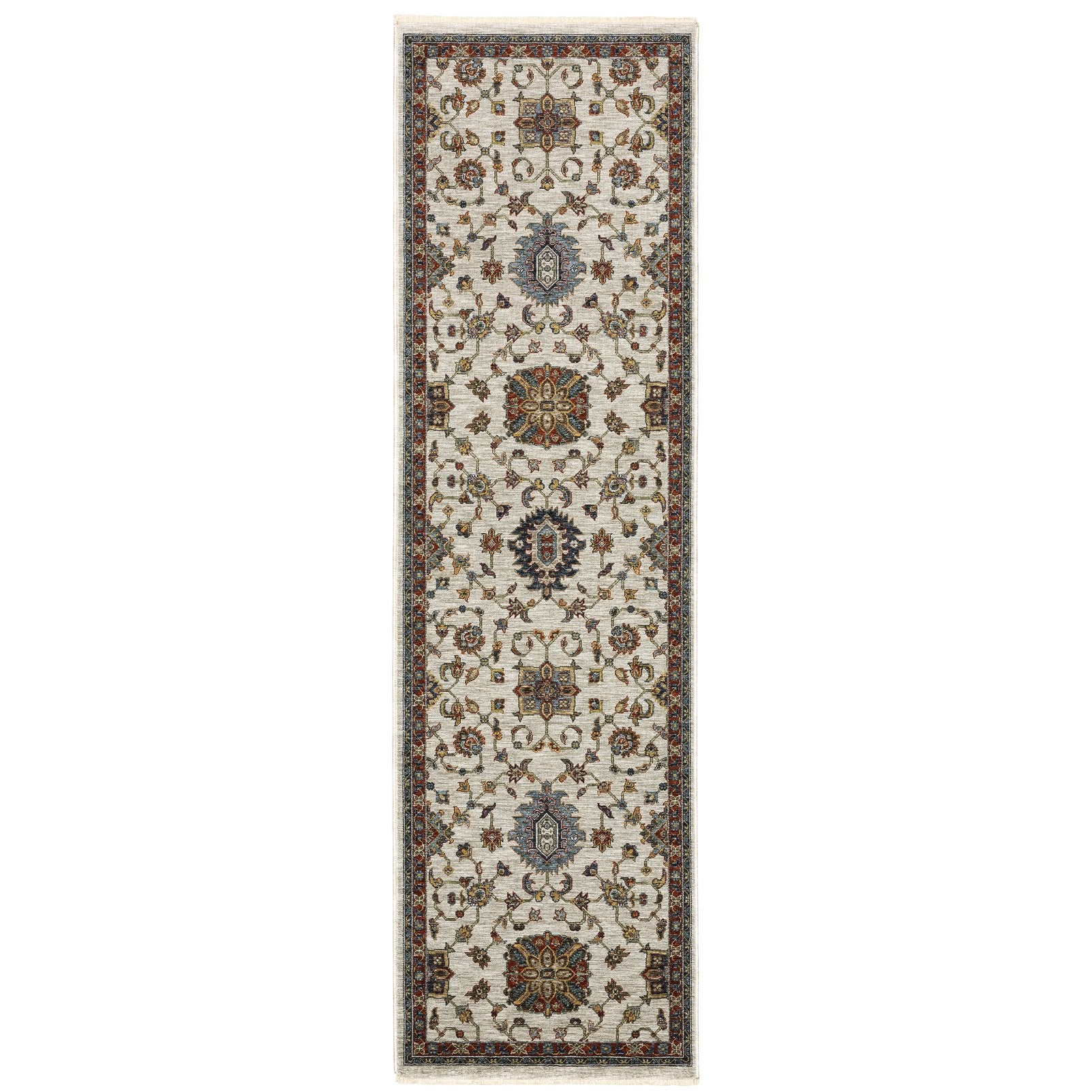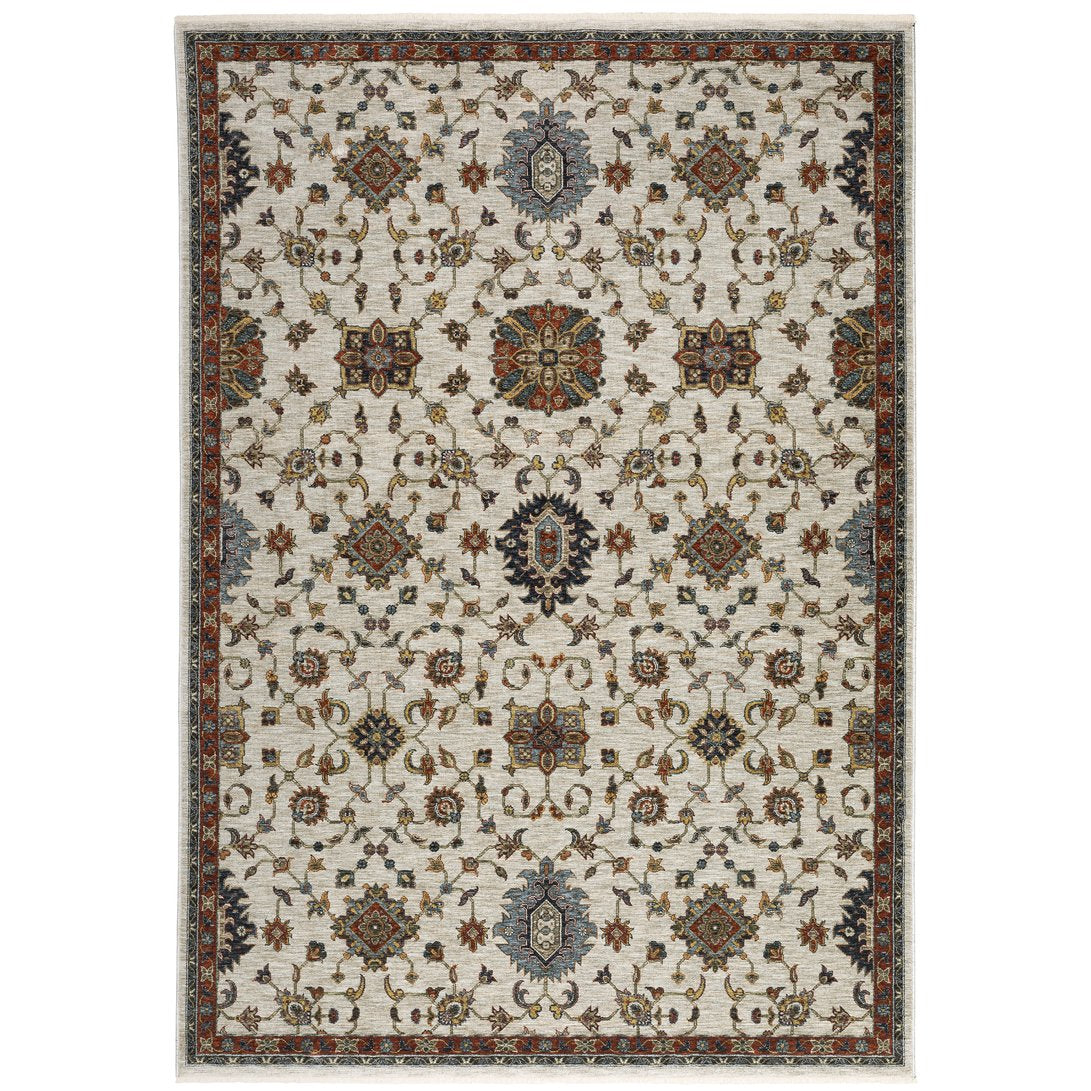 - Features a mottled ivory and gray background with, rust red, shades of blue and gold