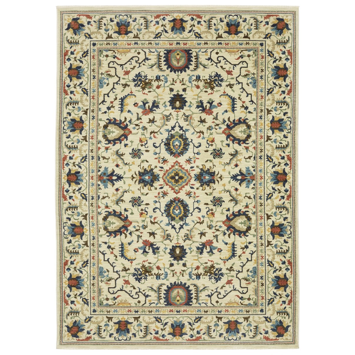 - Rug colors include shades of ivory, blues, rust, gold, green, brown