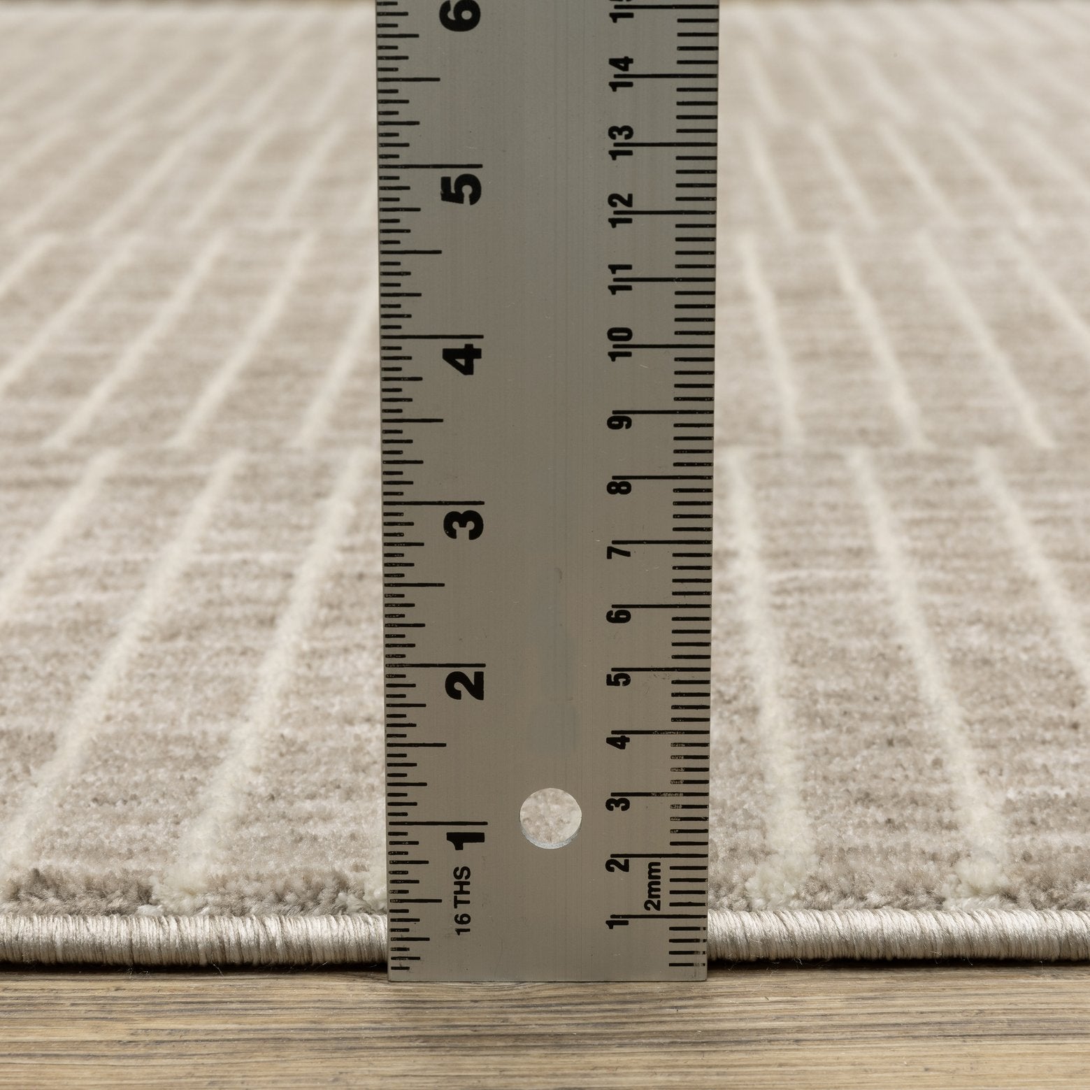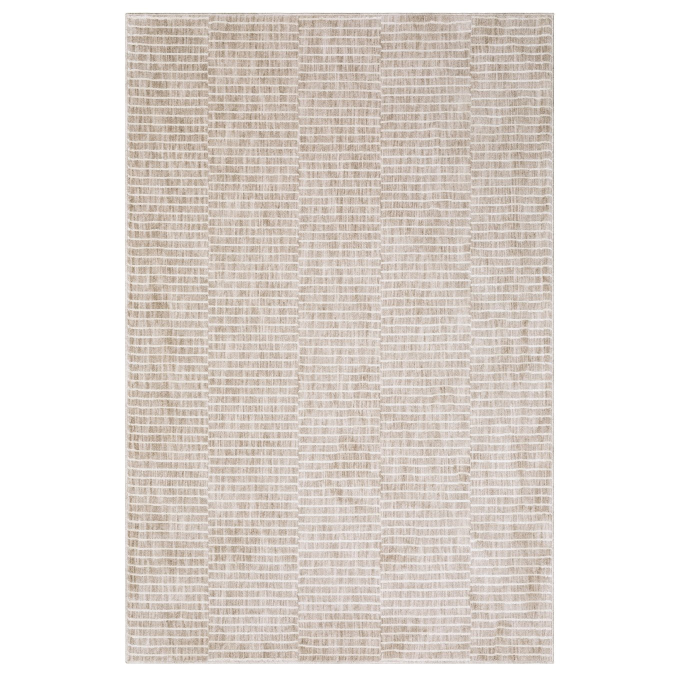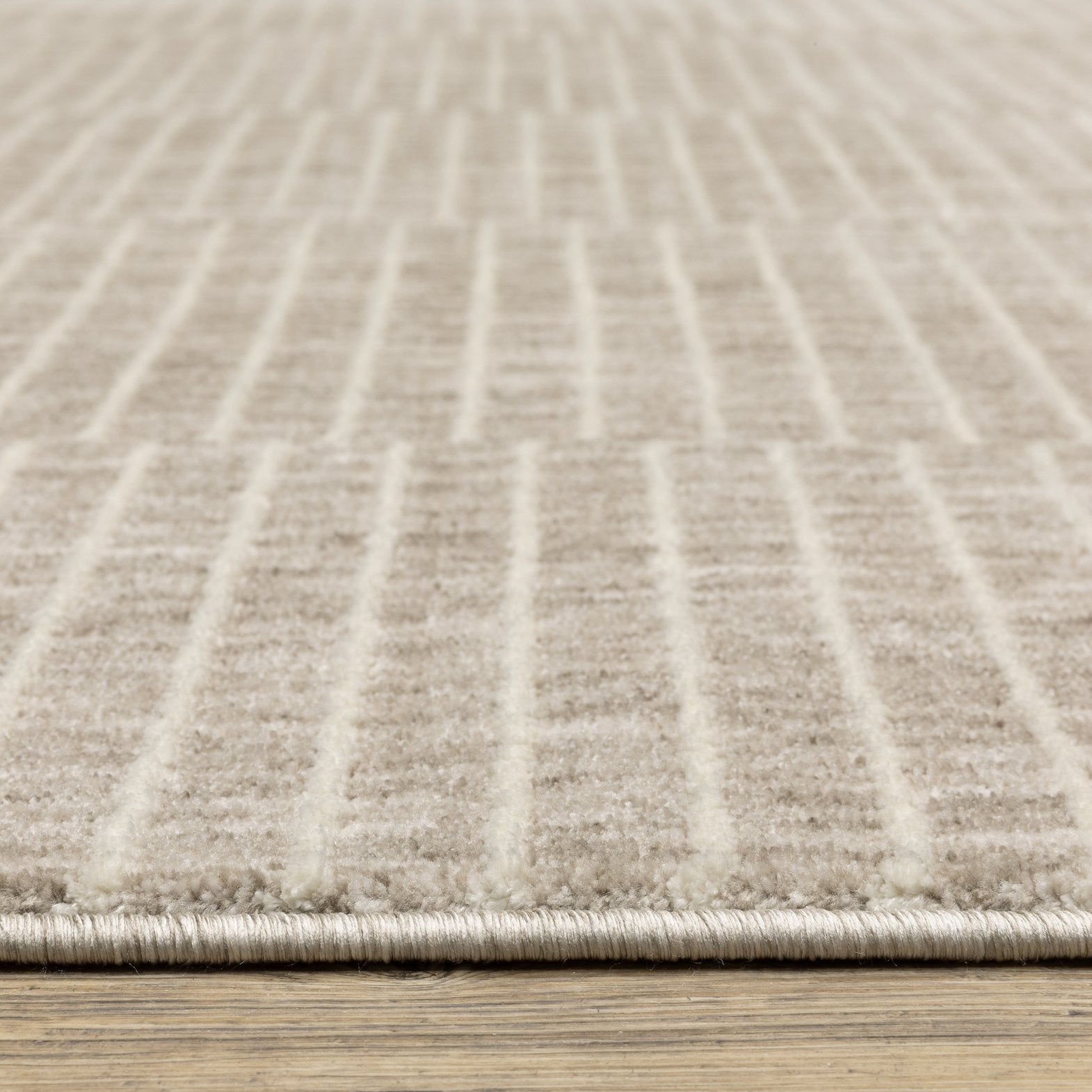 - Design & Texture: High-low texture and distressed grid pattern — beige and tan dashes with cream and grey accents for layered visual interest