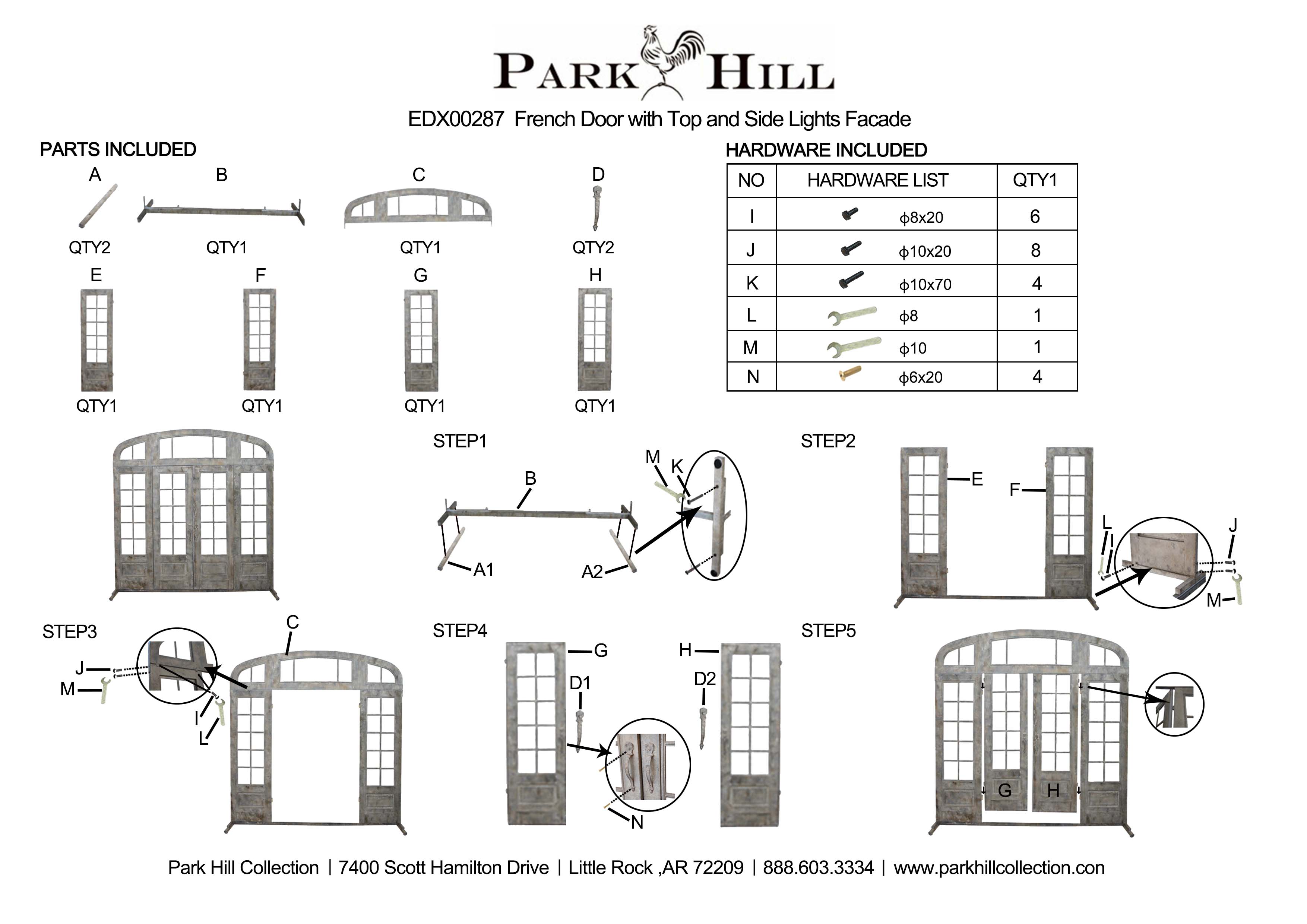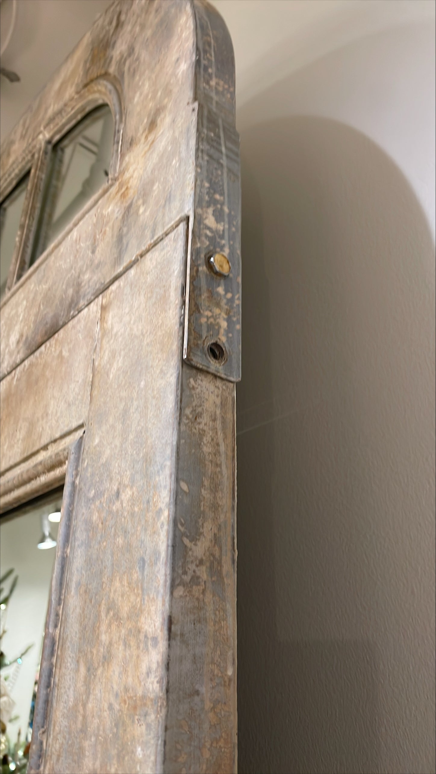 As though it were salvaged from a French chateau, this metal facade features a hinged double door with side window pane panels with top transom and is finished in a weathered aged patina. Simply stunning!