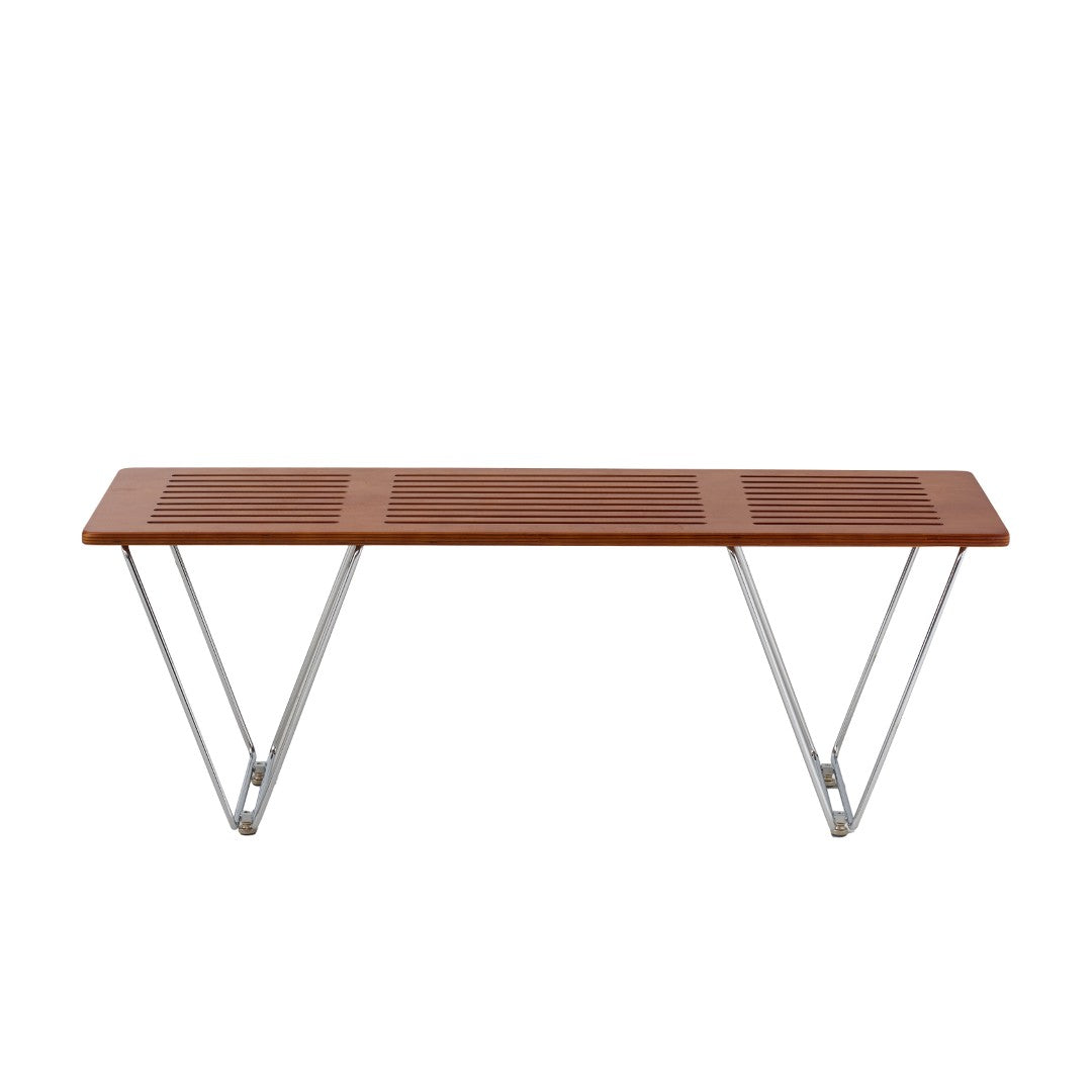 - ? Modern Minimalist Design: Clean lines with a sleek brown top and chrome-finished metal legs make this bench perfect for contemporary entryways, bedrooms, or dining spaces.
