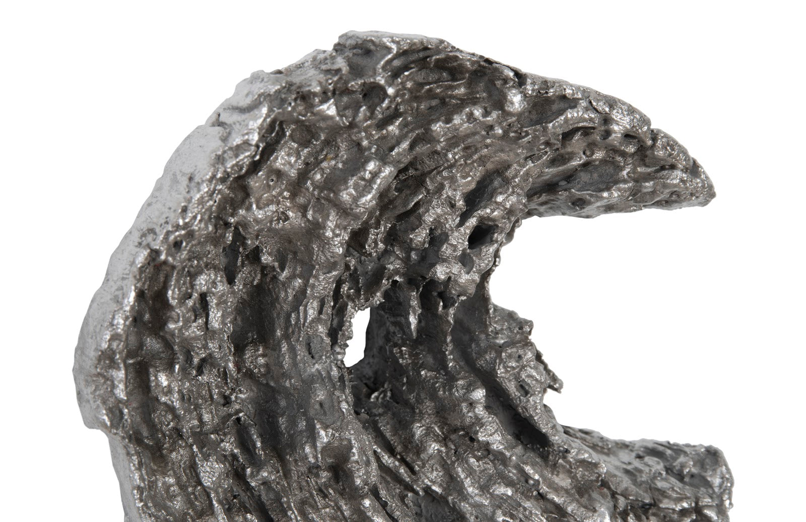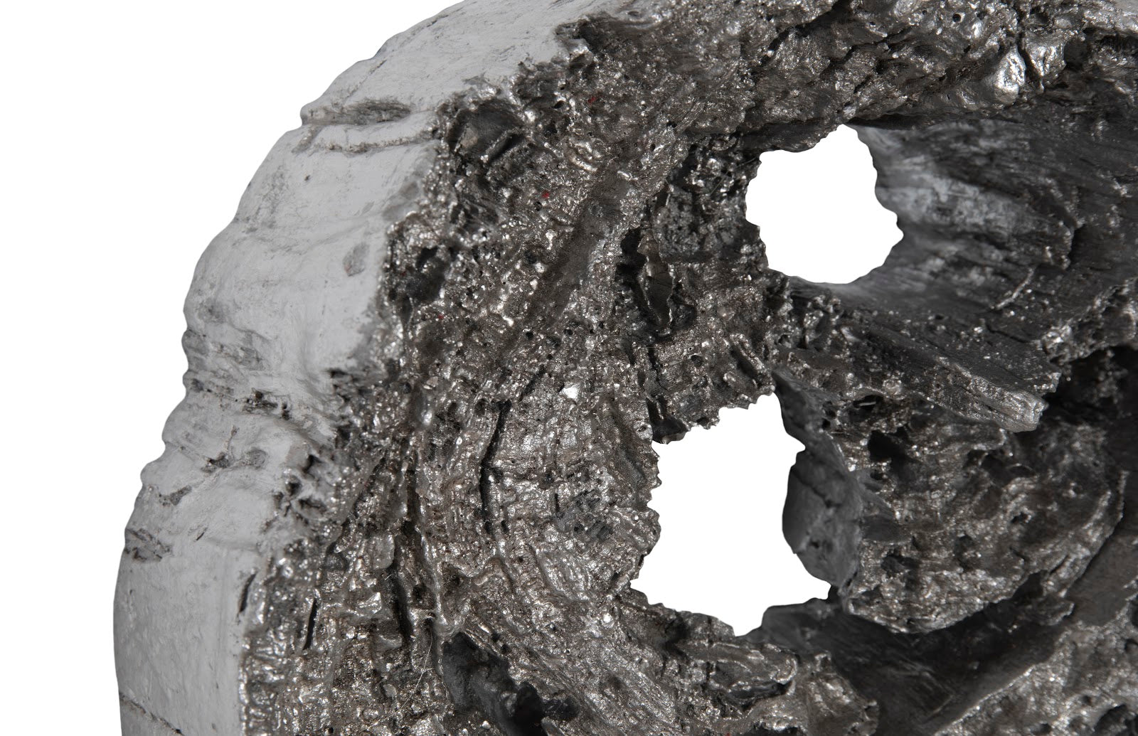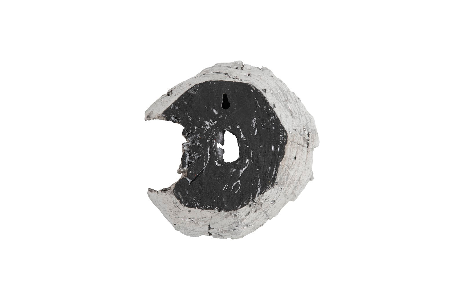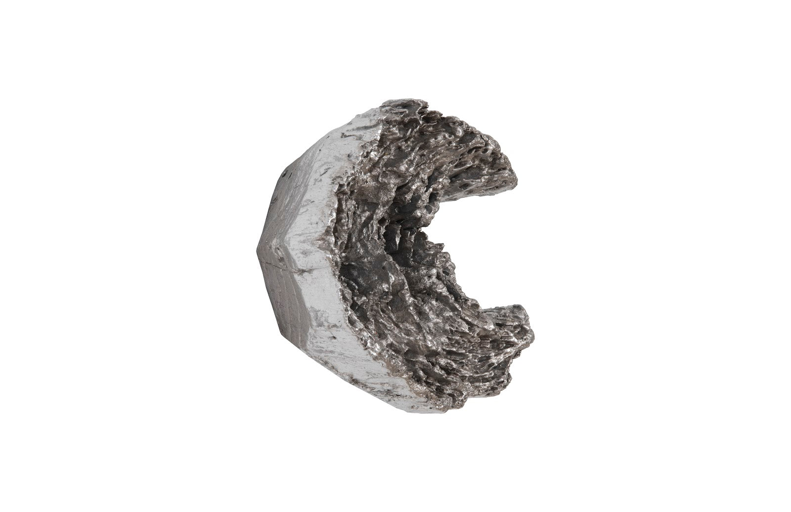 Bring an immediate sense of seriousness to a room with the Cast Eroded Wood Semi-Circle Wall Tile. Though it is made of composite, it imitates a relic so convincingly, it could have been pulled from the smoky ruins of a bygone volcano. The mix of silver leaf and black finishes help amplify this ruse, which reflects the ethos that Phillips Collection personifies: modern organic. We offer two similar shapes of table sculptures and a more rounded wall tile in this collection, as well.
