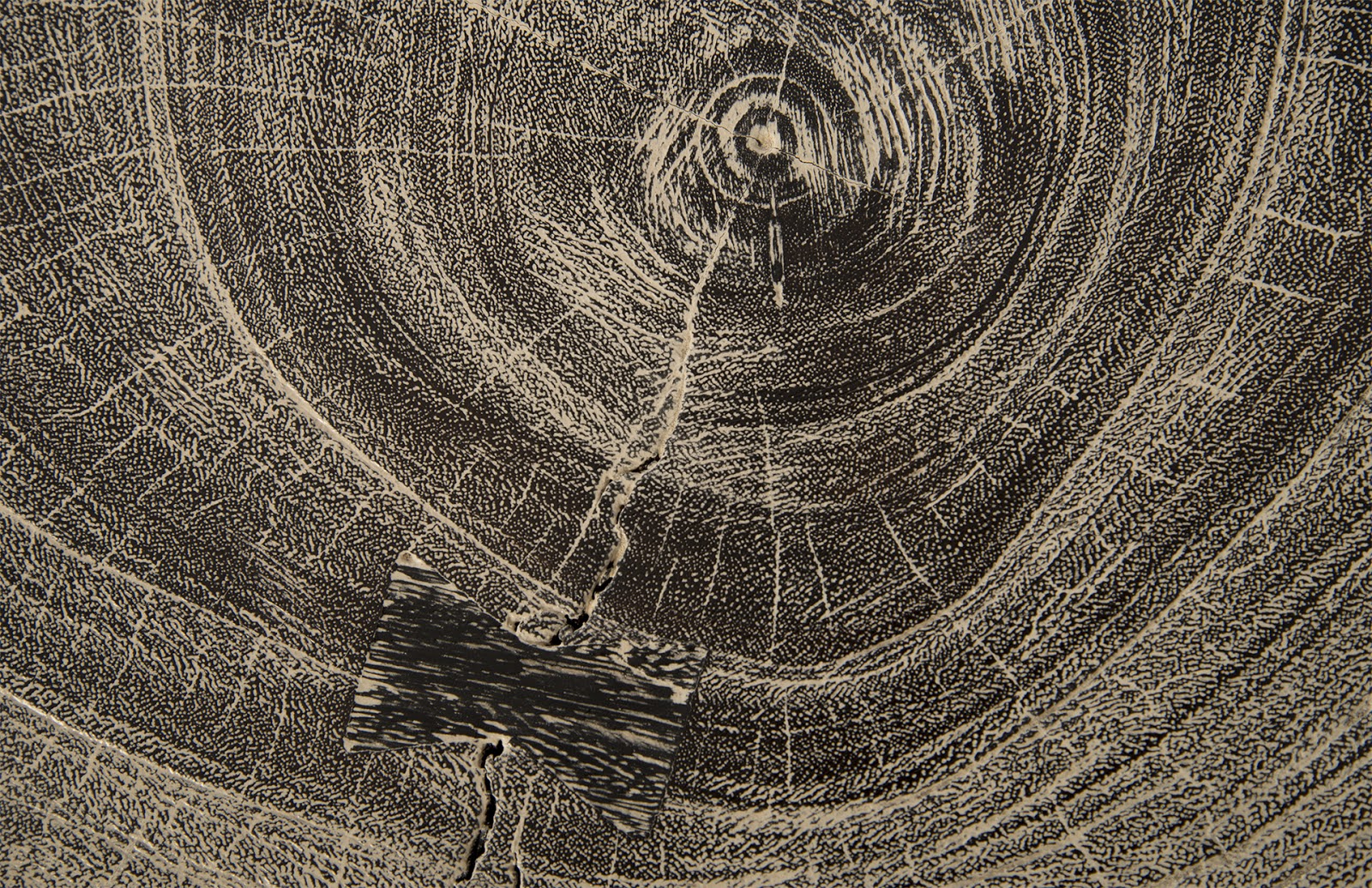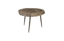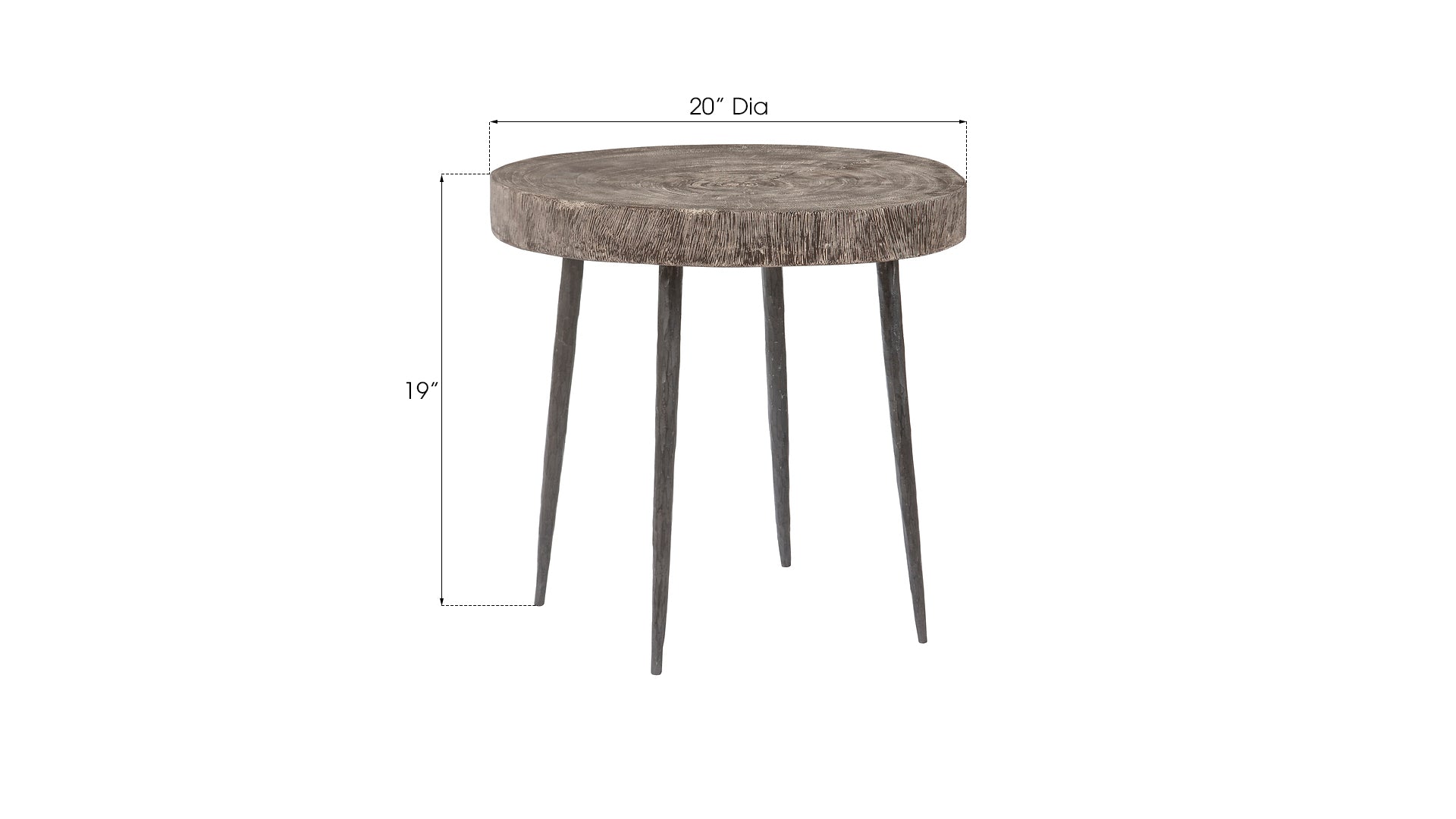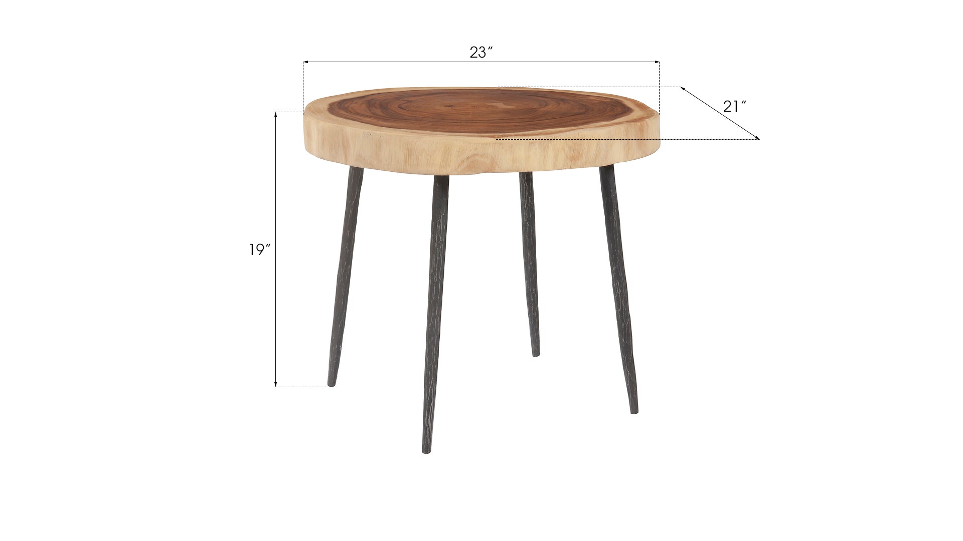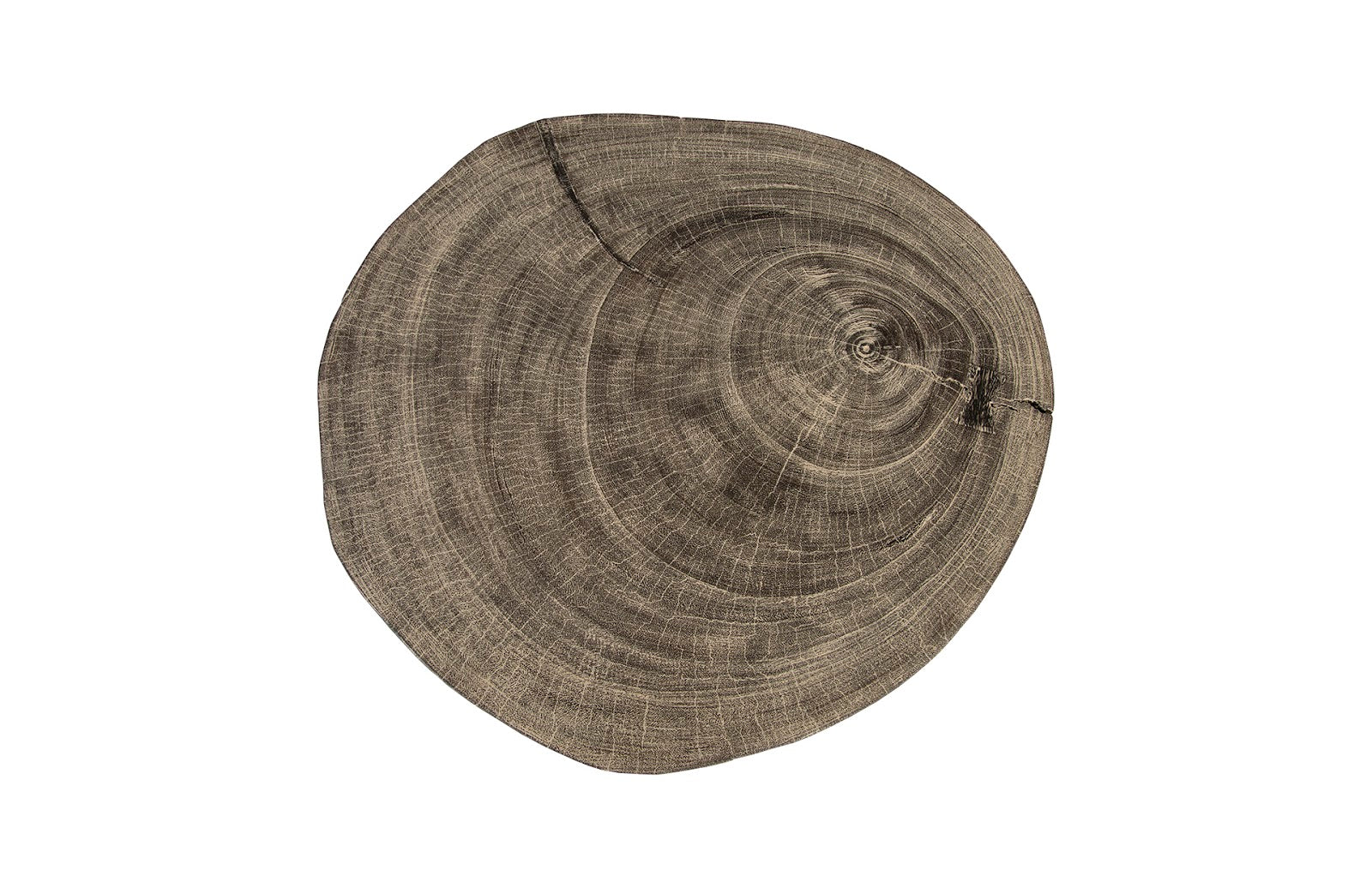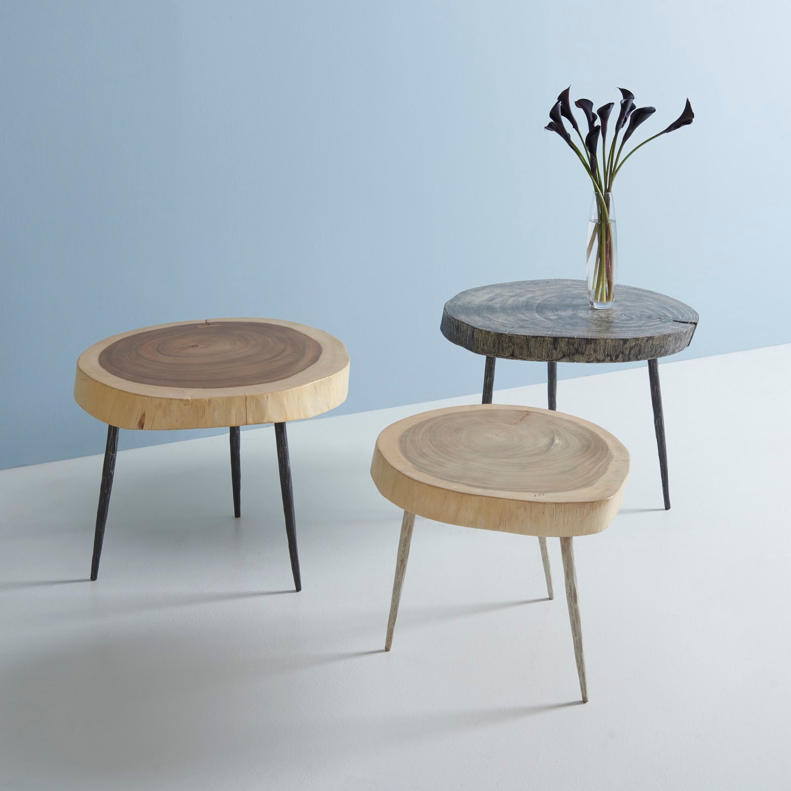 Natural round slices of wood in three beautiful finishes sit on solid metal