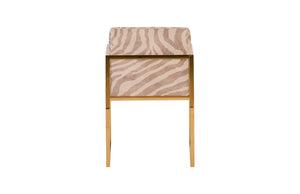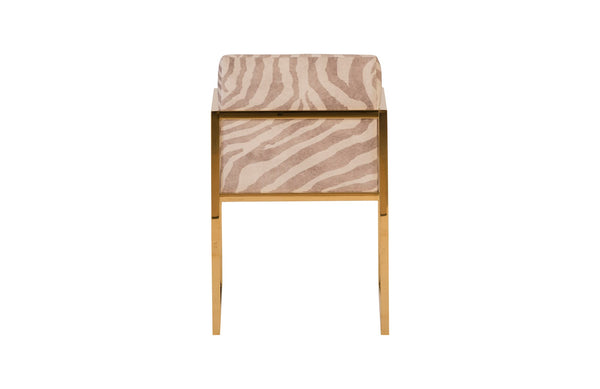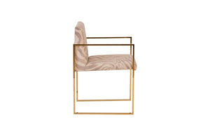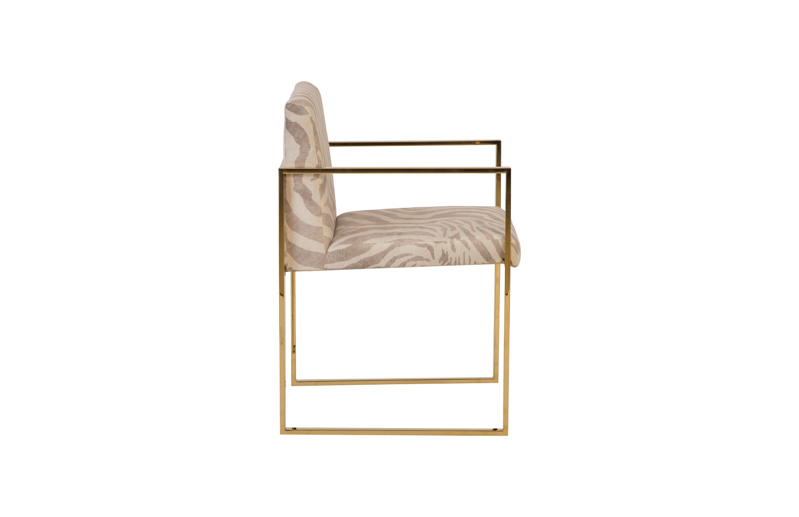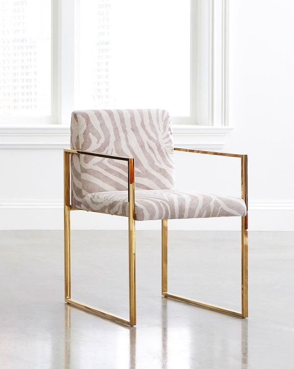 The Frozen Zebra Brass Arm Chair is one of our most popular dining chairs. With its zebra-print upholstery fabric and plated-brass frame, it is a shoe-in for both contemporary and mid-century modern interiors because we have tweaked the vintage profile to bring it seriously clean lines. Though it appears it could have been born in the swinging seventies, this is no disco-ball baby, as it was conceived by our design team in the 21st century. We offer a number of upholstery and frame finish options in this collection, and we have armless dining chairs in the mix. Each of these reflects the ethos that Phillips Collection personifies: modern organic.