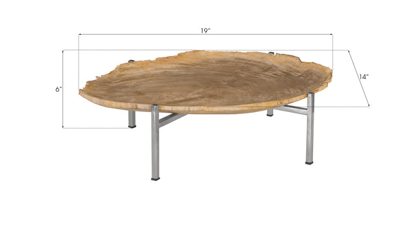 Beautiful pieces of petrified wood are polished and placed on a stainless steel base. Tray is removable from base.
