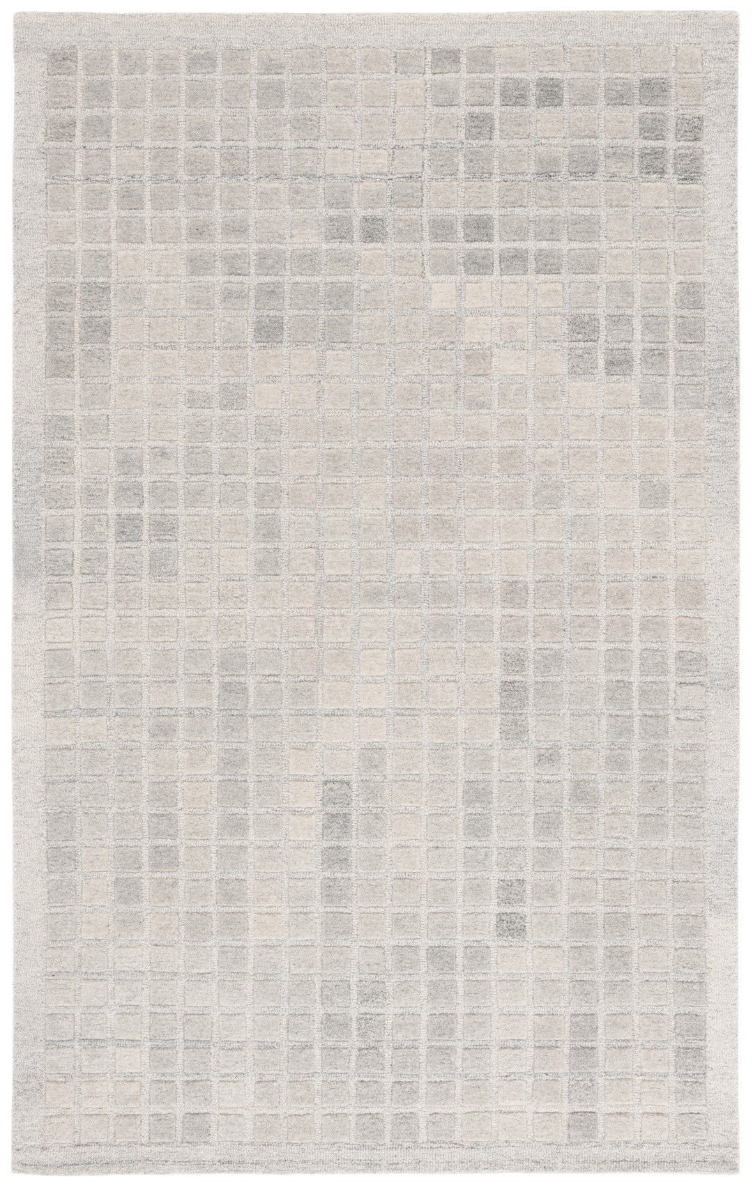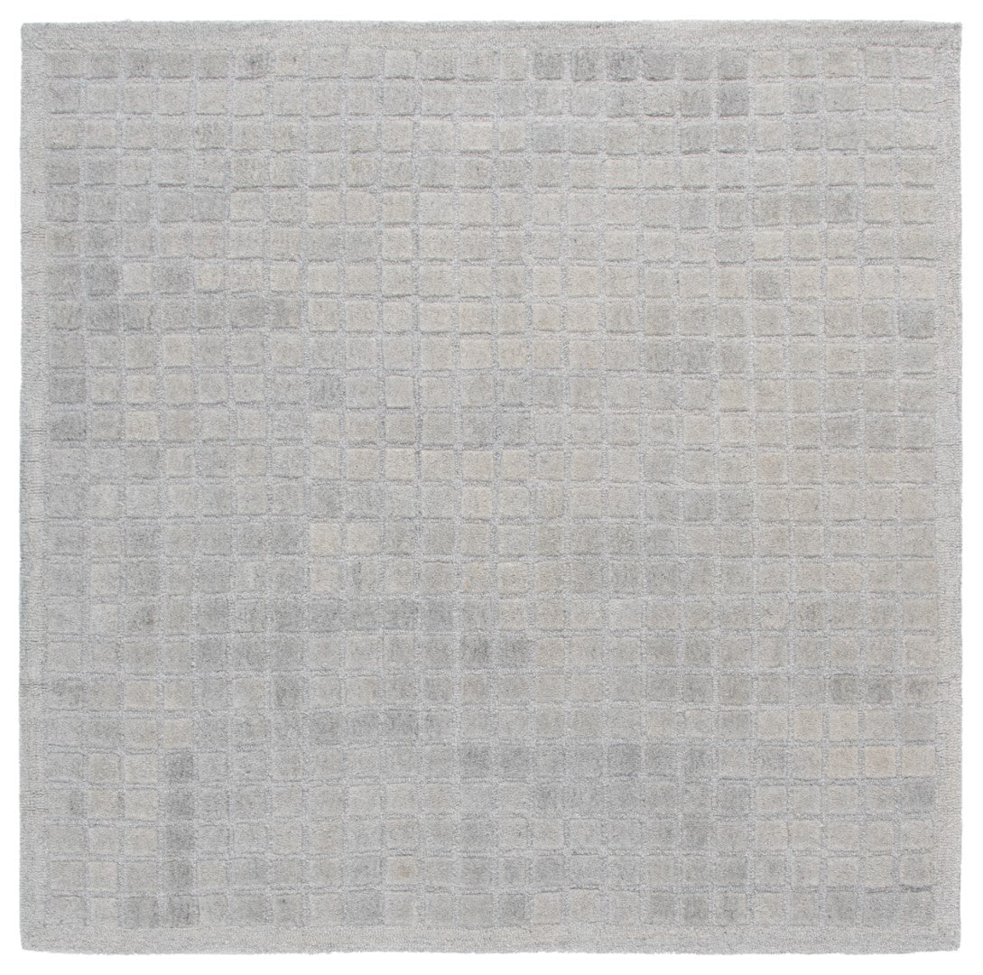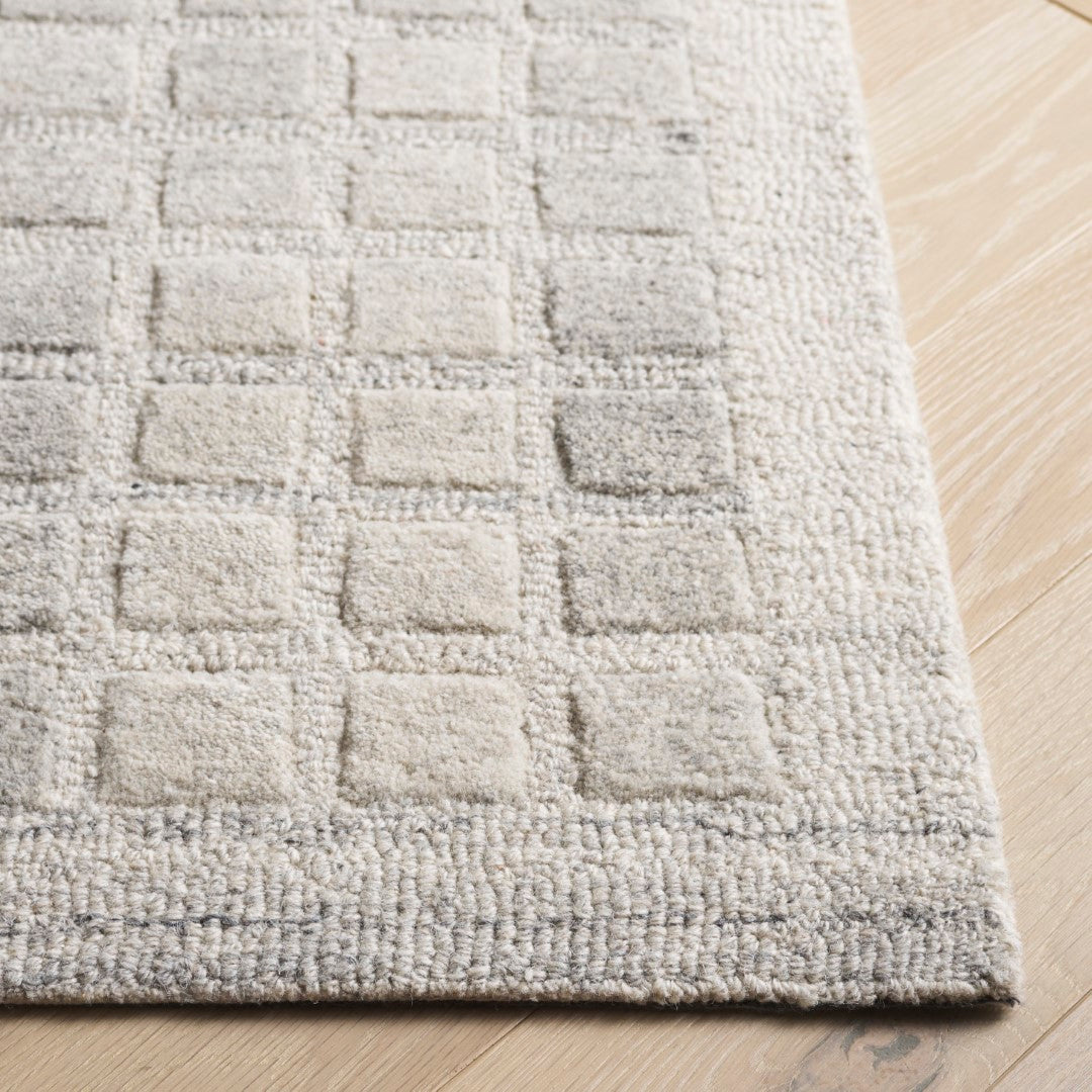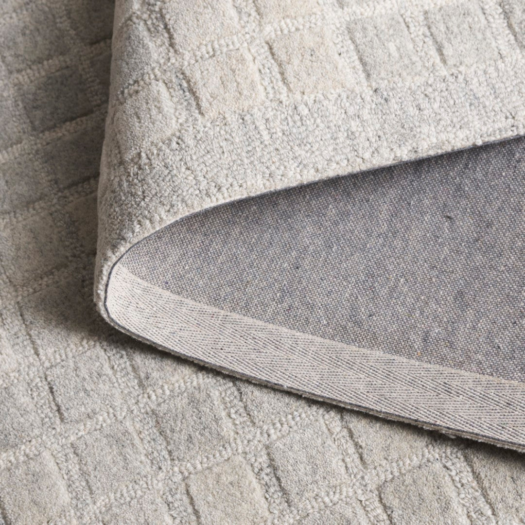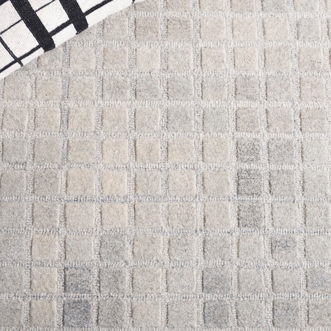 The rug features a unique pattern that captures the eye, with an array of subtle squares and rectangles overlapping in a harmonious grid-like design. The variation in the shading of the grey tones adds depth and dimension, making each step on this rug a luxurious experience.