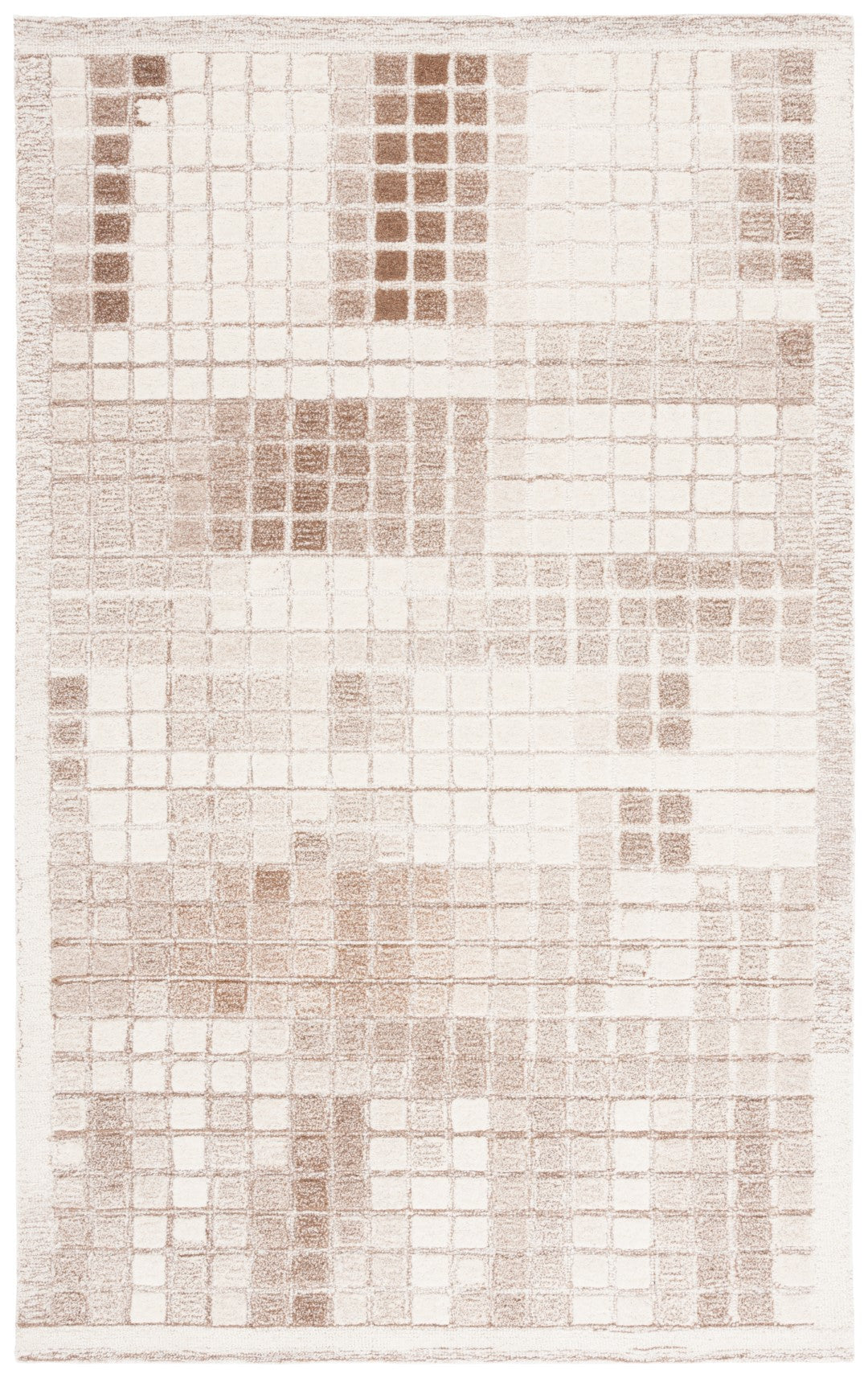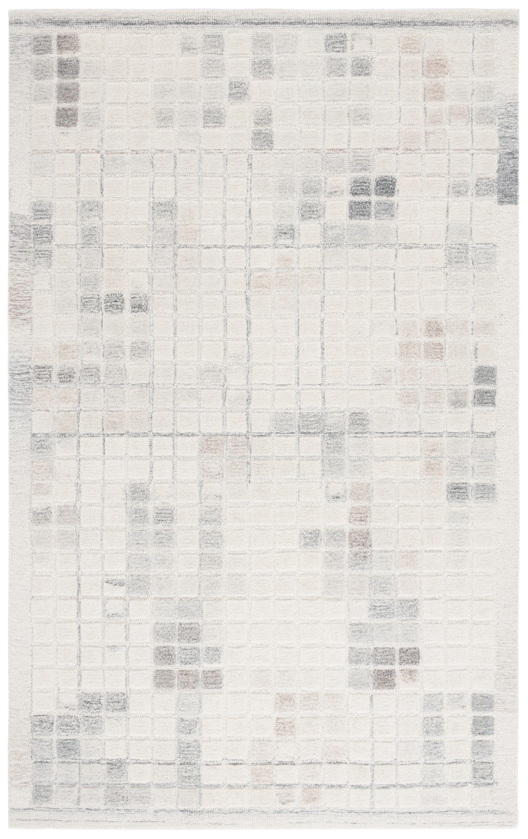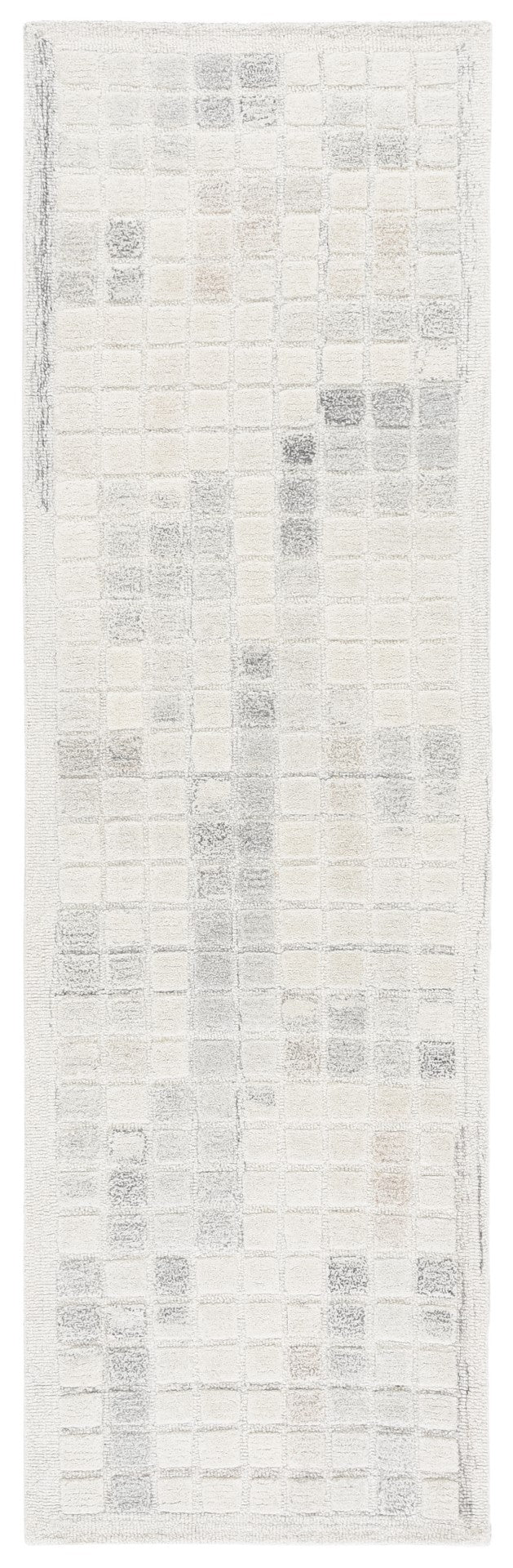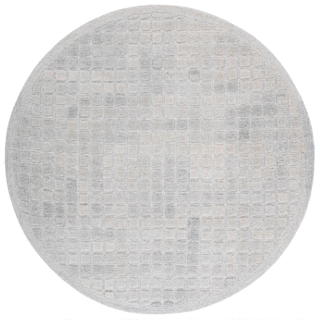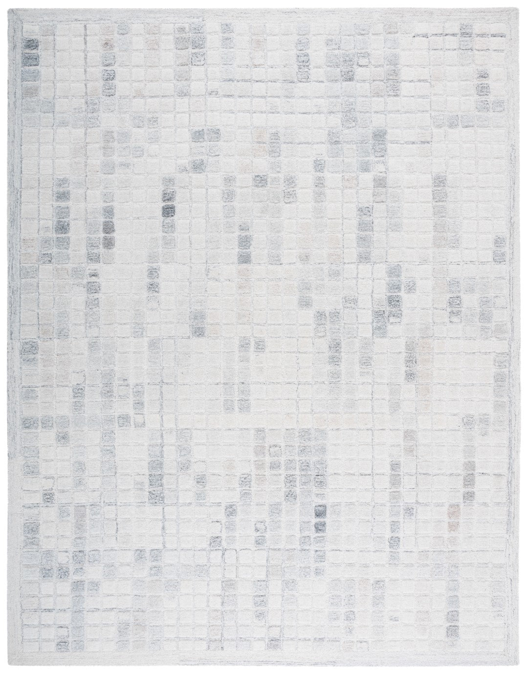 The rug features a unique pattern that captures the eye, with an array of subtle squares and rectangles overlapping in a harmonious grid-like design. The variation in the shading of the grey tones adds depth and dimension, making each step on this rug a luxurious experience.