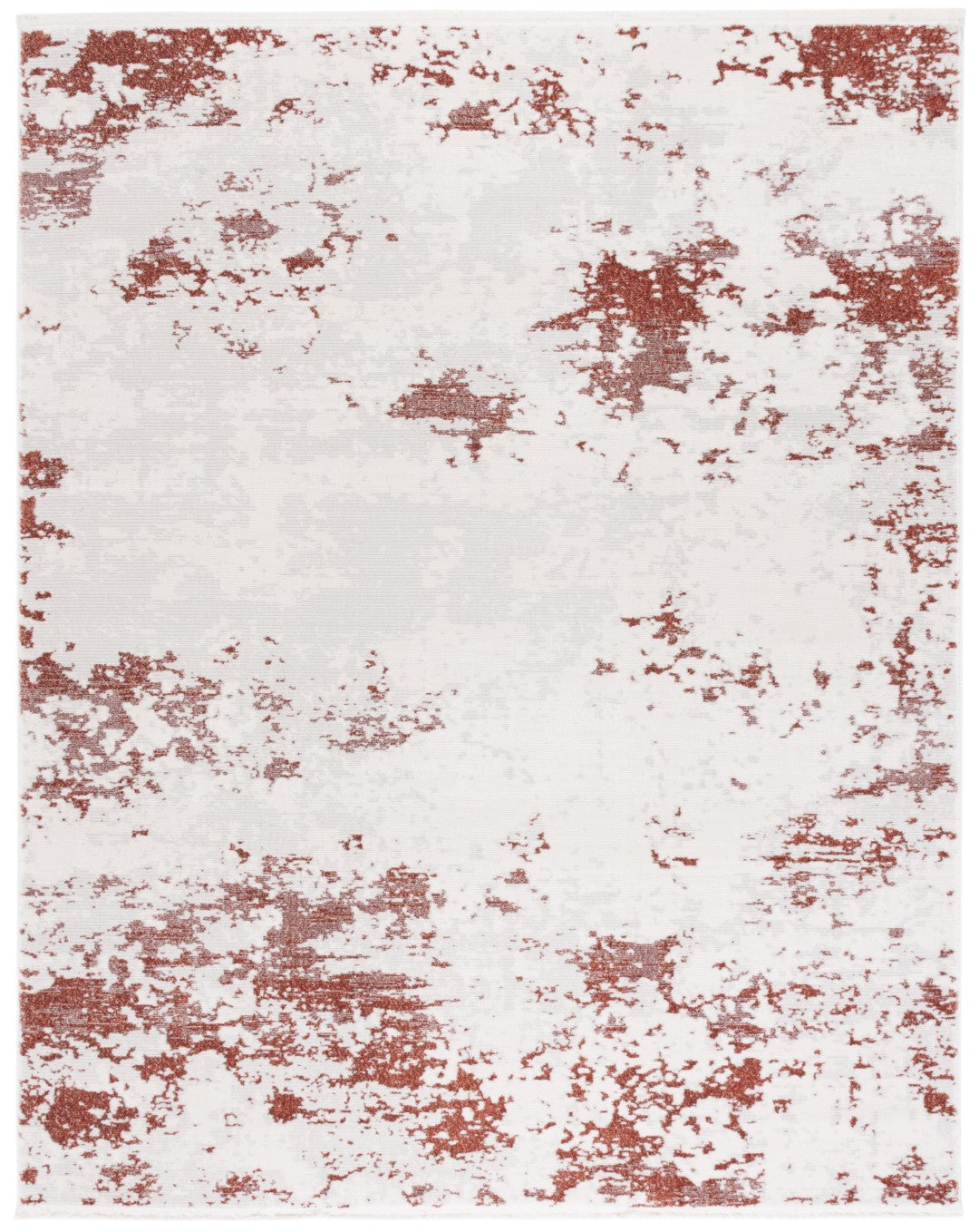 The rug's design showcases a beautiful and intriguing pattern in rich rust and elegant ivory hues. The abstract, distressed motif allows for versatility in styling, making it an ideal choice for a variety of interior themes from minimalist to eclectic. The 1/2 inch pile height offers a plush feel underfoot without compromising on ease of maintenance.