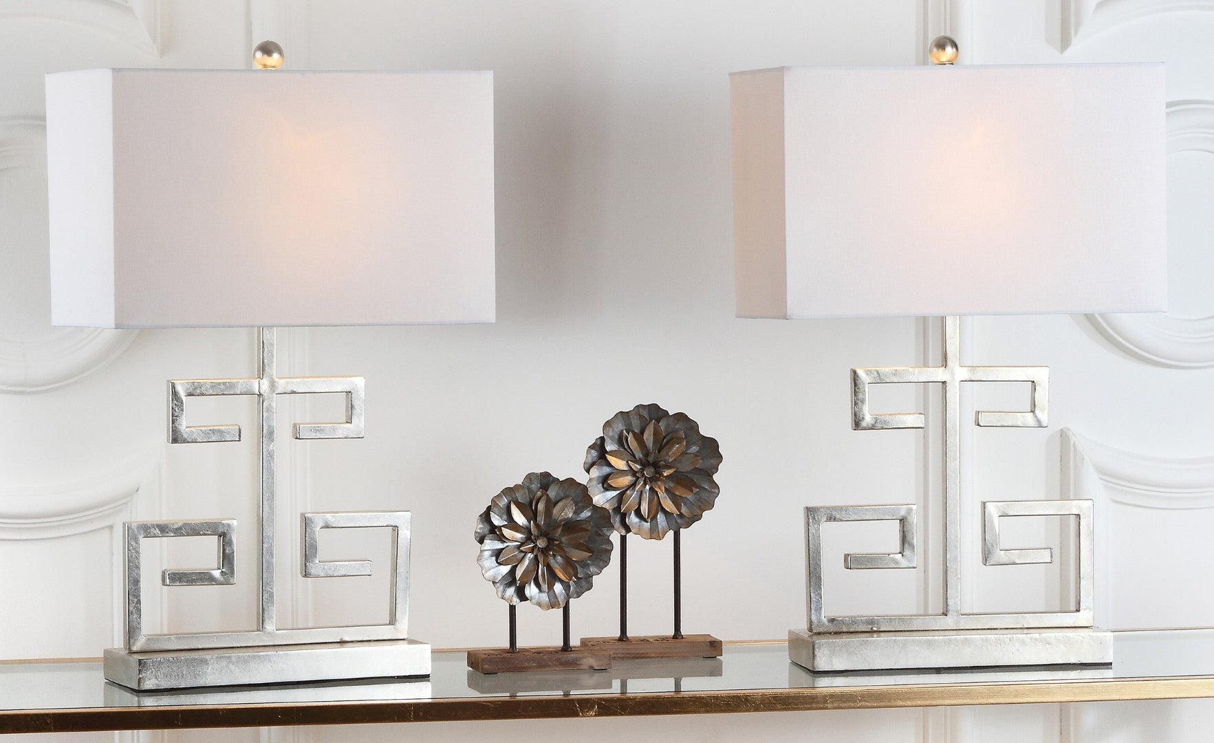Elevate your interior with a refined blend of classic motifs and contemporary chrome styling. These Greek key table lamps feature a sculptural metal base and carefully detailed fretwork that casts subtle visual interest while providing reliable, functional lighting—ideal for living rooms, bedrooms, or entryways where both form and function matter.