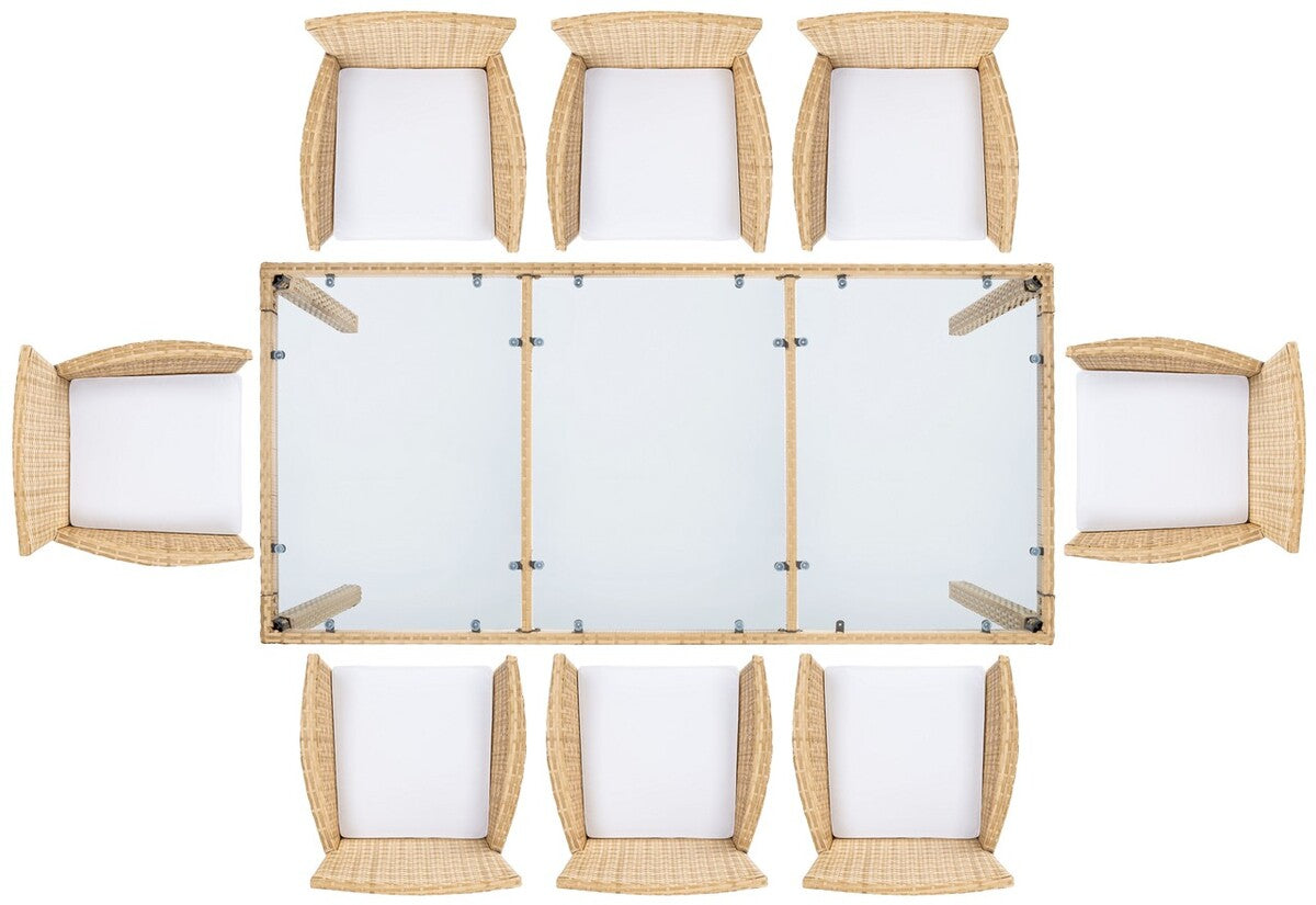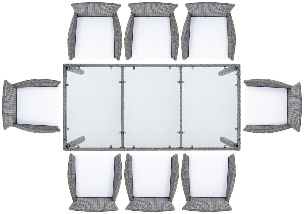 Give outdoor entertaining a contemporary chic upgrade with this Hailee Dining Set. Grey brown wicker details highlight the eye catching silhouettes of Hailee’s eight dining chairs, and its glass topped dining table ensures hours of delightful conversation for you and your loved ones.