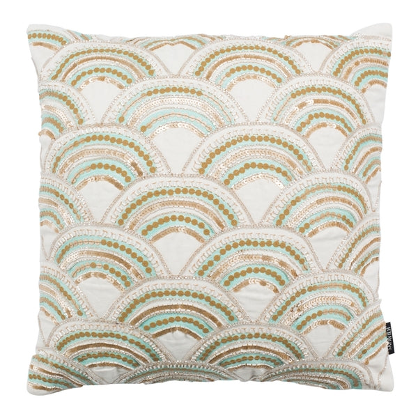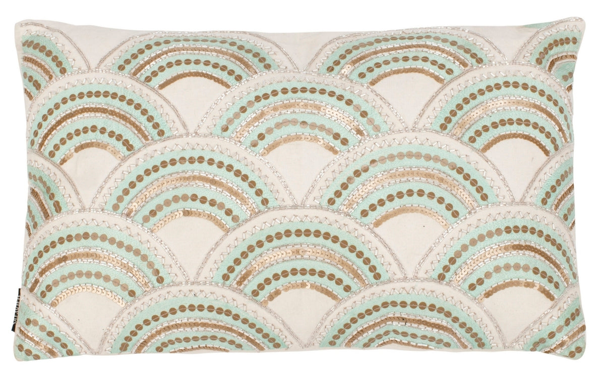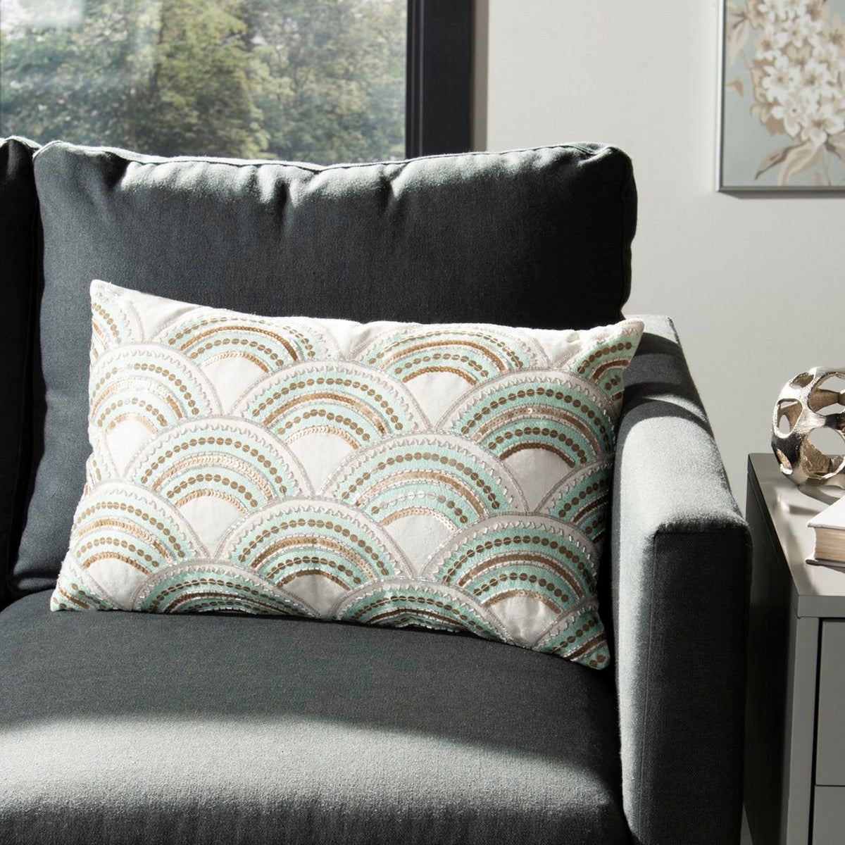 Pillows tend to flatten during transit, but these tips should help you get that pillow into its fluffiest shape quickly! Once unpacked, gently knead the pillow to help loosen the fibers. Throw the pillow in a dryer on a low tumble setting. The most important tip is to include a sock stuffed with a tennis ball to help "beat" the pillow into its fluffy form. Remove from the dryer, and proudly display your new piece of couch art!