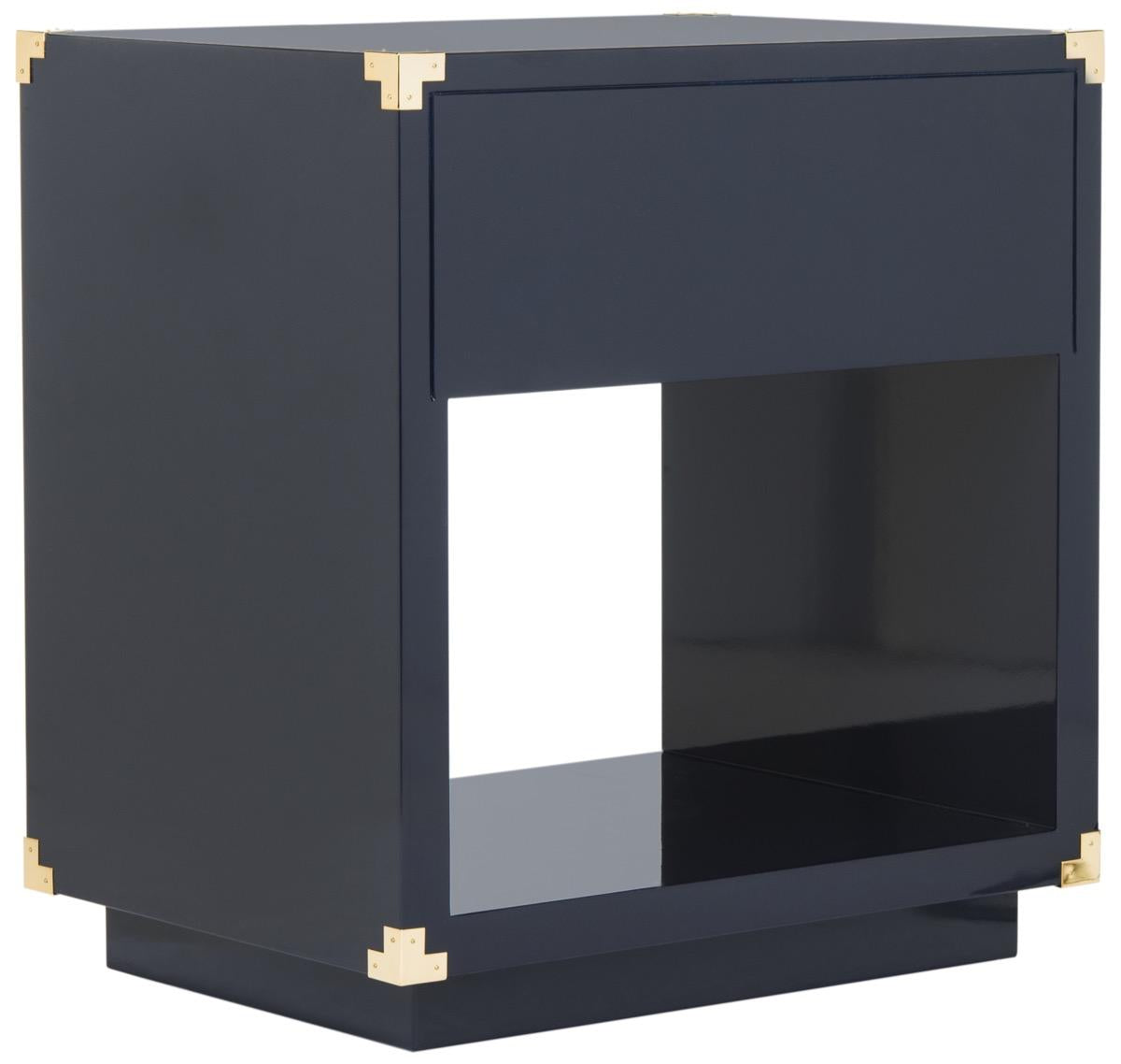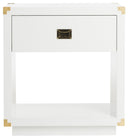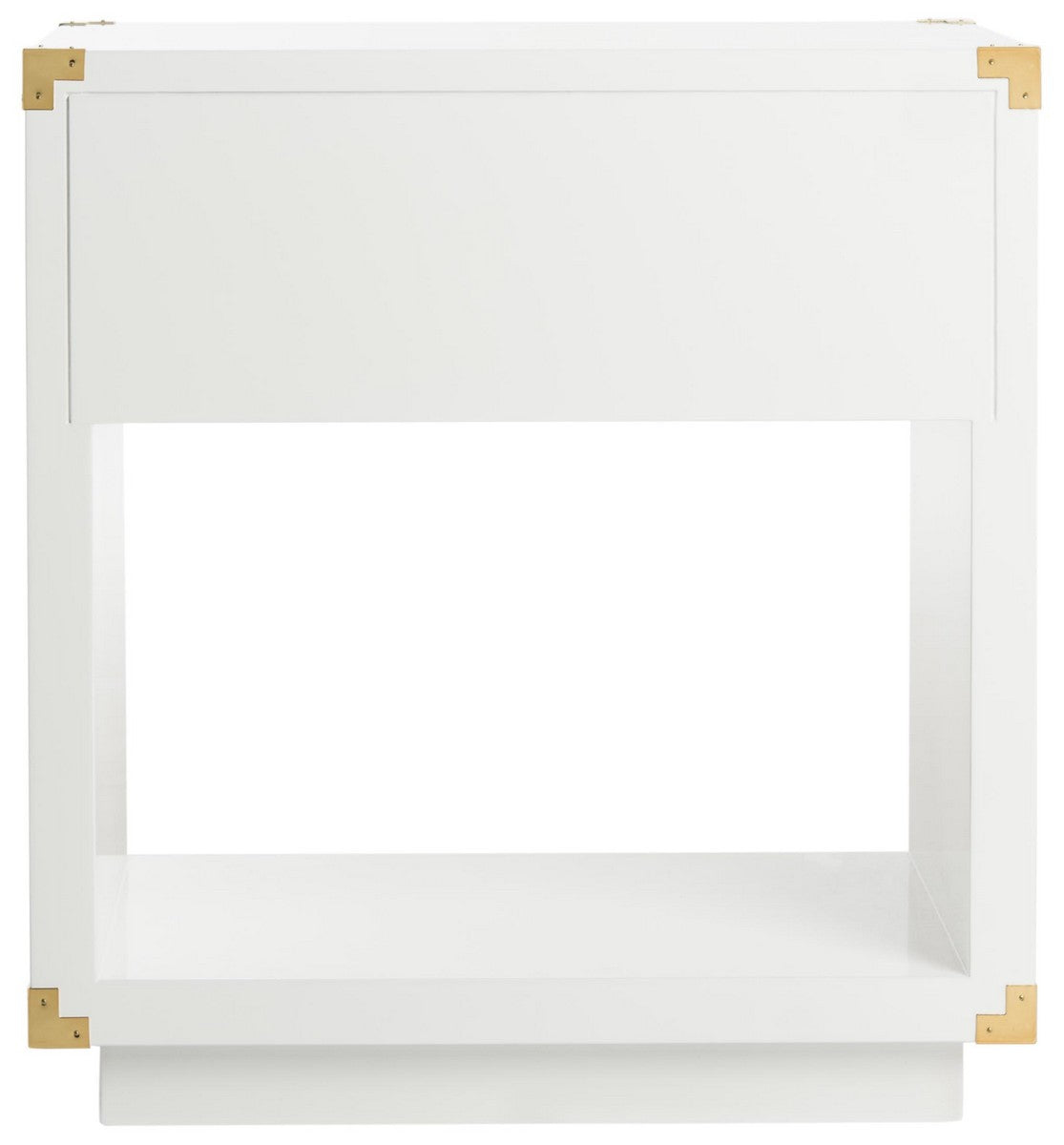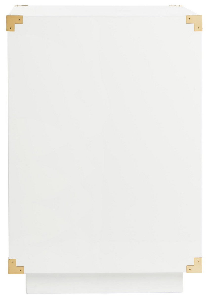 The focal point in any modern, sophisticated interior, this contemporary side table is a timeless investment. Its classic white hue beams with a smooth lacquer finish and rich polished brass hardware. Its substantial storage makes it a designer favorite.