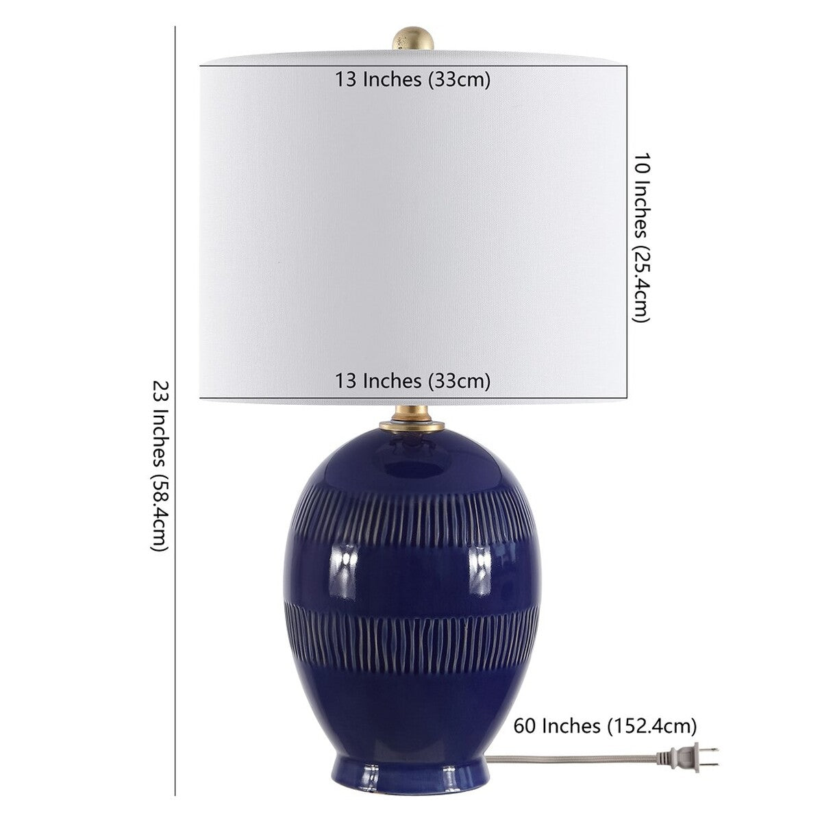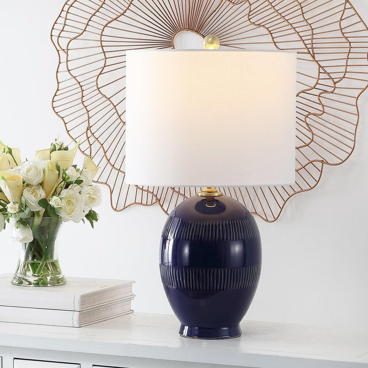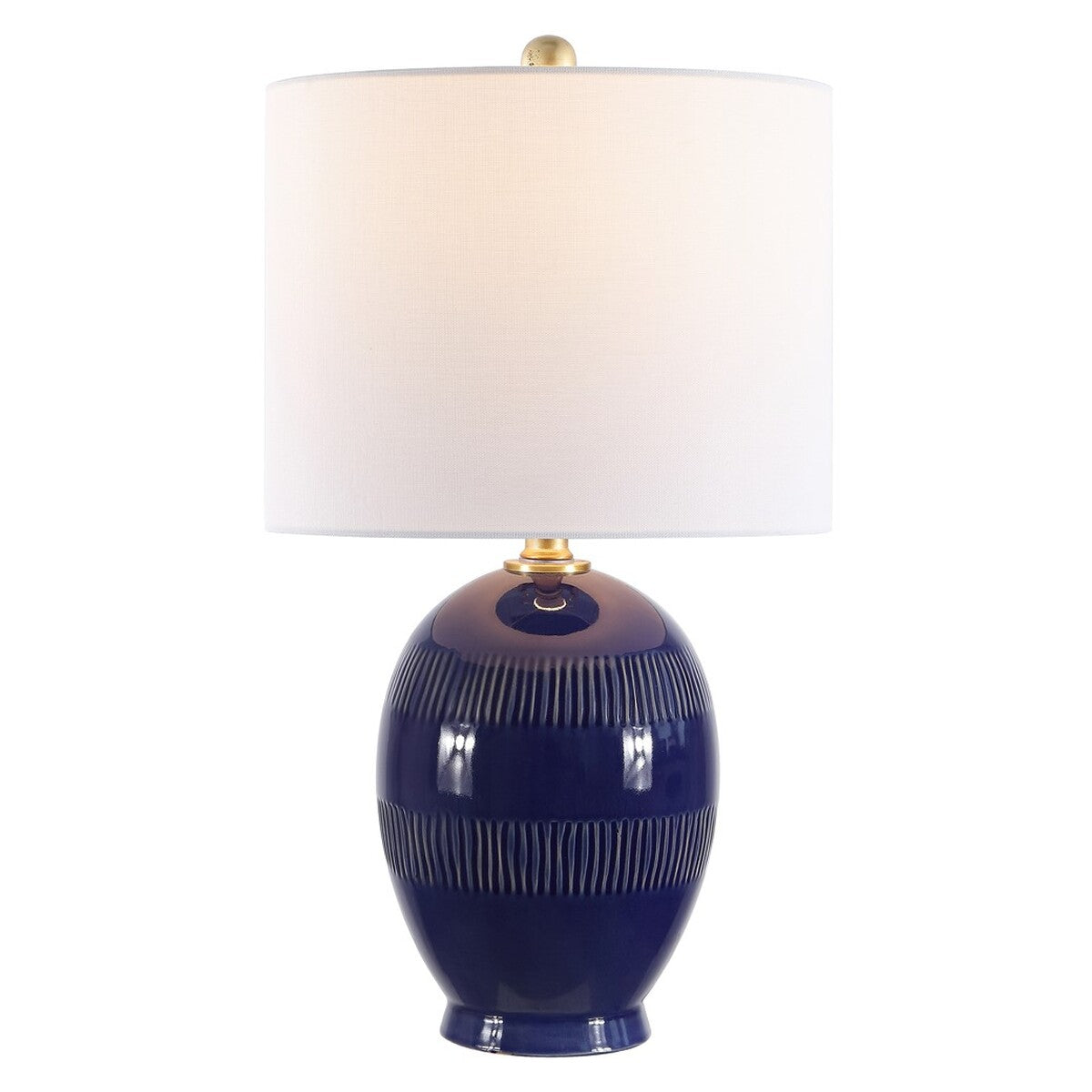 Give your décor an aura of palatial artistry with this Liney Table Lamp. Featuring a striking juxtaposition of royal blue crackle ceramic and regal gold hardware, Liney’s bands of linear detail adds captivating depth to its stellar design.