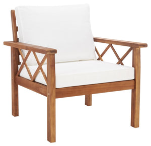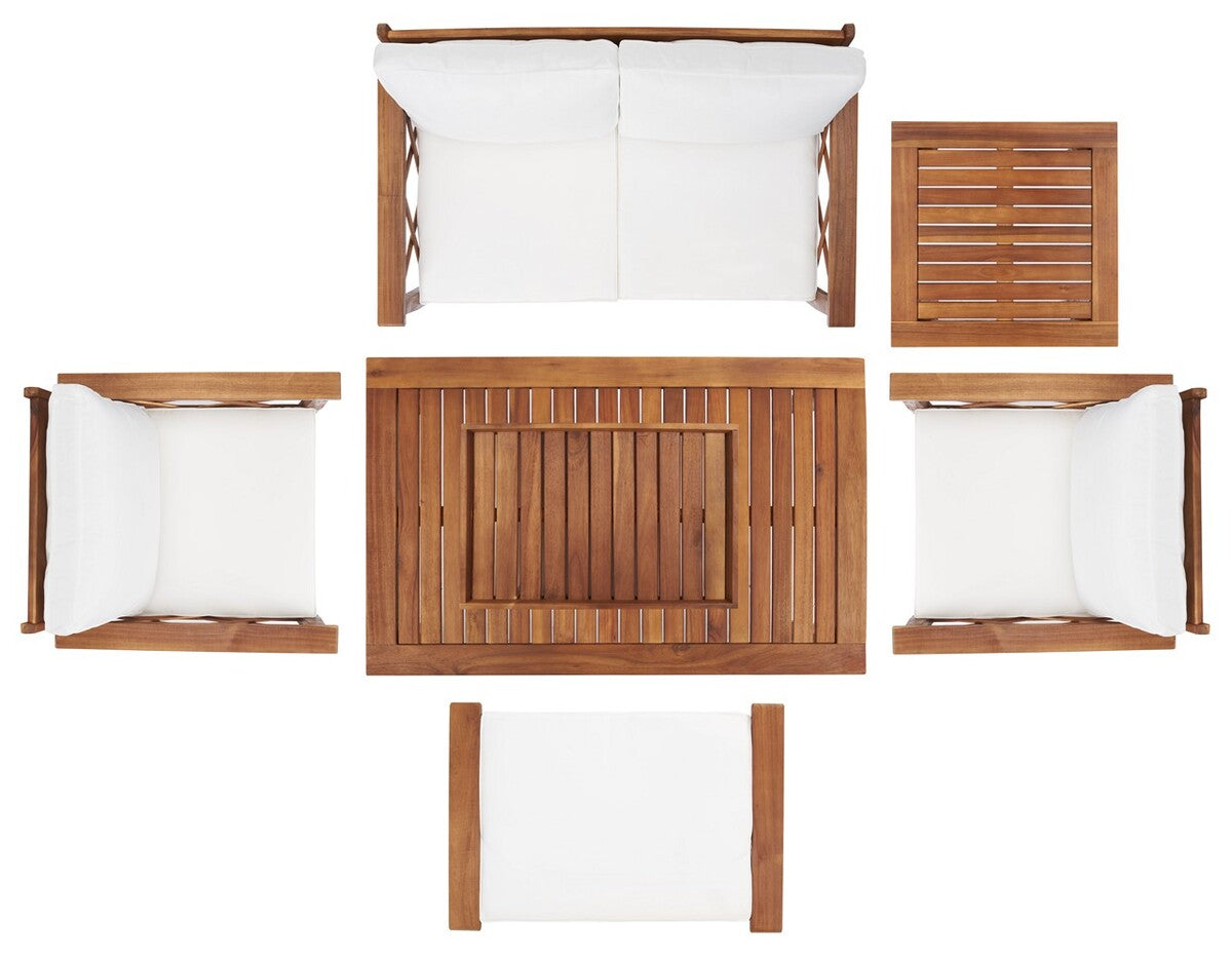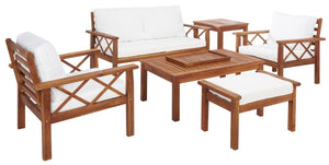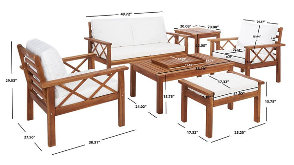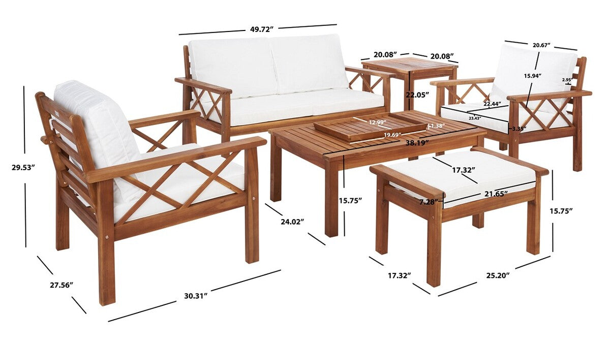 Traditional garden party furniture is given a contemporary-chic upgrade in this Loanna Outdoor Living Set. Including two armchairs, one loveseat, and one ottoman topped in plush beige upholstery as well as one accent table and one coffee table, designers are obsessed with the crossed X accents on Loanna’s natural-finished wood frames.