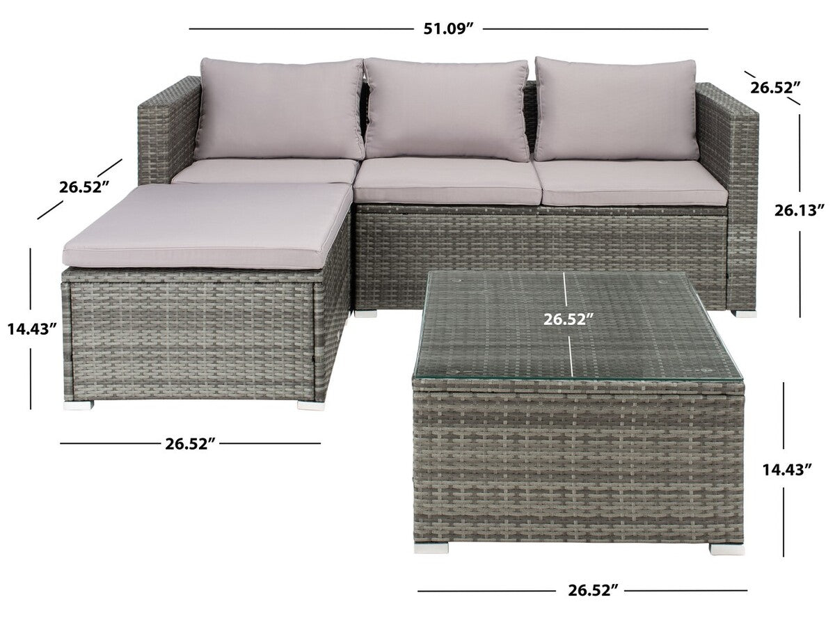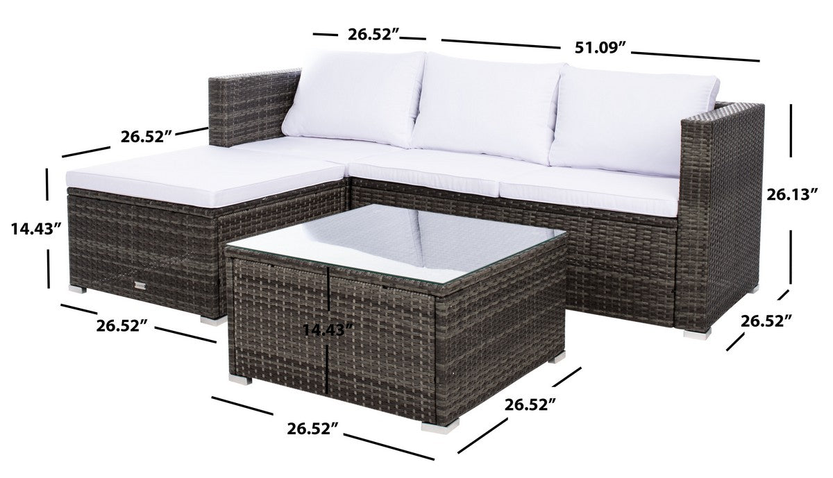 - Set Dimensions ( W * D * H ): Table: 26.52" X 26.52" X 14.43"Chair: 26.52" X 26.52" X 26.13"Bench: 51.09" X 26.52" X 26.13"Ottoman: 26.52" X 26.52" X 14.43"