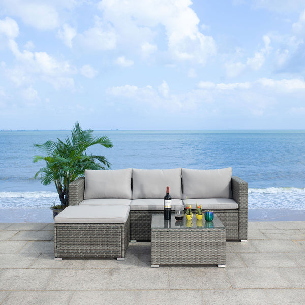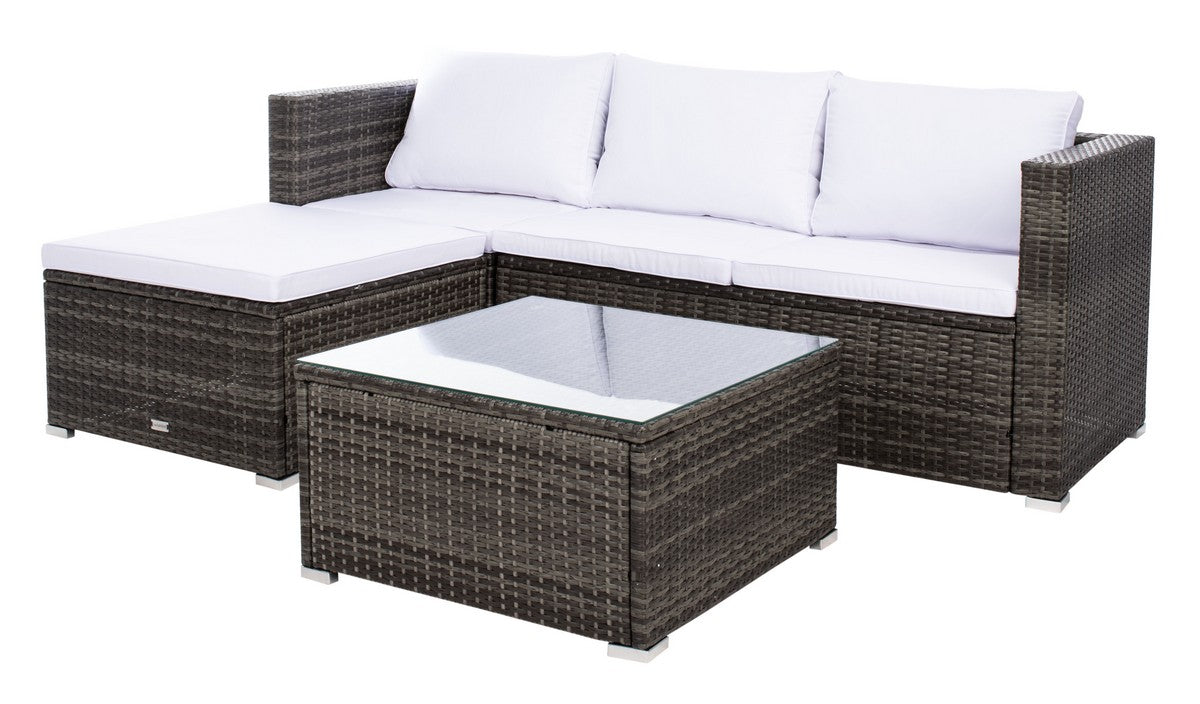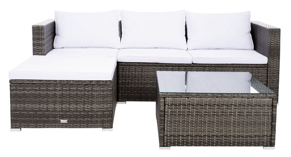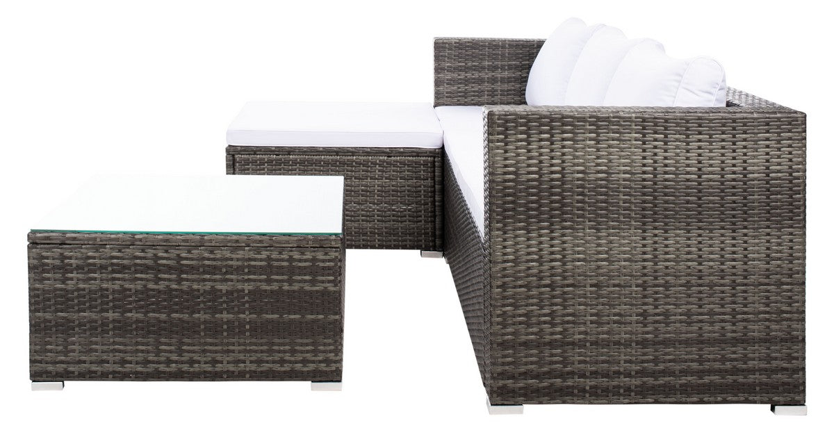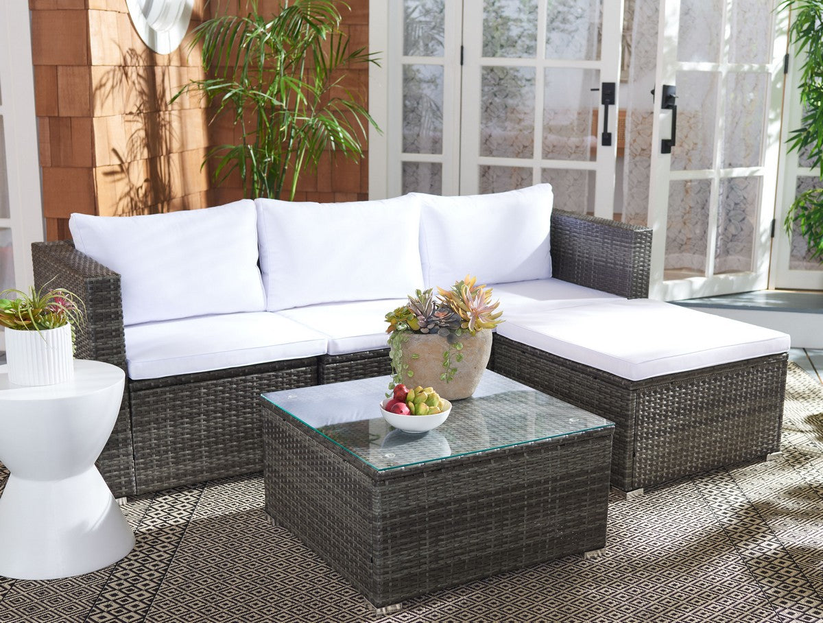 Styled to bring the cozy living room to outdoor lounging, the Madalina Living Set invites you to soak up the sun in luxury. Madalina’s plush grey cushions and matching frames blend seamlessly with any porch or patio décor, transforming your backyard into a beachside resort. Includes a glass topped black coffee table.