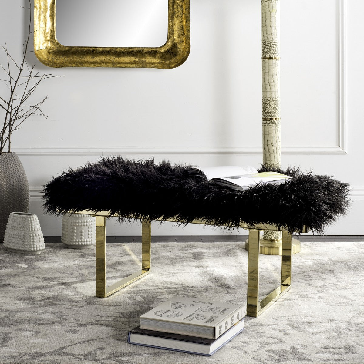 - Material: Wood, Brass Plated, 12MM MDF, Foam, Iron, Faux Curly Sheepskin