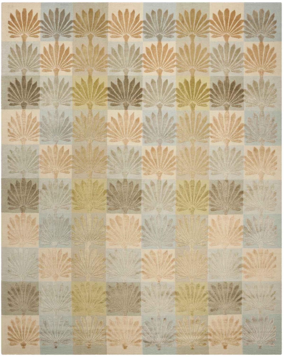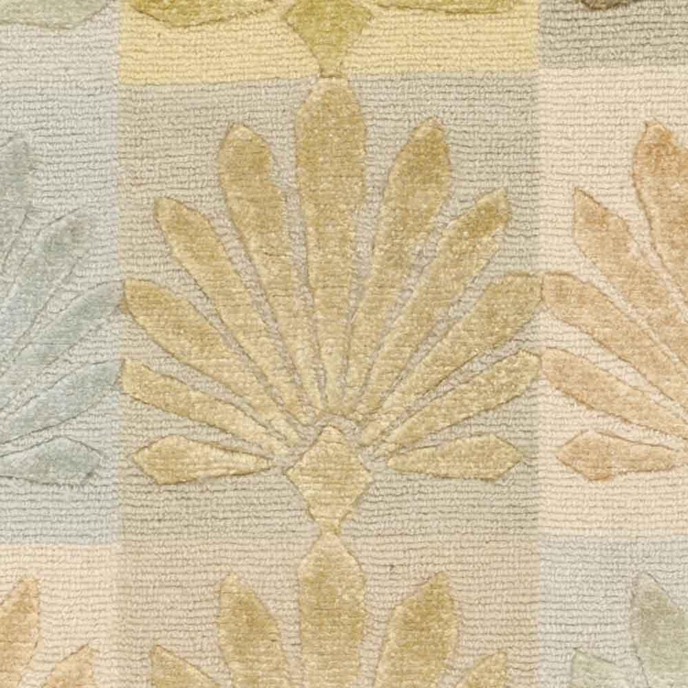 arns. Hand-knotting by Tibetan weavers creates a loop=pile backg and cut-pile motif, while pale, contemporary tones lend a shimmering iridescence to the design.