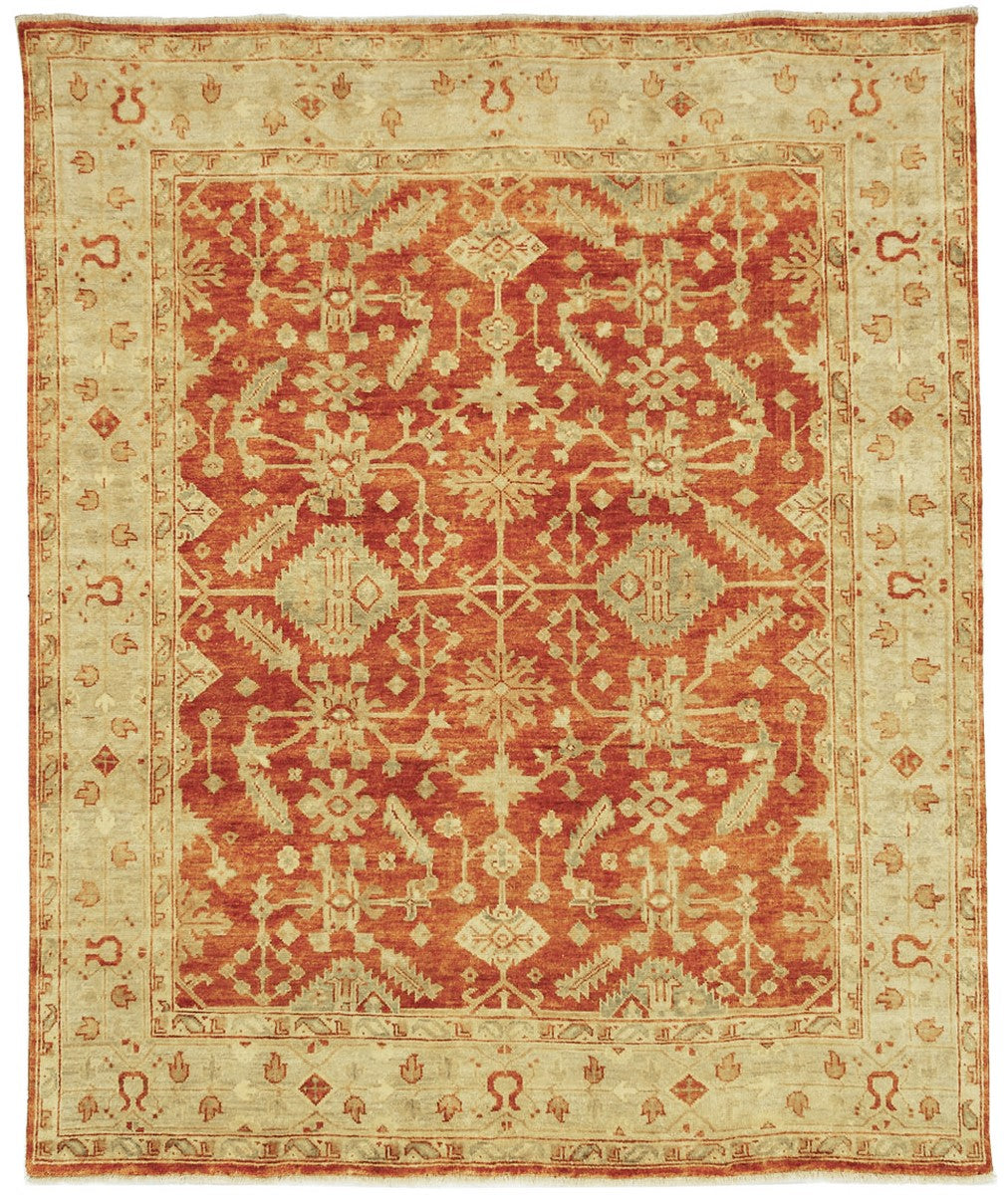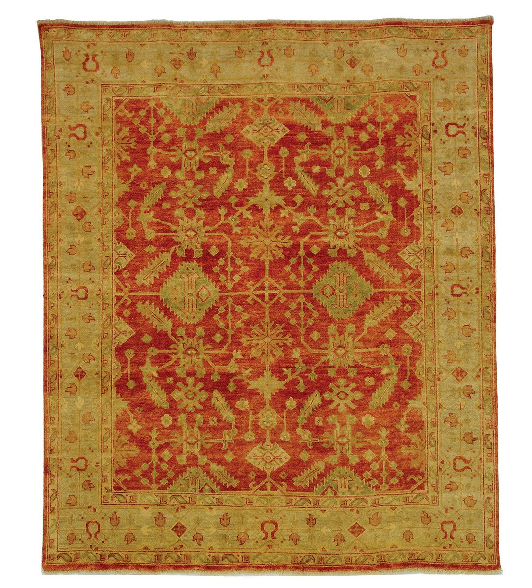 tract representations of foliage also recreates the naive geometric forms and colors commonly used in Oushak carpets, noted for their extra thick yarn and large Turkish-style knots popular today for casual interiors.