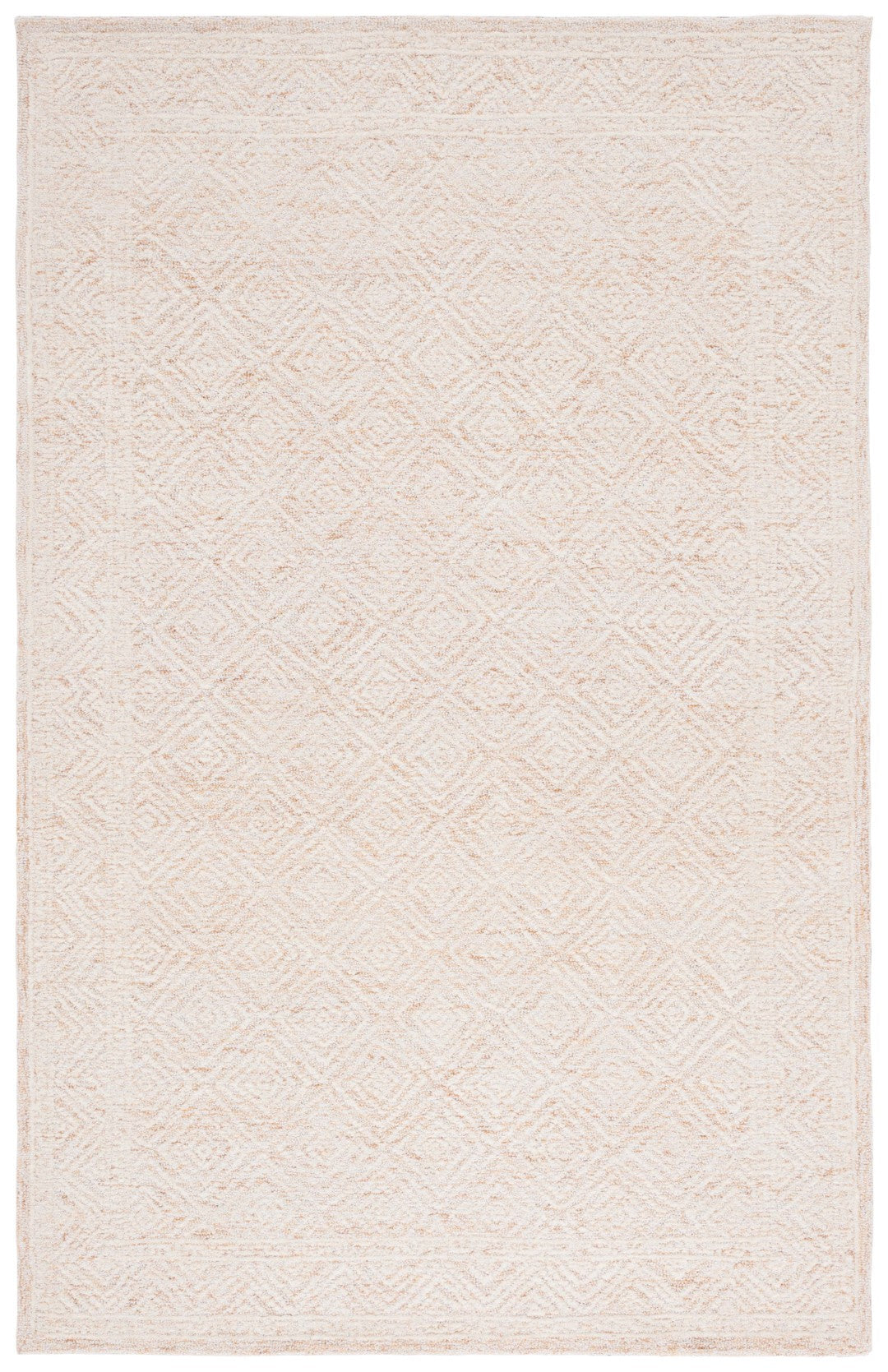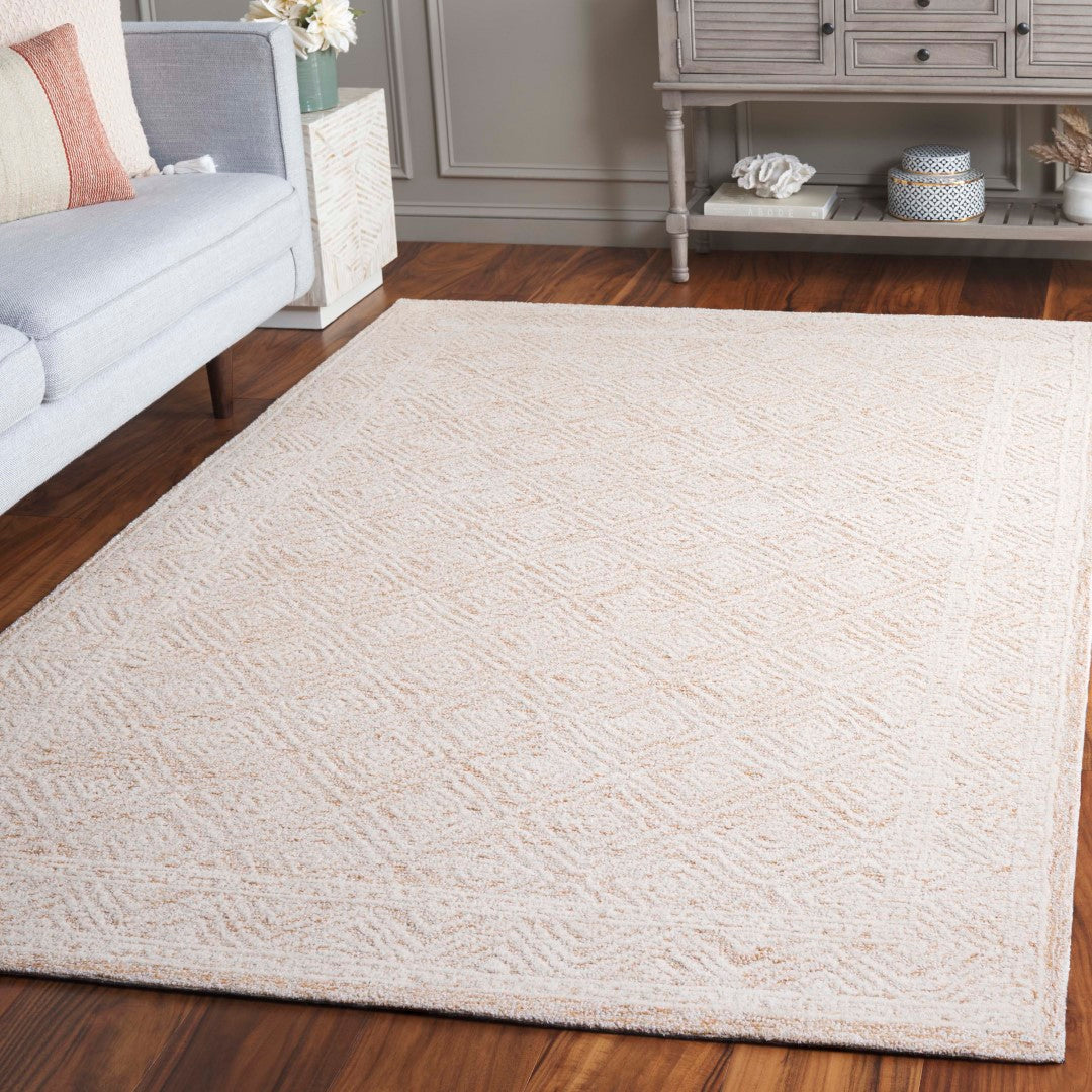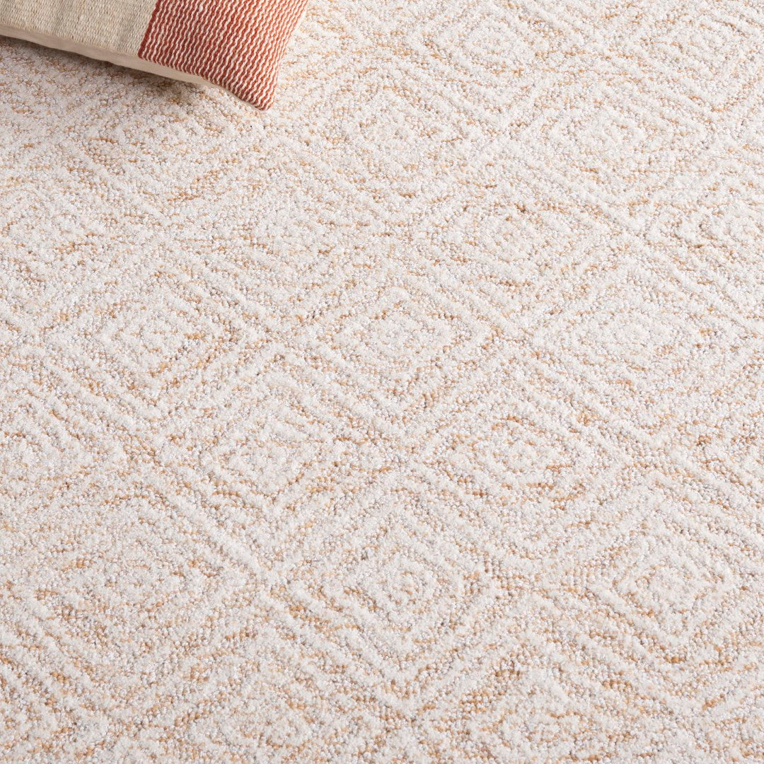 The rug features a beautifully intricate diamond pattern that exudes a sense of timeless elegance. The soft ivory background is gracefully complemented by subtle orange accents, creating a warm and inviting atmosphere in any room. This sophisticated pattern, while gentle in its presentation, is sure to draw the eye and become a focal point of your decor.