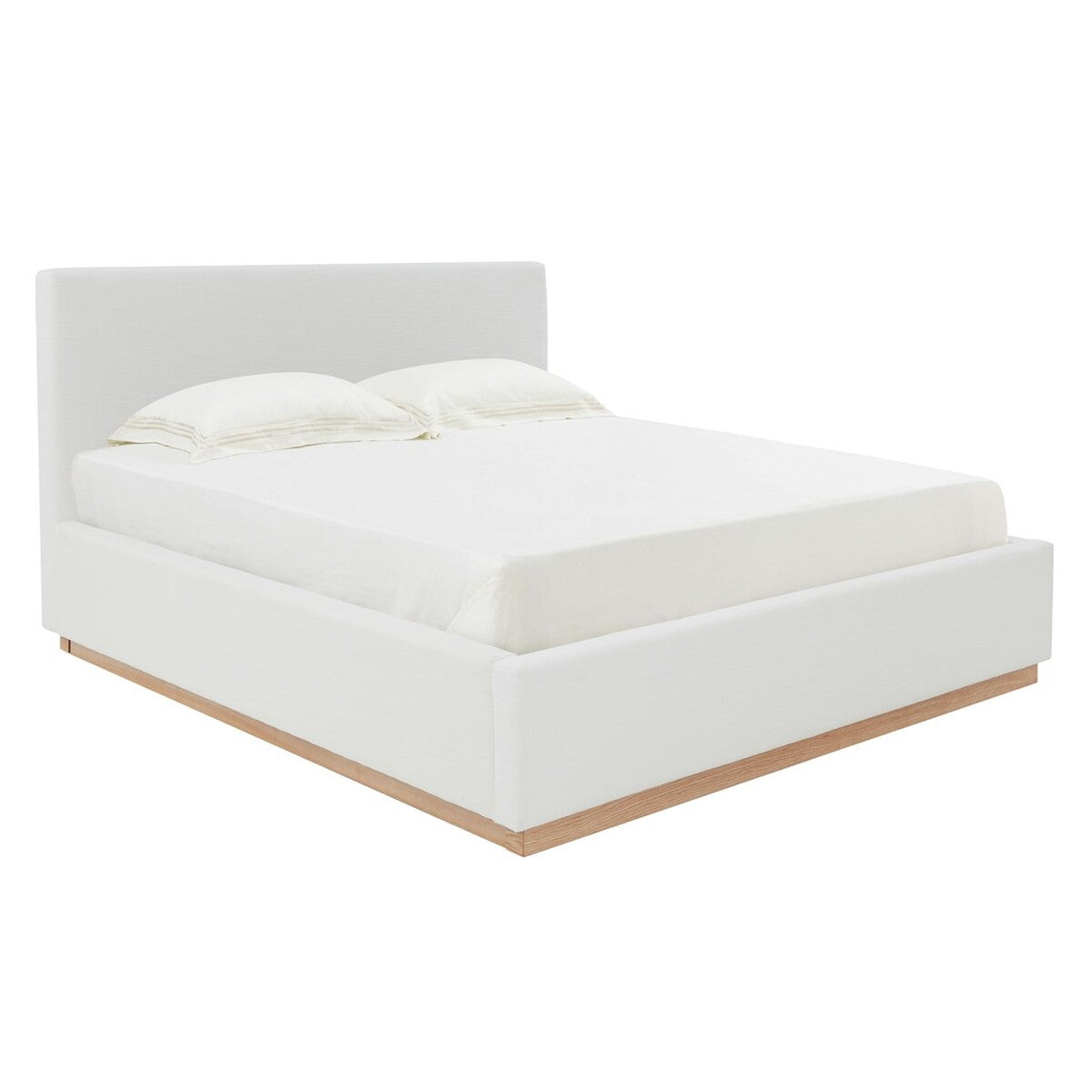 - Color Scheme: Elegant white fabric paired with a natural wood base.