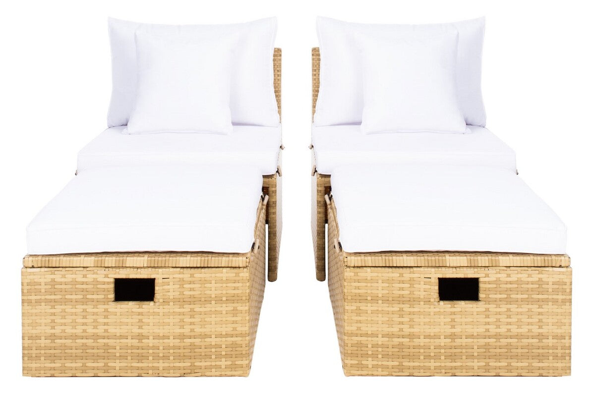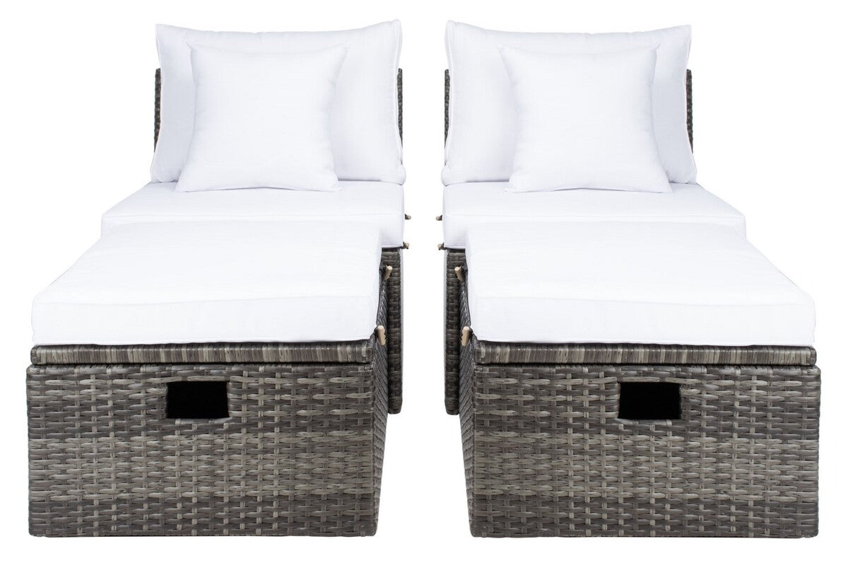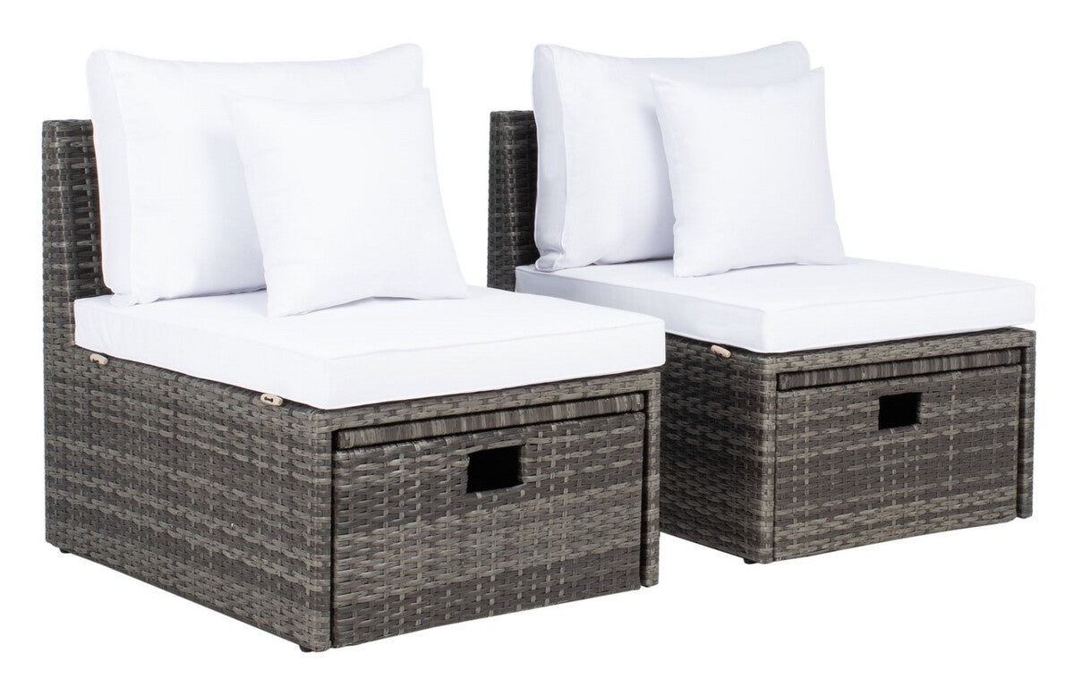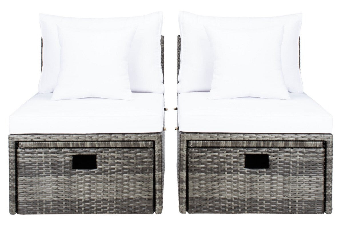 A brilliant blend of style and substance, this contemporary Pramla Set is the ultimate in dynamic duos. Crafted with a texture rich grey frame and plush matching cushions, Pramla includes clever built in storage ottomans for smart and chic sunbathing.
