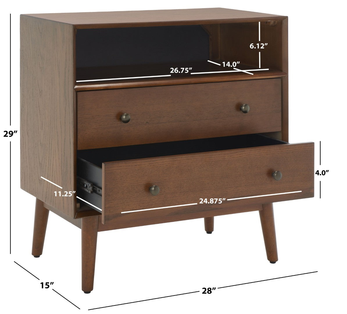 Discover A Refined Blend Of Mid-Century Character And Contemporary Practicality With This Two-Drawer, One-Shelf Chest. Its Splayed Legs And Medium Oak Finish Bring Warm, Retro-Inspired Style To Living Rooms, Bedrooms, Or Entryways, While Thoughtfully Designed Storage Keeps Essentials Organized And Accessible.