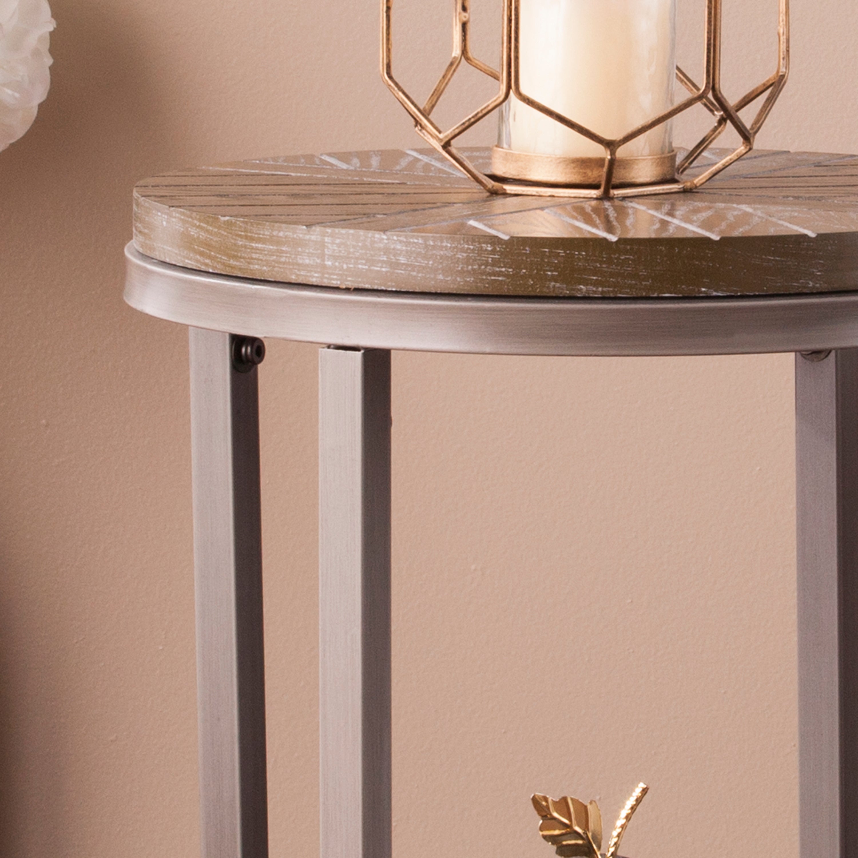 - Feature 1: Goes anywhere round side table w/ display shelf