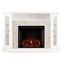 Warm up your style with this rich espresso, electric media fireplace. Handsome, lifelike stacked stone surrounds the firebox; wide open media shelf stores entertainment equipment or electronics. Convertible mantel fits this curio fireplace into any corner nook or room, LED lit cabinets show off vases, tchotchkes, or DVDs. Consider your space heating blues cornered with this convertible media fireplace centering your living room, anchoring an entry parlour, or serving up rustic chic in the dining room. Energy efficient LED bulbs light the fire, a cost effective way to ignite bliss in any room without professional installation. User friendly remote control offers 4-way adjustability to customize the fireplace from the comfort of your sofa. Flames and logs each have 5-level adjustment, or off. An automatic shutoff and glass that remains cool to the touch ensure the fireplace warms safely. Turn off the heat to enjoy the fireplace ambience year round.