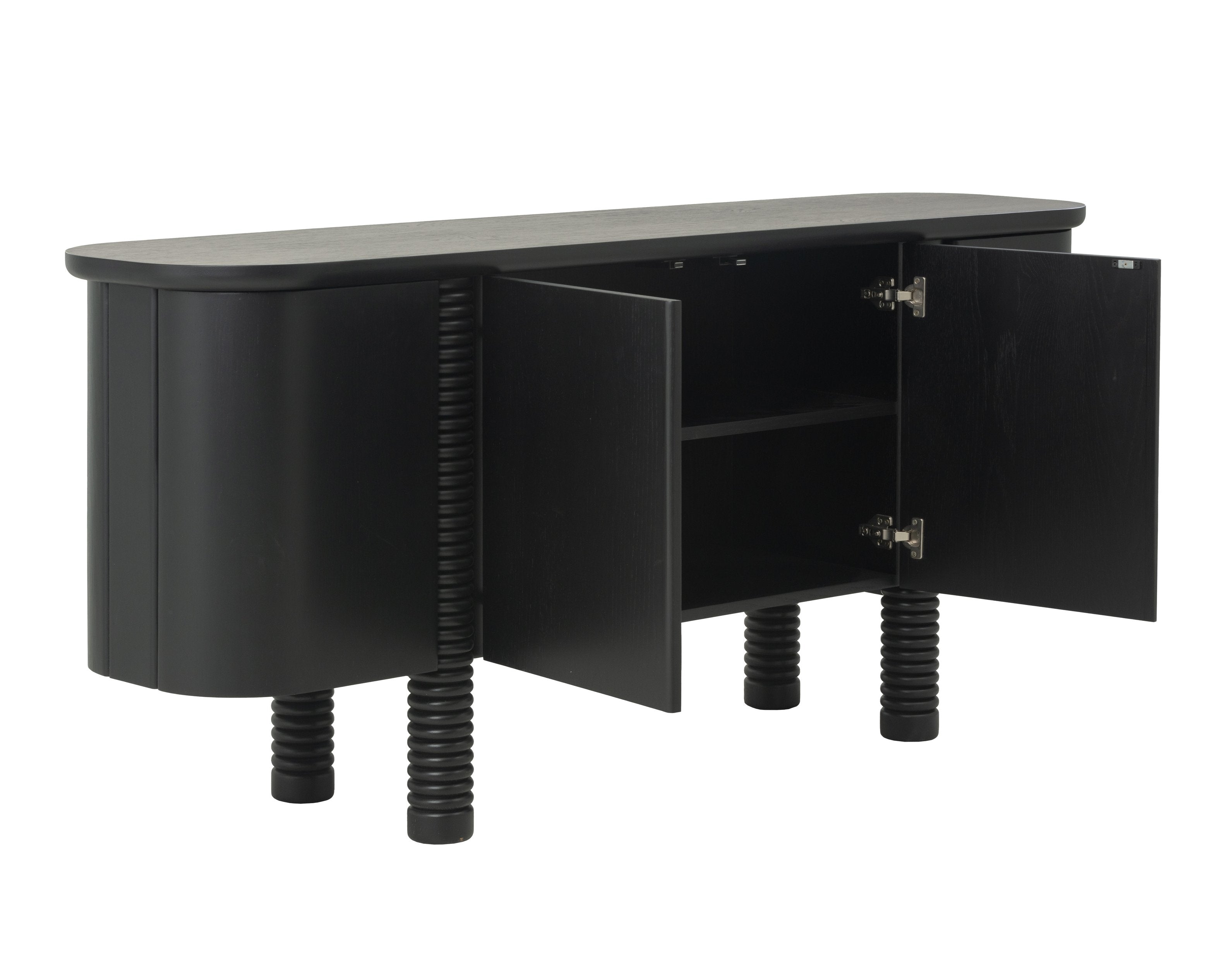 - Interior shelving provides generous storage space.