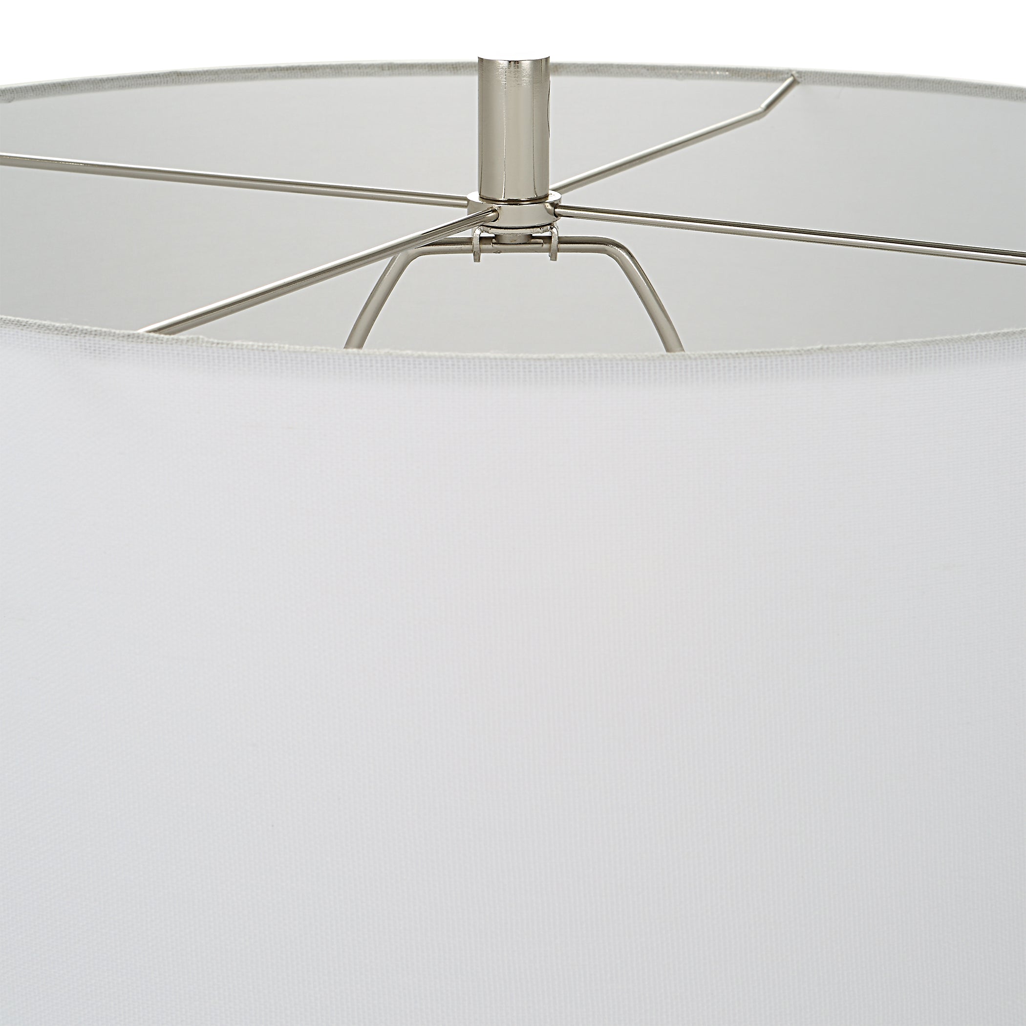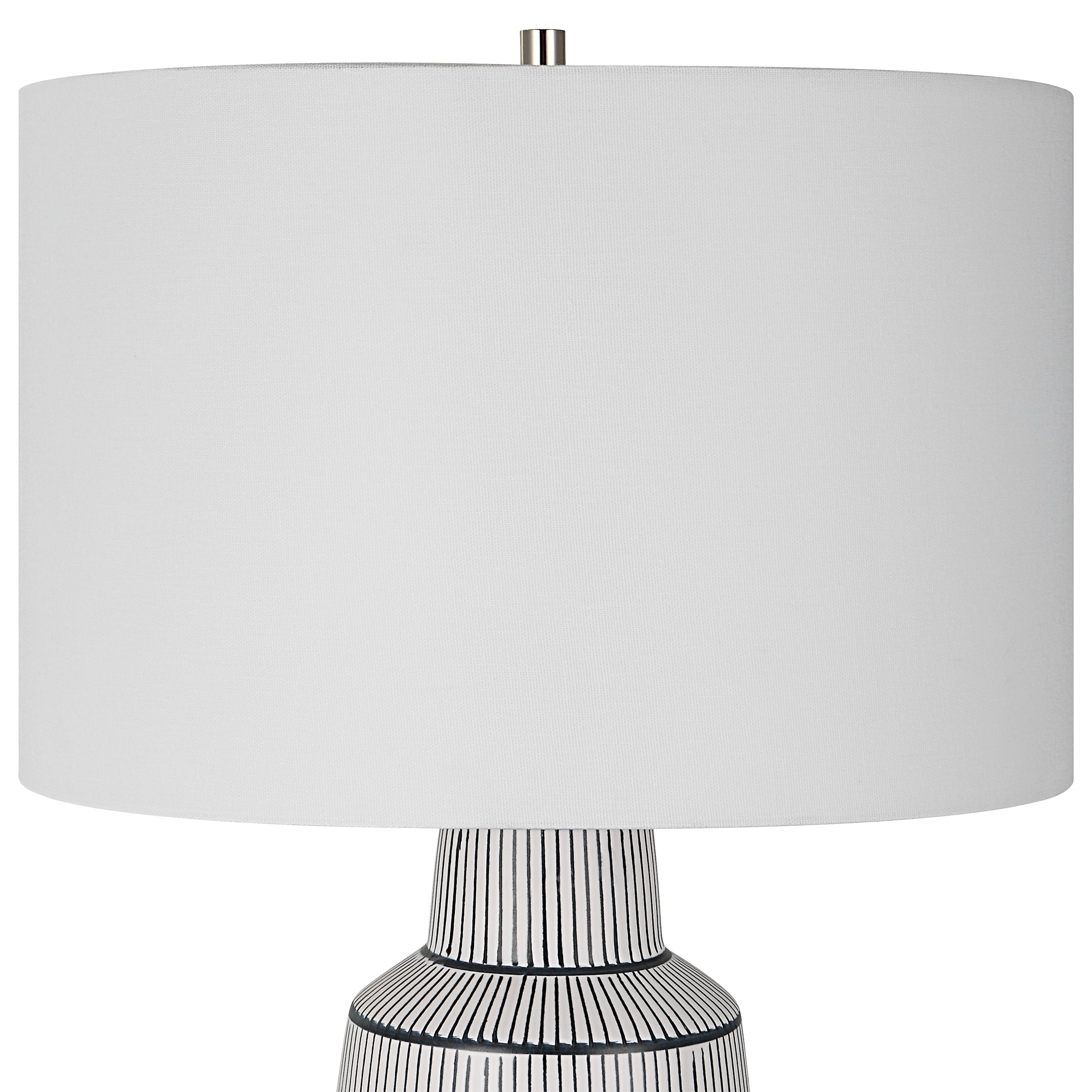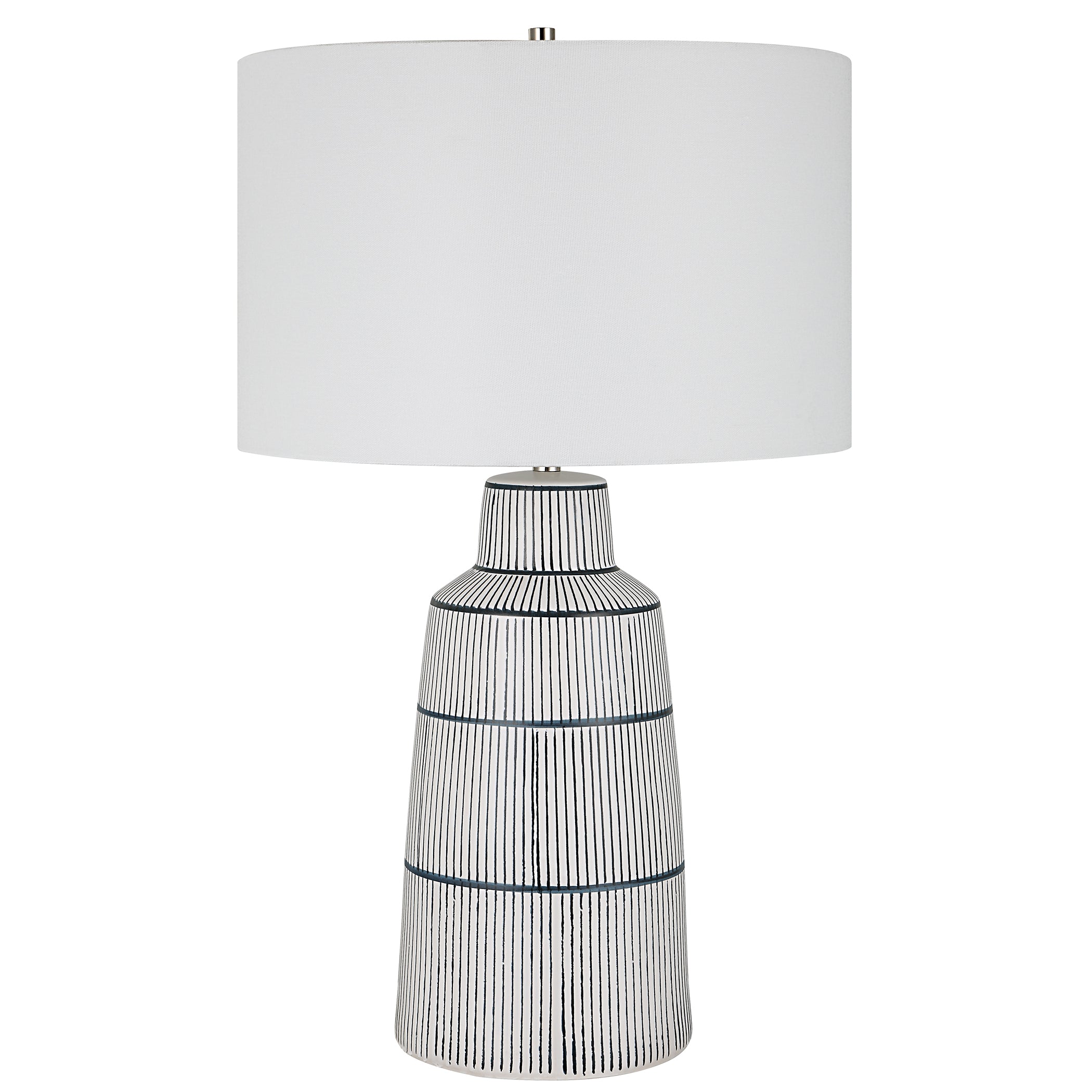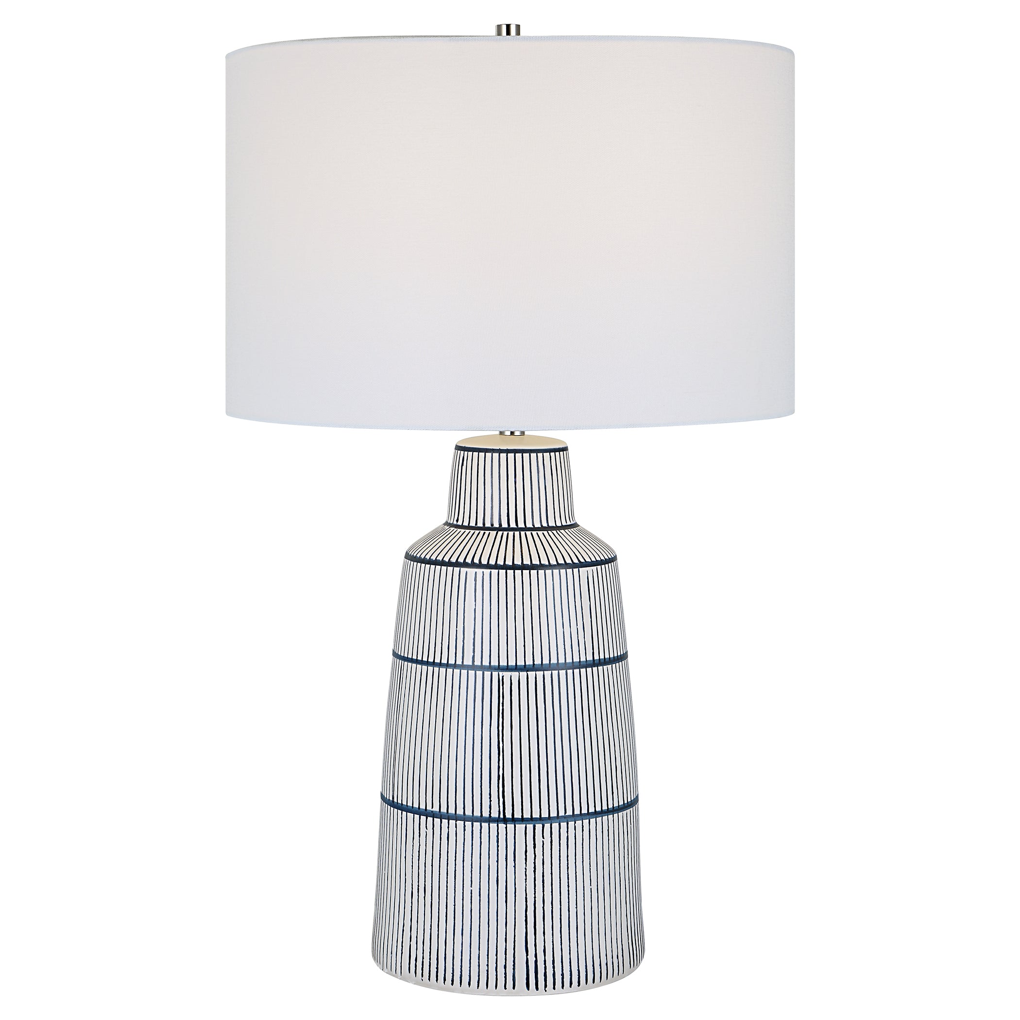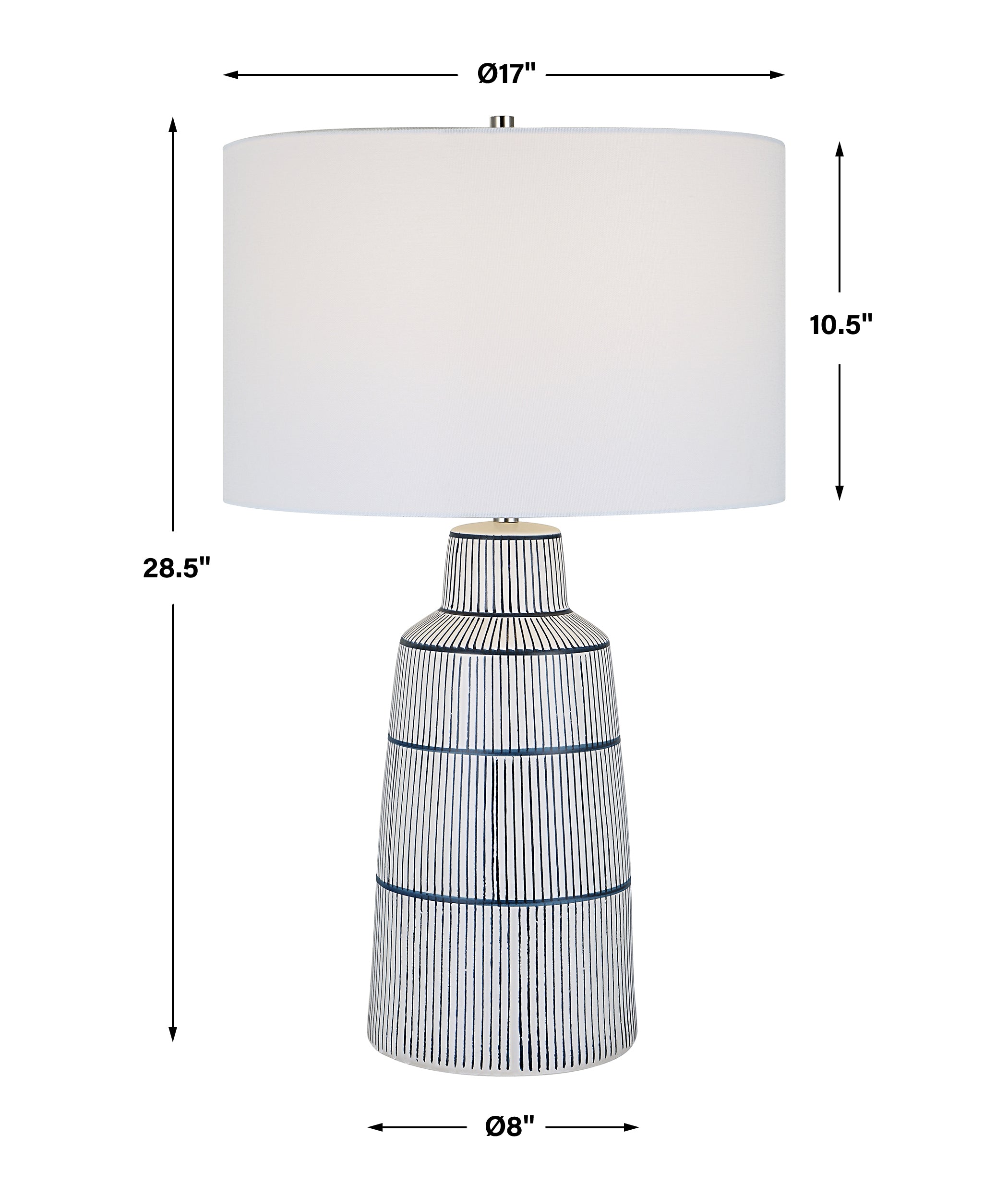 - Finish/Frame Description: Inspired By The Classic Nautical Stripe Knit, This Ceramic Table Lamp Sports A Satin White Glaze With Rich Navy Blue Stripes And Polished Nickel Plated Accents.