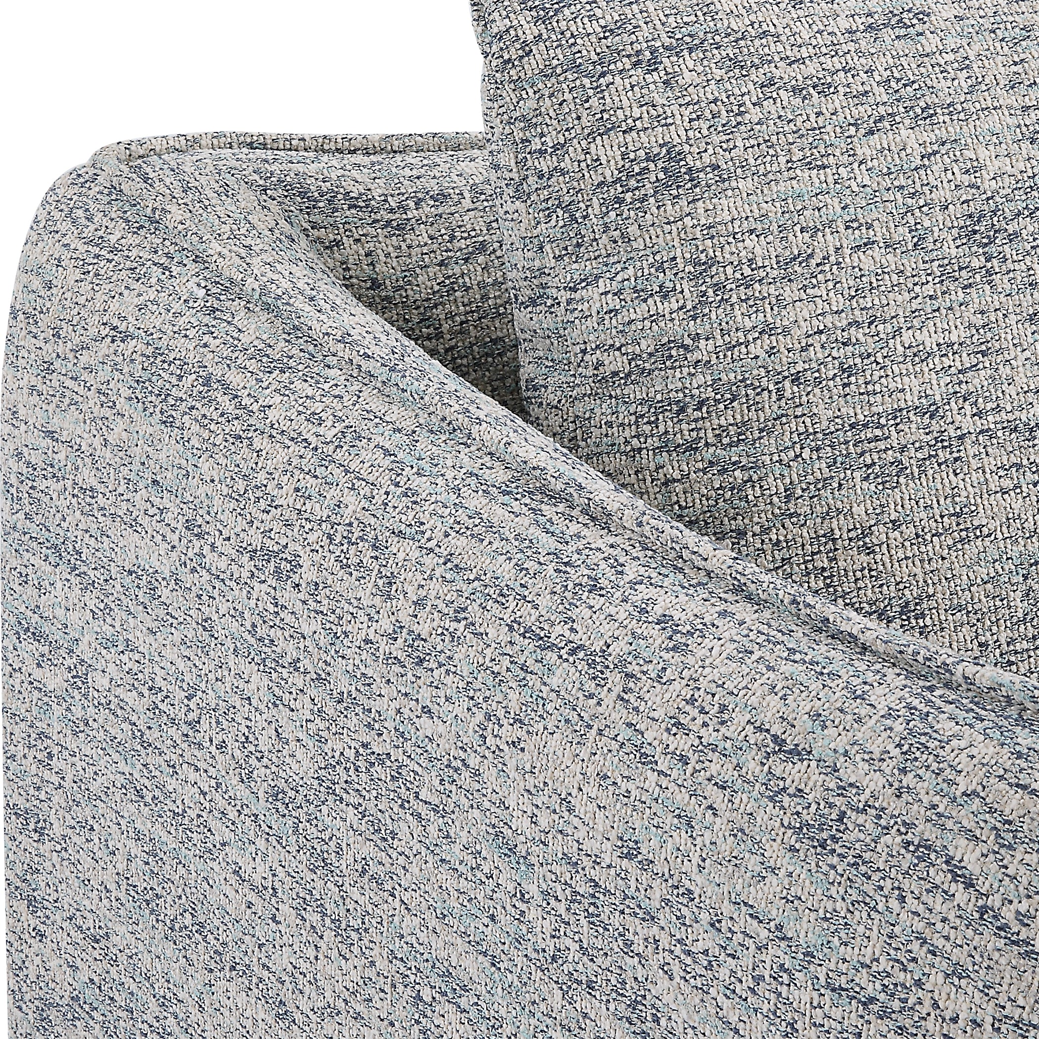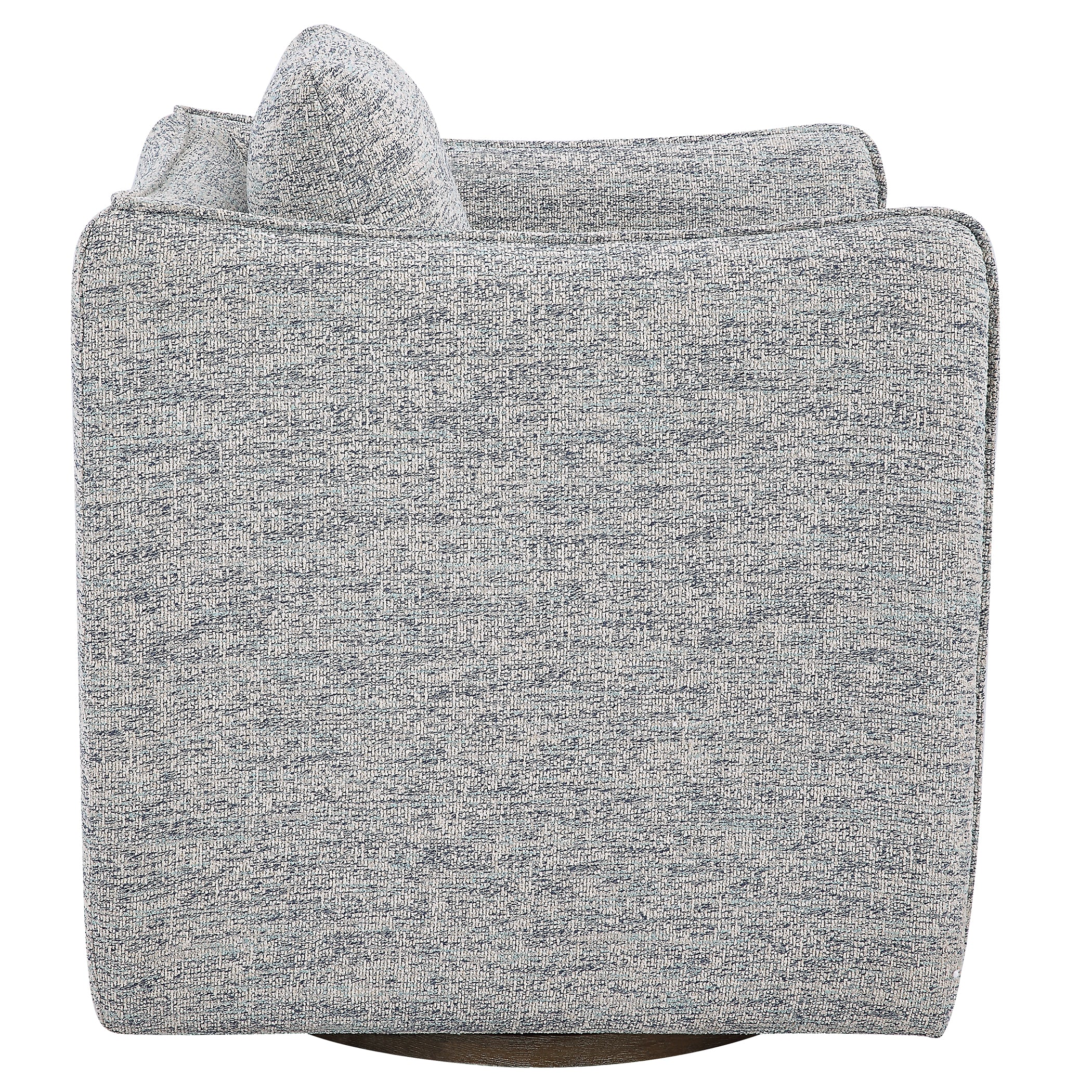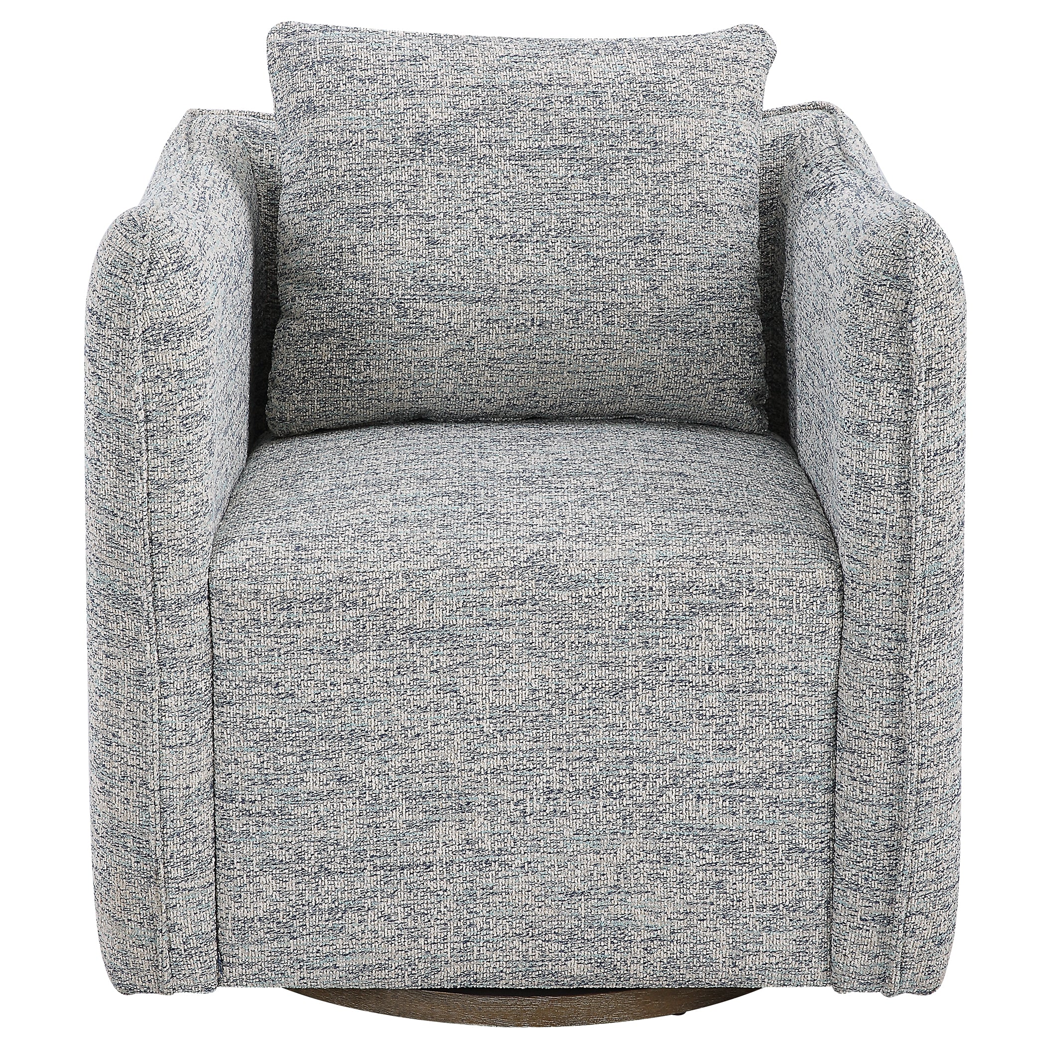 - Finish/Frame Description: Casual Shelter Arm Accent Chair Tailored In A Casual Blue And White Tweed Fabric. Features A Flanged Edge Trim Complete With A Loose Back Pillow. Rests On A Solid Birch Wood Swivel Base, Finished In A Weathered Gray Stain. Seat Height Is 19".