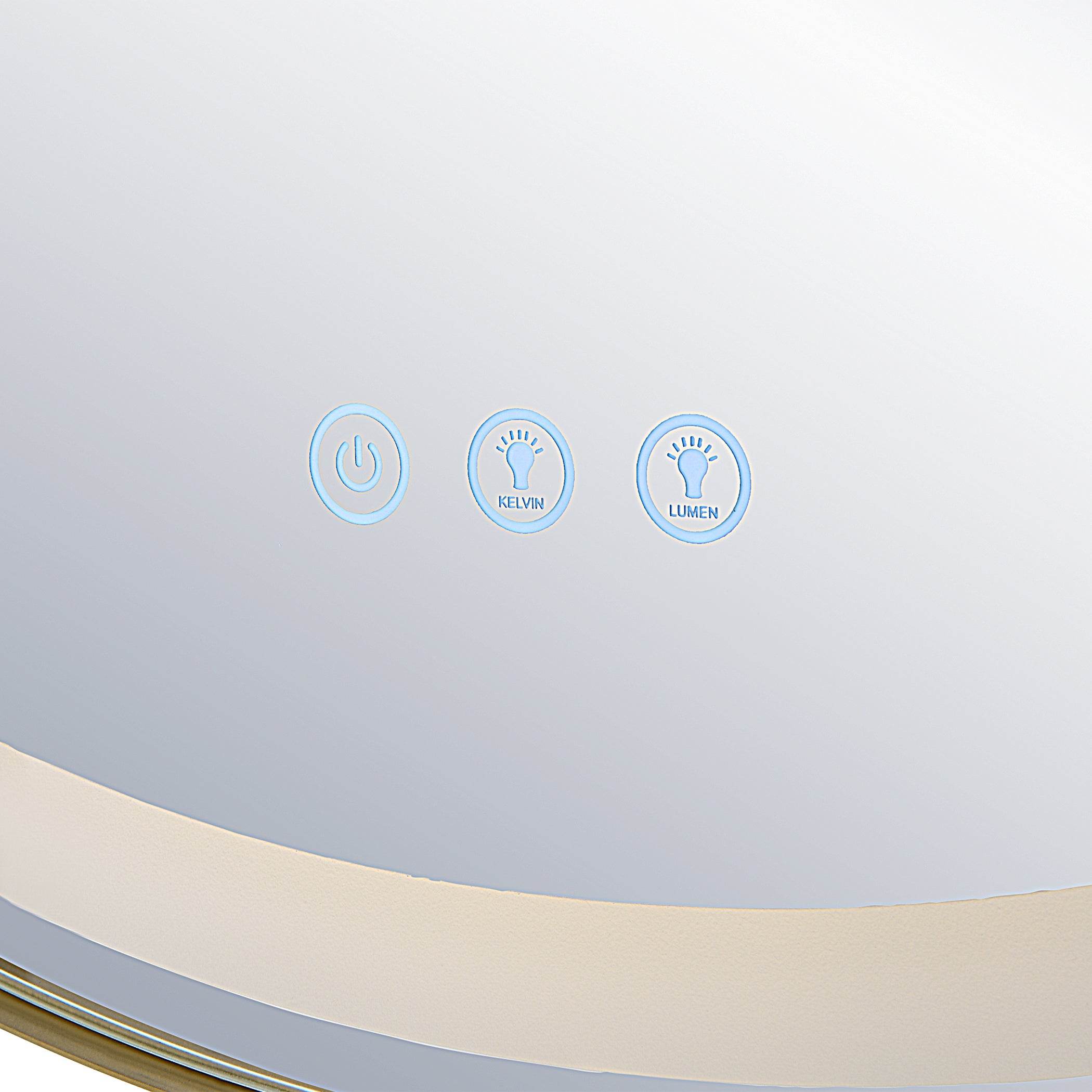 - Finish/Frame Description: Versatile In Design, This Round Mirror Has Integrated LED Lighting That Illuminates Through The Frosted Strip In The Polished Edged Mirror. The Plated Brushed Brass Stainless Steel Frame Is Off Set From The Wall To Allow Ambient Lighting From The Back. Easy To Use Touch Buttons Are Featured On The Bottom Right Of The Mirror With An On Off Function, Touch And Hold Kelvin Control From 2700k To 4000k, And Touch And Hold Brightness Control. LED Lights Rated At 40,000 Hours. Ships With Plug, But Can Be Hardwired Professionally. Touch Screen Icons Continue To Illuminate When Powered Off For Easy Navigation In Dark Settings.
