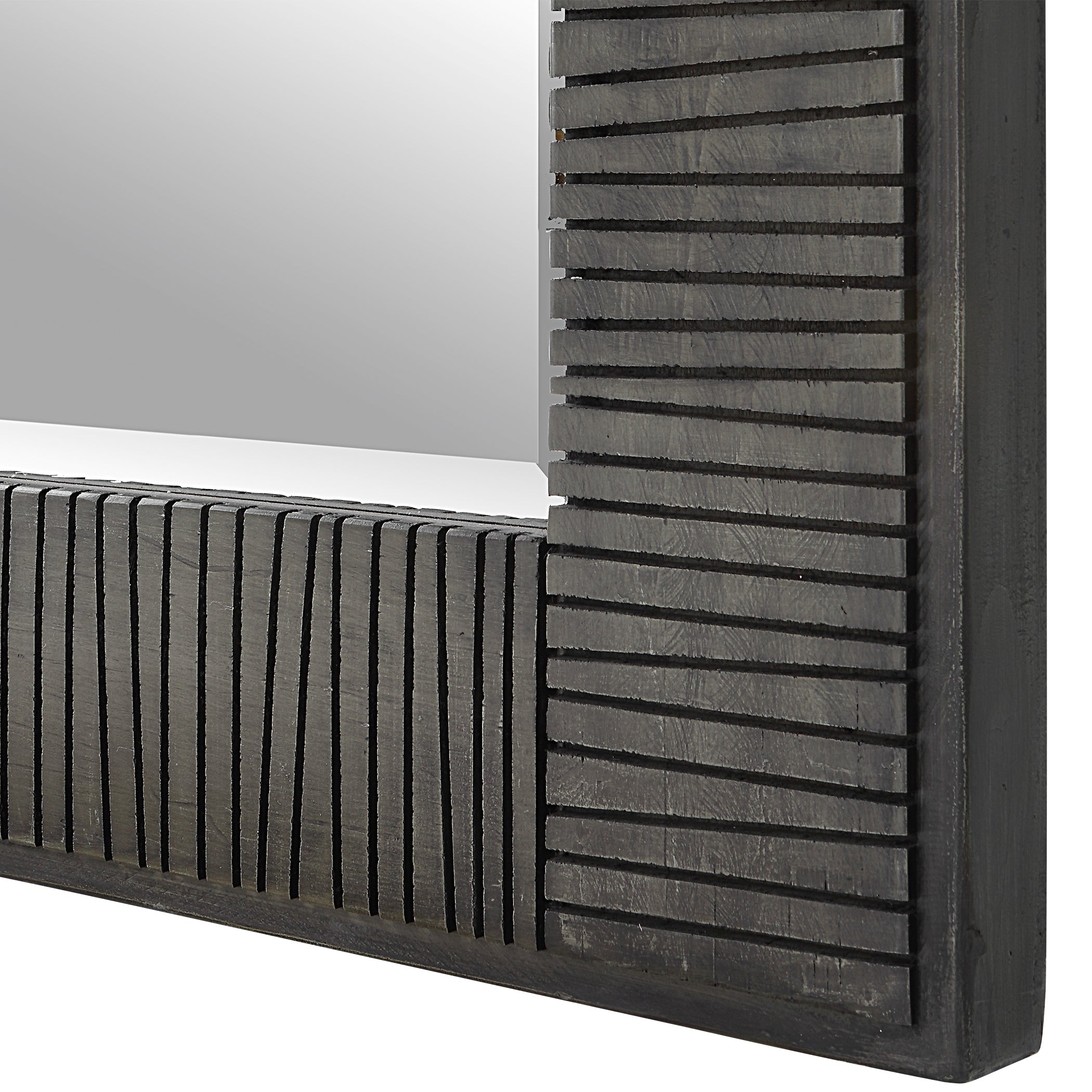 - Finish/Frame Description: This Oversized Mirror Features A Solid Wood Frame With Hand Carved Channels Finished In A Rustic Wood Tone With An Aged Gray Wash. Mirror Has A Generous 1 1/4" Bevel And May Be Hung Horizontal Or Vertical.