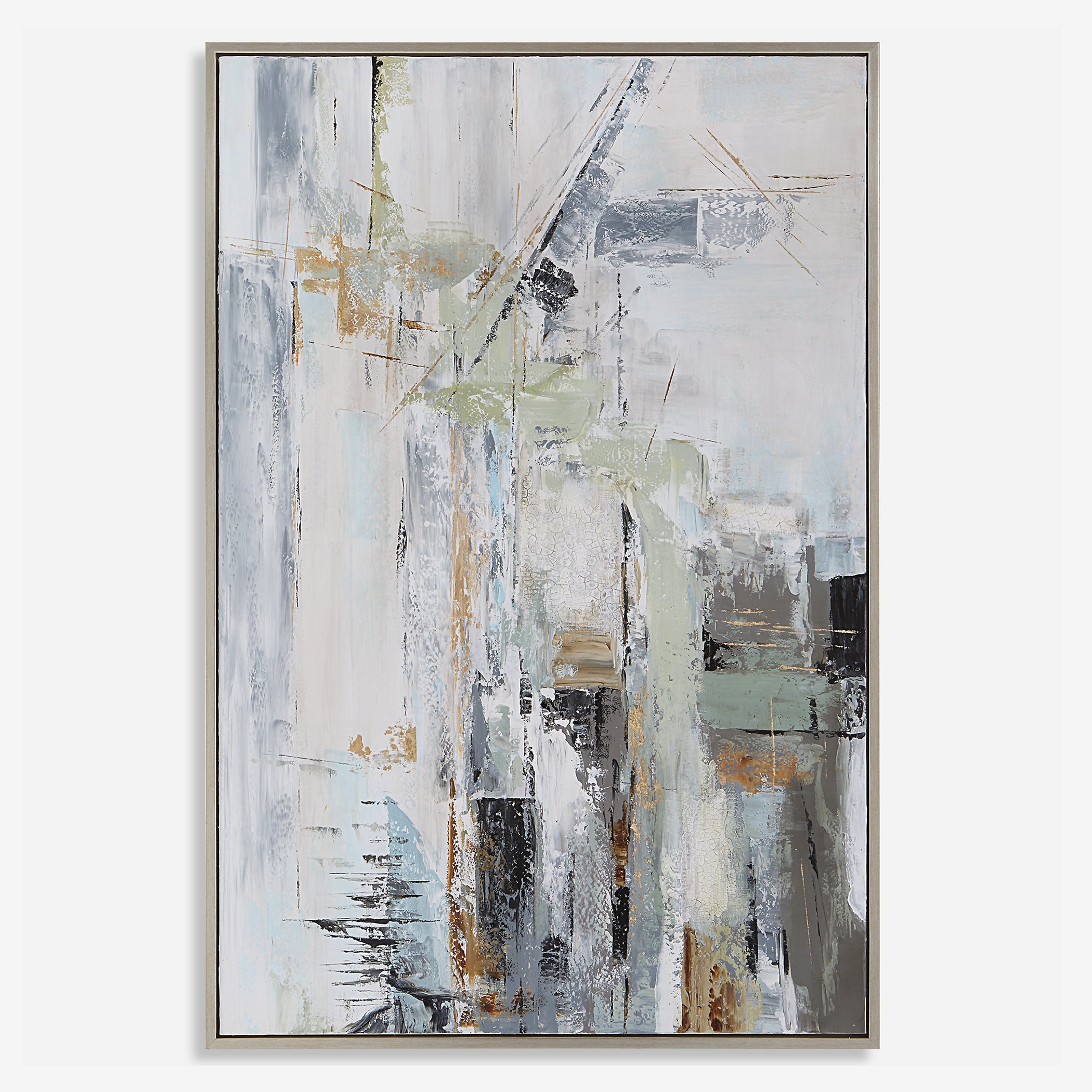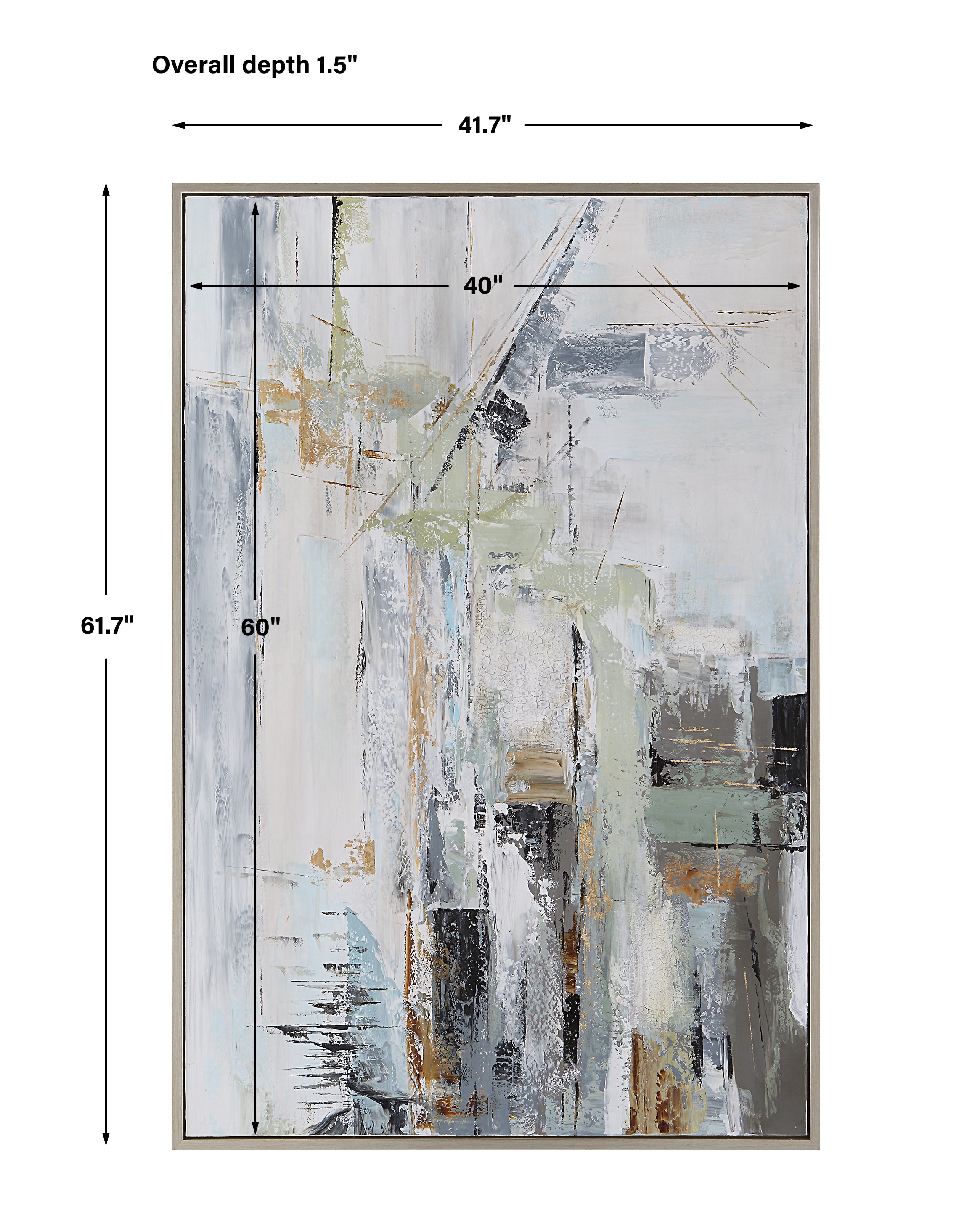 - Finish/Frame Description: Hand Painting, Silver Gallery Frame, Blues, Greens, White, Gray, Black, Abstract, Modern
