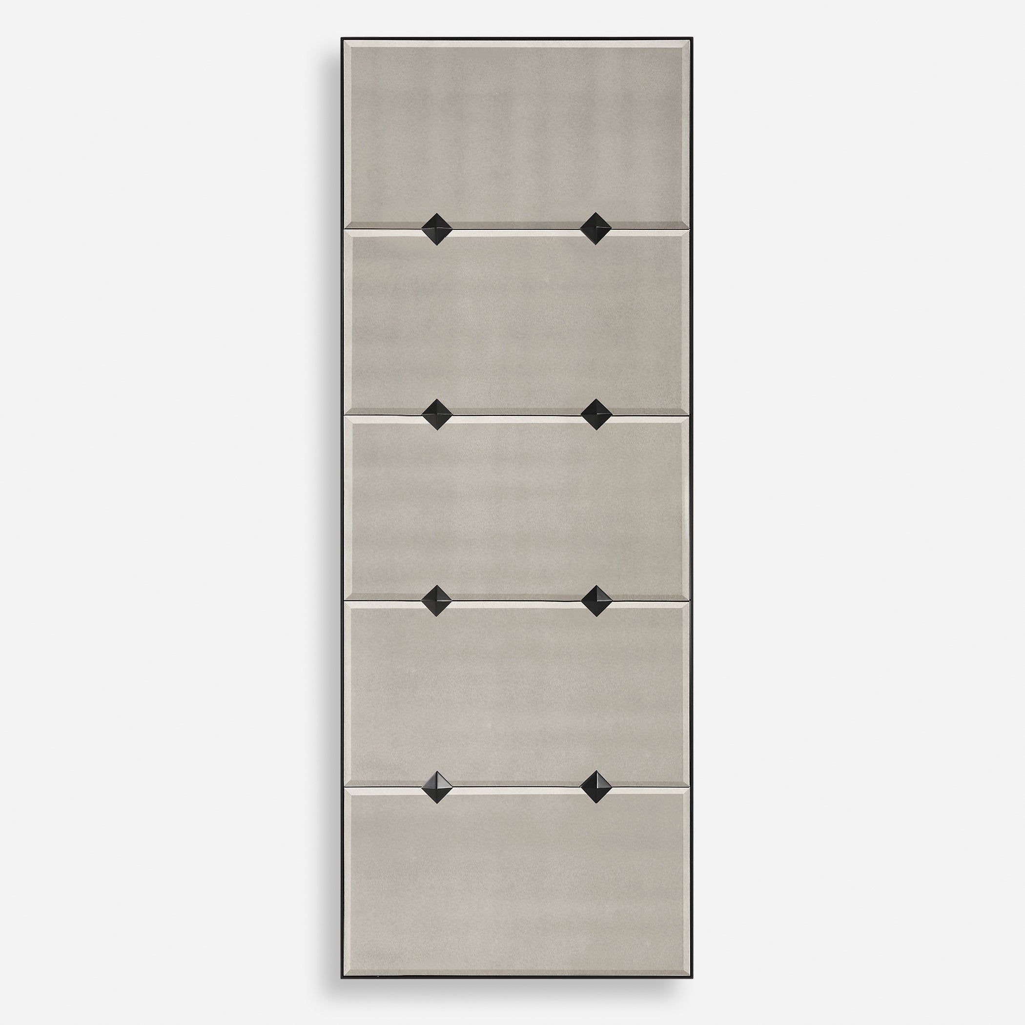- Finish/Frame Description: This Oversized Mirror Features Antique Style Mirrors With A Petite Bevel For An Updated Traditional Appeal Surrounded By A Slim Black Iron Frame Accented With Matching Metal Studded Medallions. May Be Hung Horizontal Or Vertical.