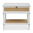 - This Side Table, Crafted From Mindi Wood In A White Finish, Showcases Natural Rattan Cane Webbing On The Drawer Front And Lower Shelf. It Is Beautifully Accented With Bronze Hardware, Adding A Touch Of Contemporary Elegance To Its Design.
